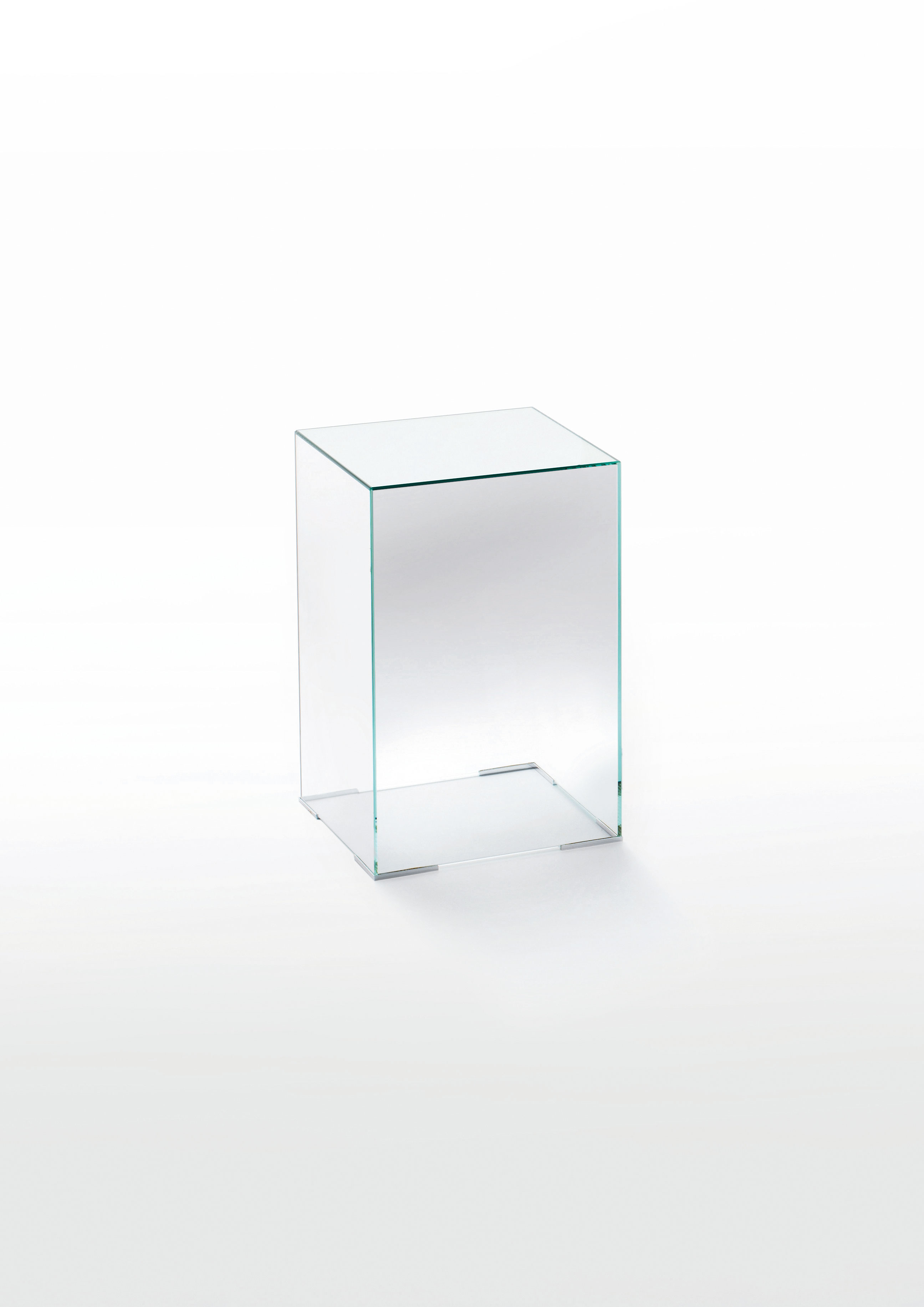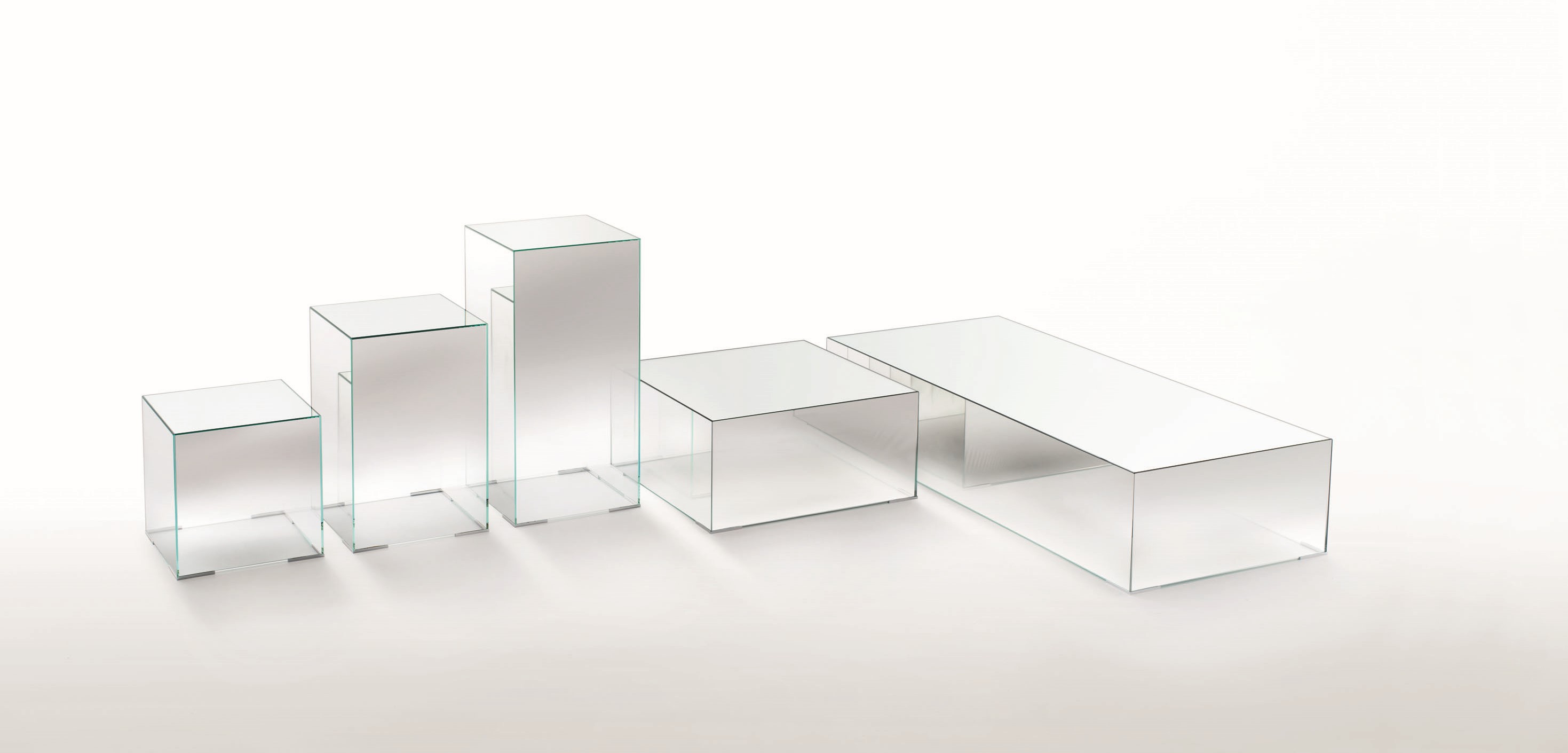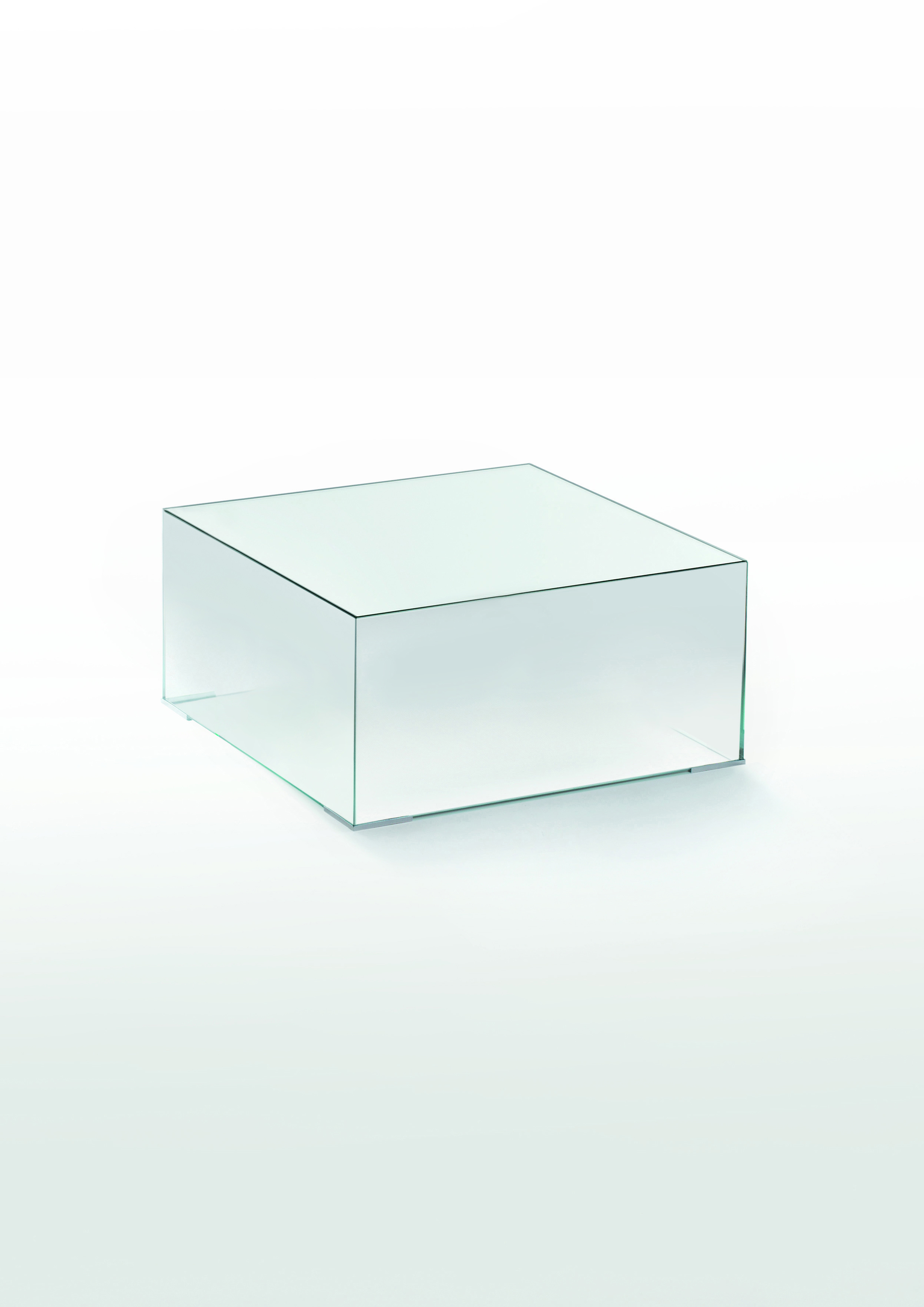 Introducing our line of low tables in the shape of a parallelepiped, with mirrored tops and progressively shaded mirror sides. These tables create an amazing visual effect because they are made of extra light glass that is seamlessly bonded at a 45° angle. These sleek and contemporary pieces gain depth and intrigue from the captivating play of reflections created by the mirrored top and shaded sides.
