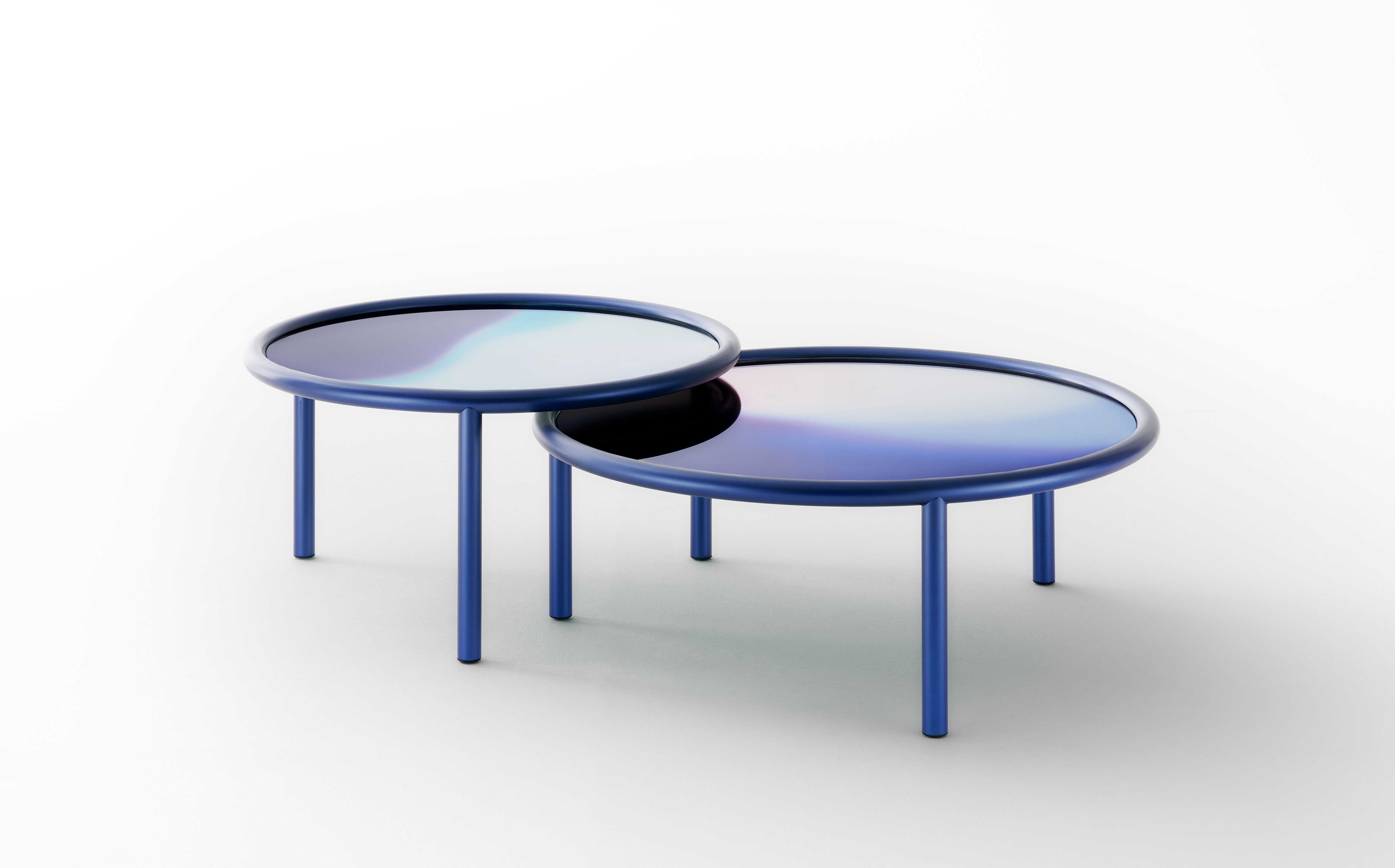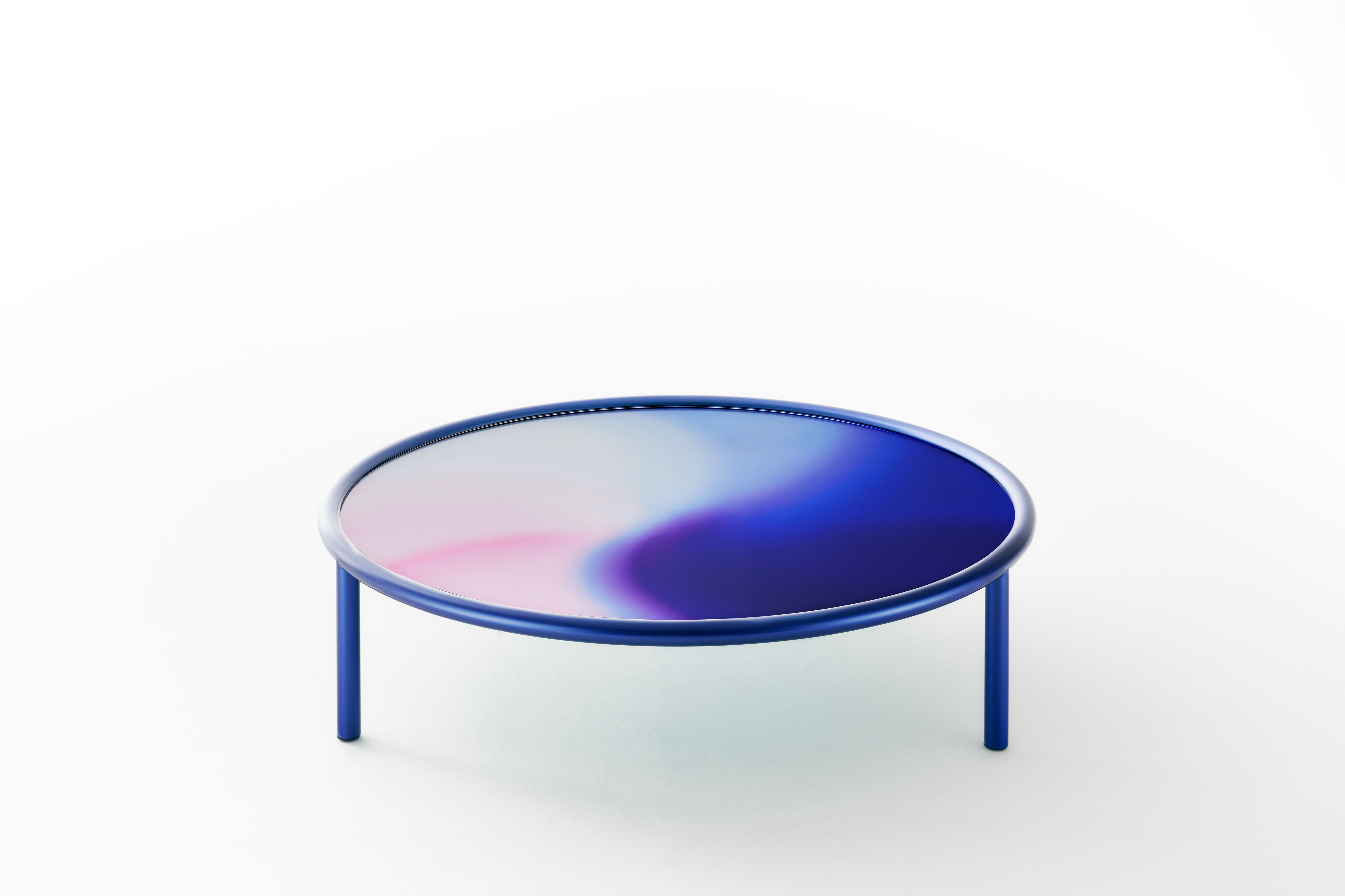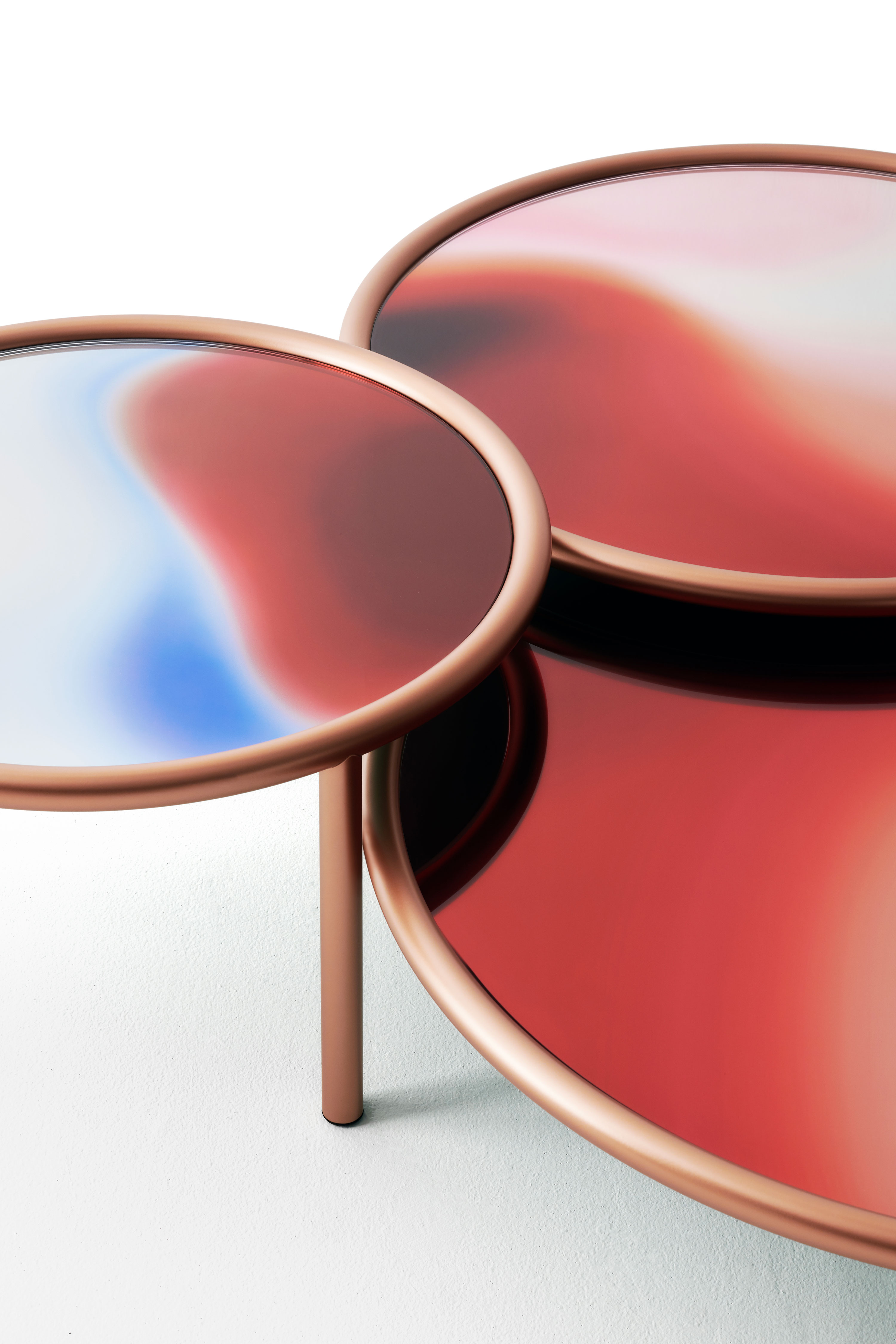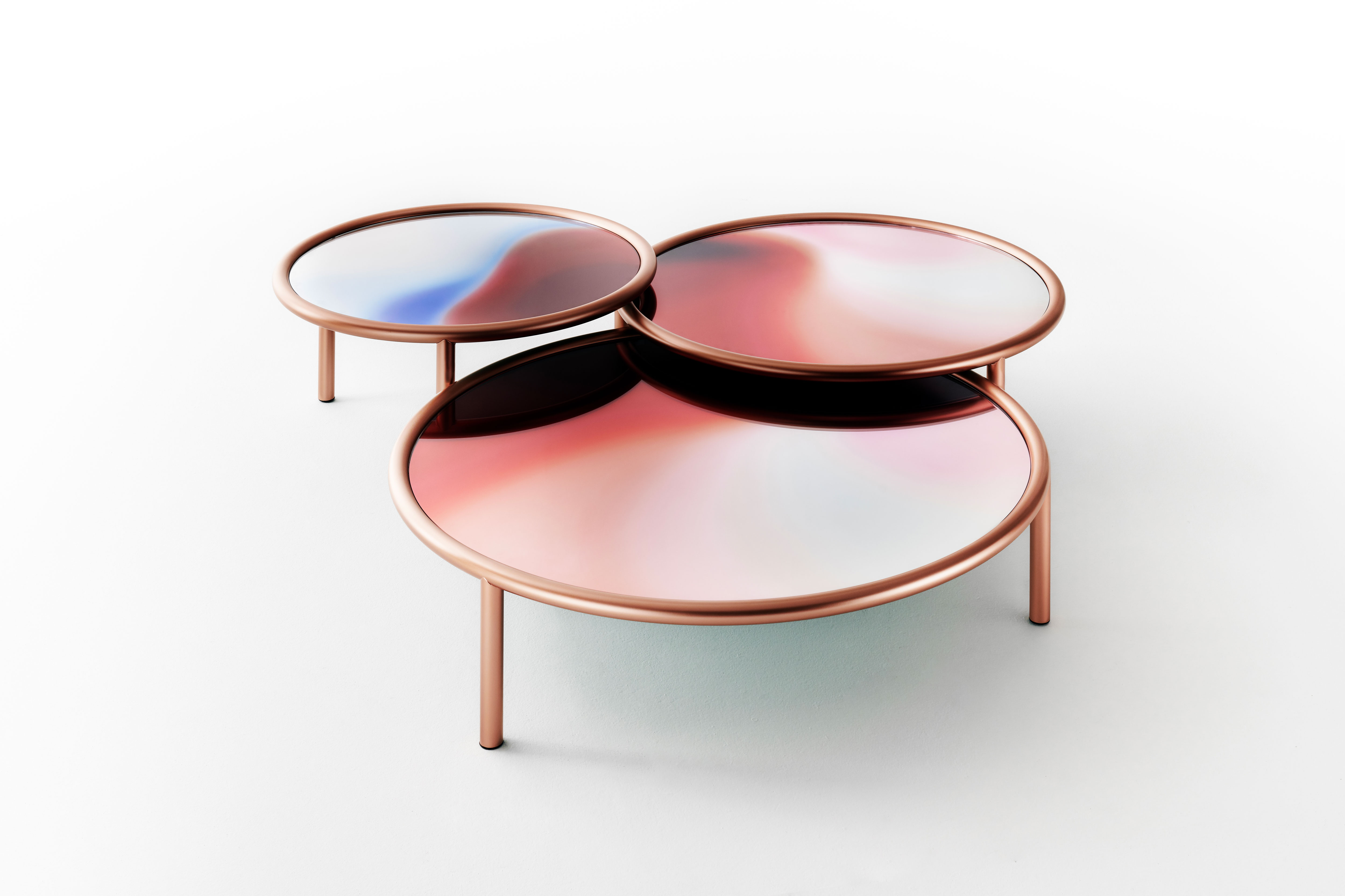 Look through our selection of low round tables with tubular metal frames that are finished with an opaque metallic treatment and come in copper or midnight blue. The mirrored background and captivating colour palette of the laminated glass tops give the impression of gases or fluids blending and intertwining, making the solid state of the material less clear. The mirrored backdrop gives these colour tones a special brightness and energy, giving your room more depth and vitality.