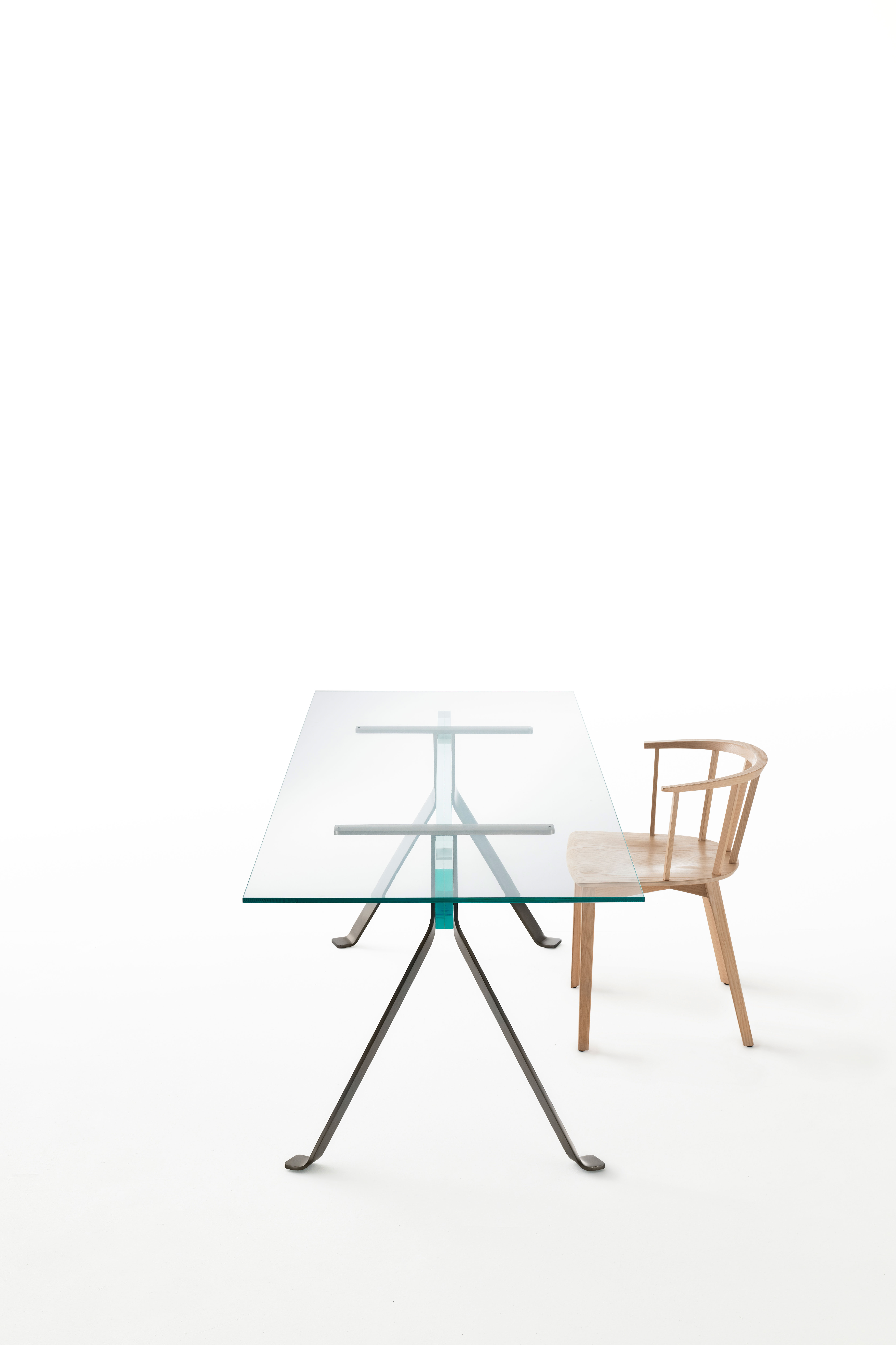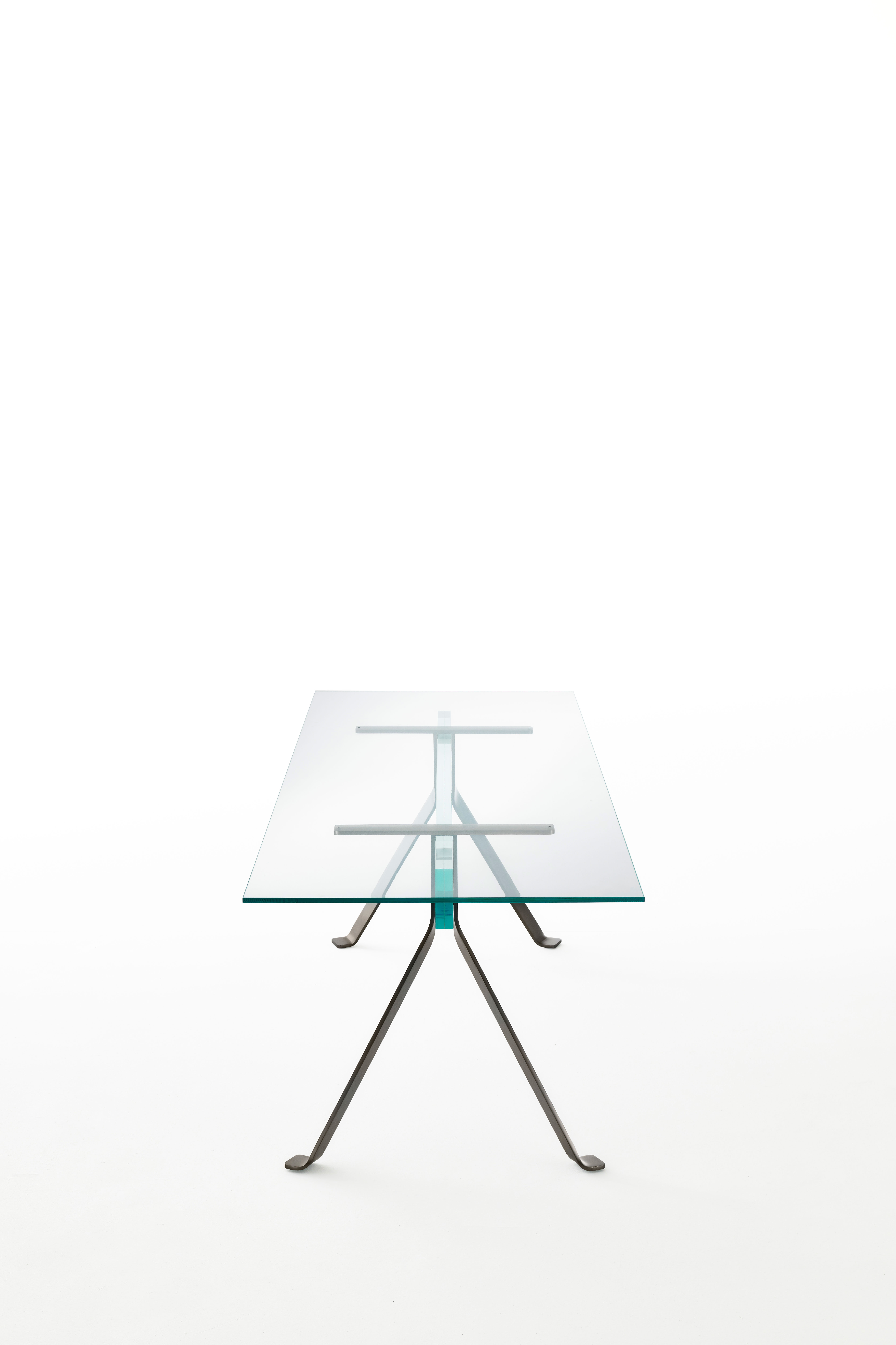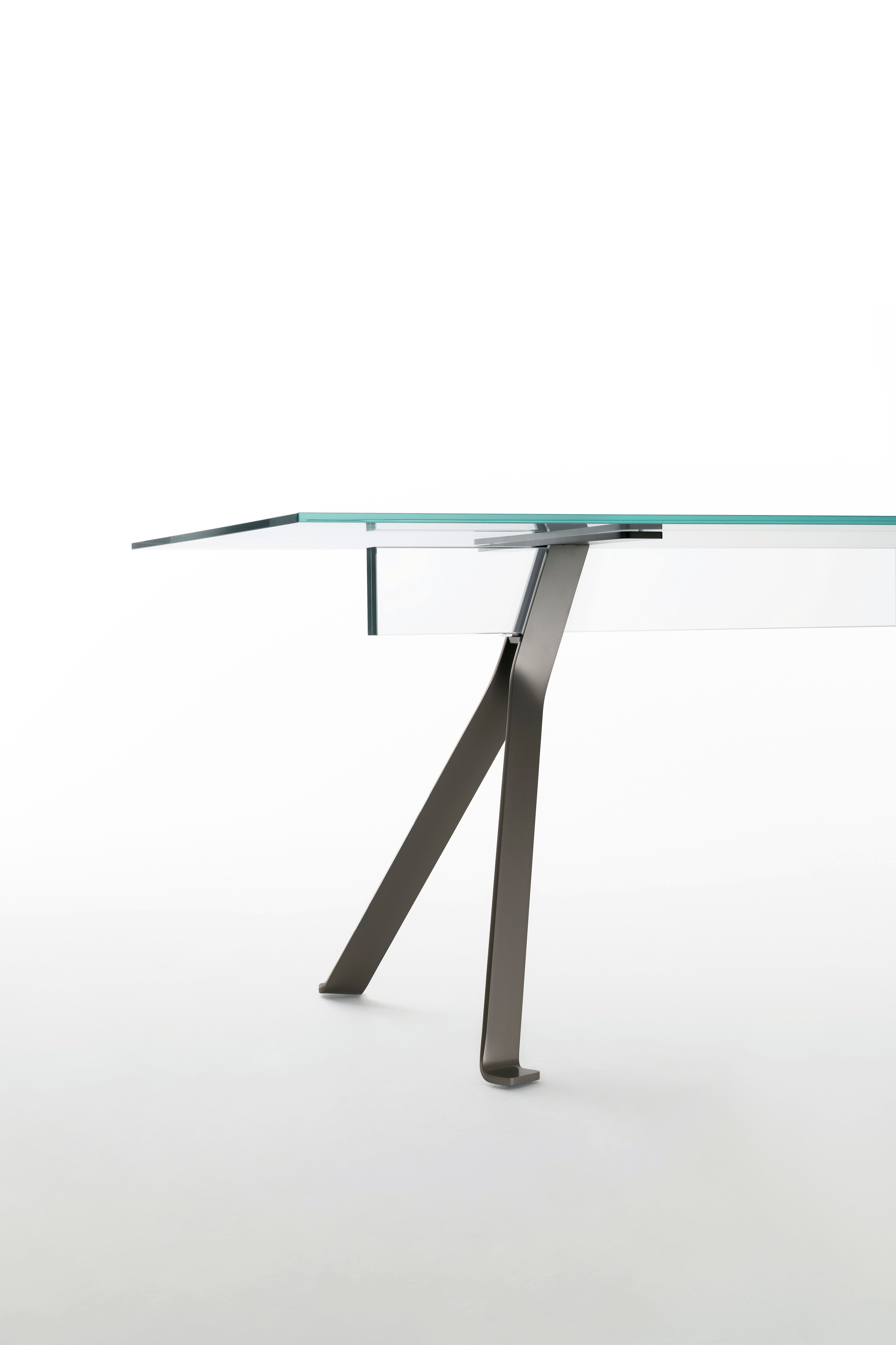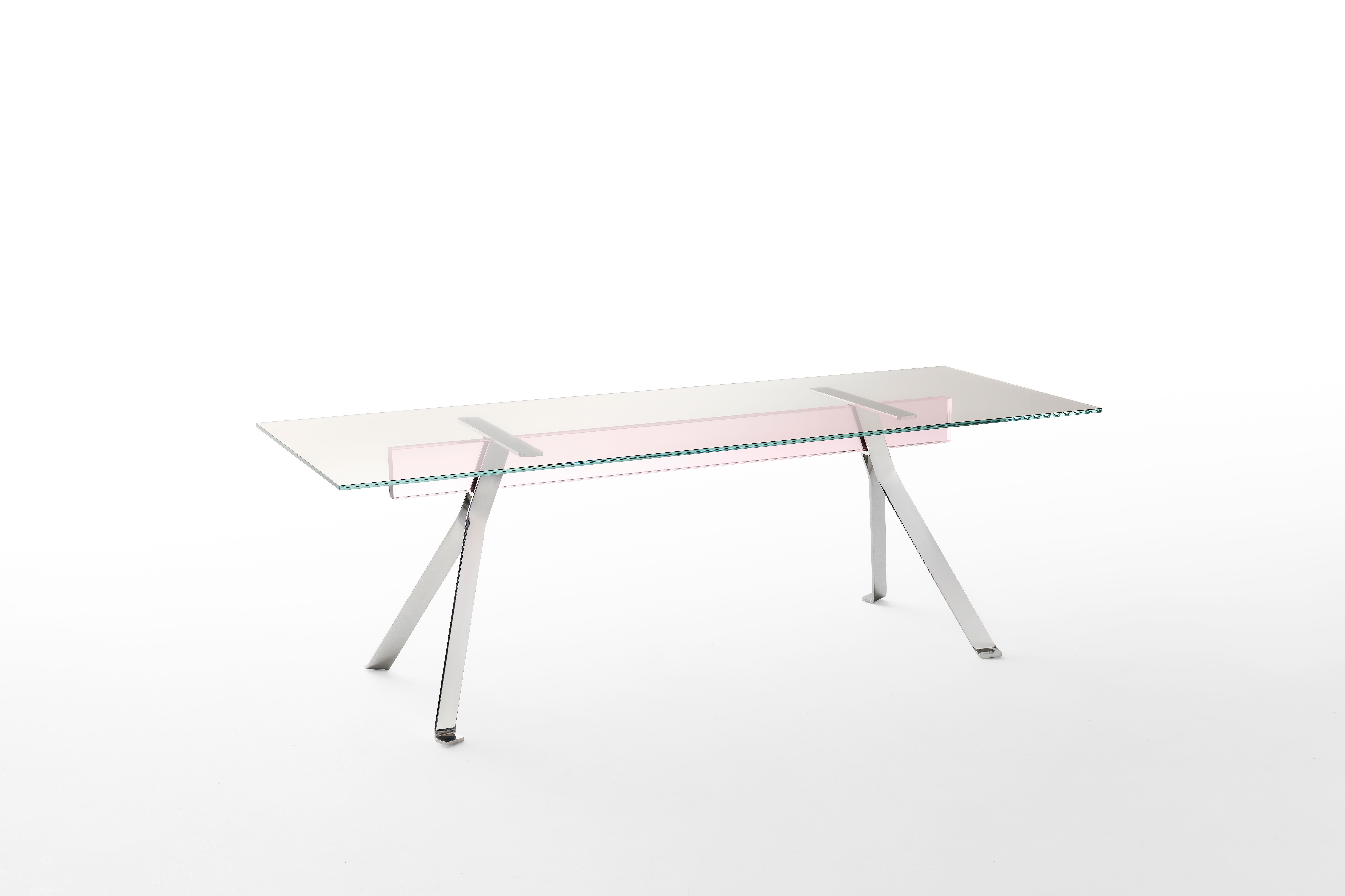 Introducing our line of rectangular dining tables, which feature a top made of extra light, tempered, transparent glass measuring 12 mm. An alternative is a 6+6mm laminated glass top in one of three transparent, eye-catching colours: light pink, light grey, or light yellow. Two trestles, available in satin bronze or mirror-polished stainless steel, make up the base. A beam of 19+19mm laminated extra light glass, available in neutral transparent finish or matching the distinctive transparent colours available for the tabletop, connects these trestles.