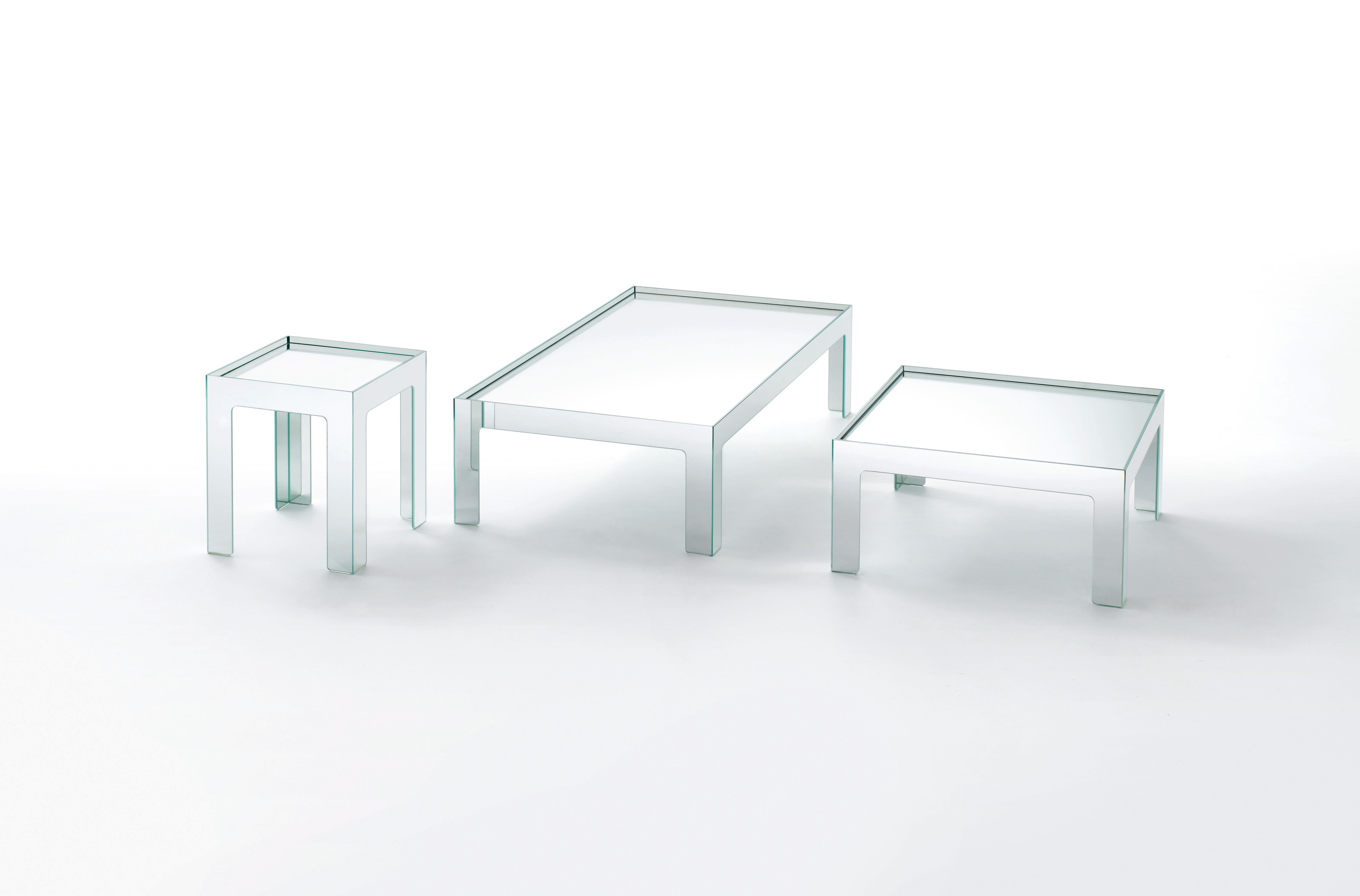 Our selection includes small tables and consoles with bases made by bonding laminated double-faced mirror slabs with a 45° water jet cut. The mirror top in the low tables is contained by an upstand profile and is situated lower within the base frame. On the other hand, the consoles feature a unique design approach where the top rests directly on the base frame.