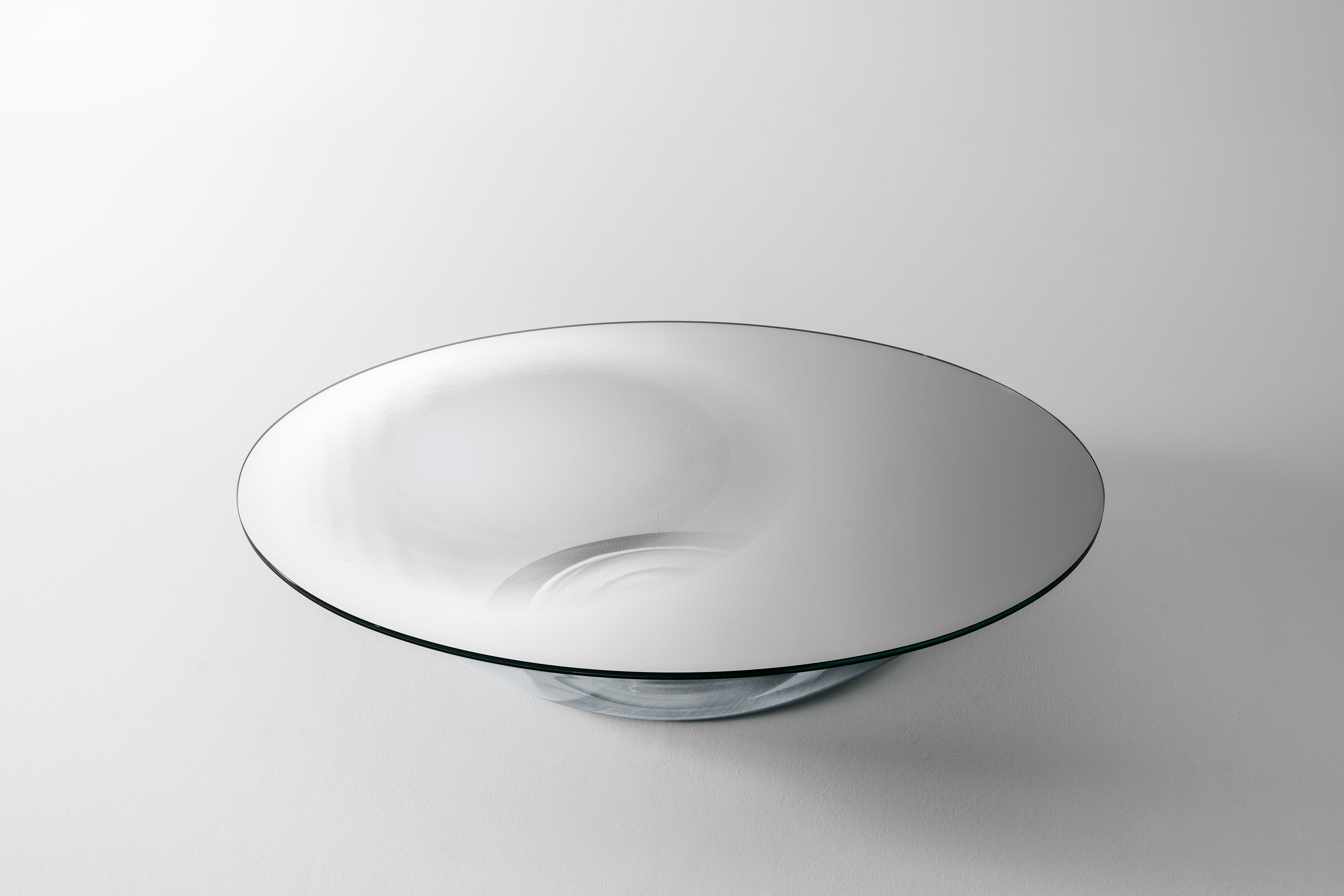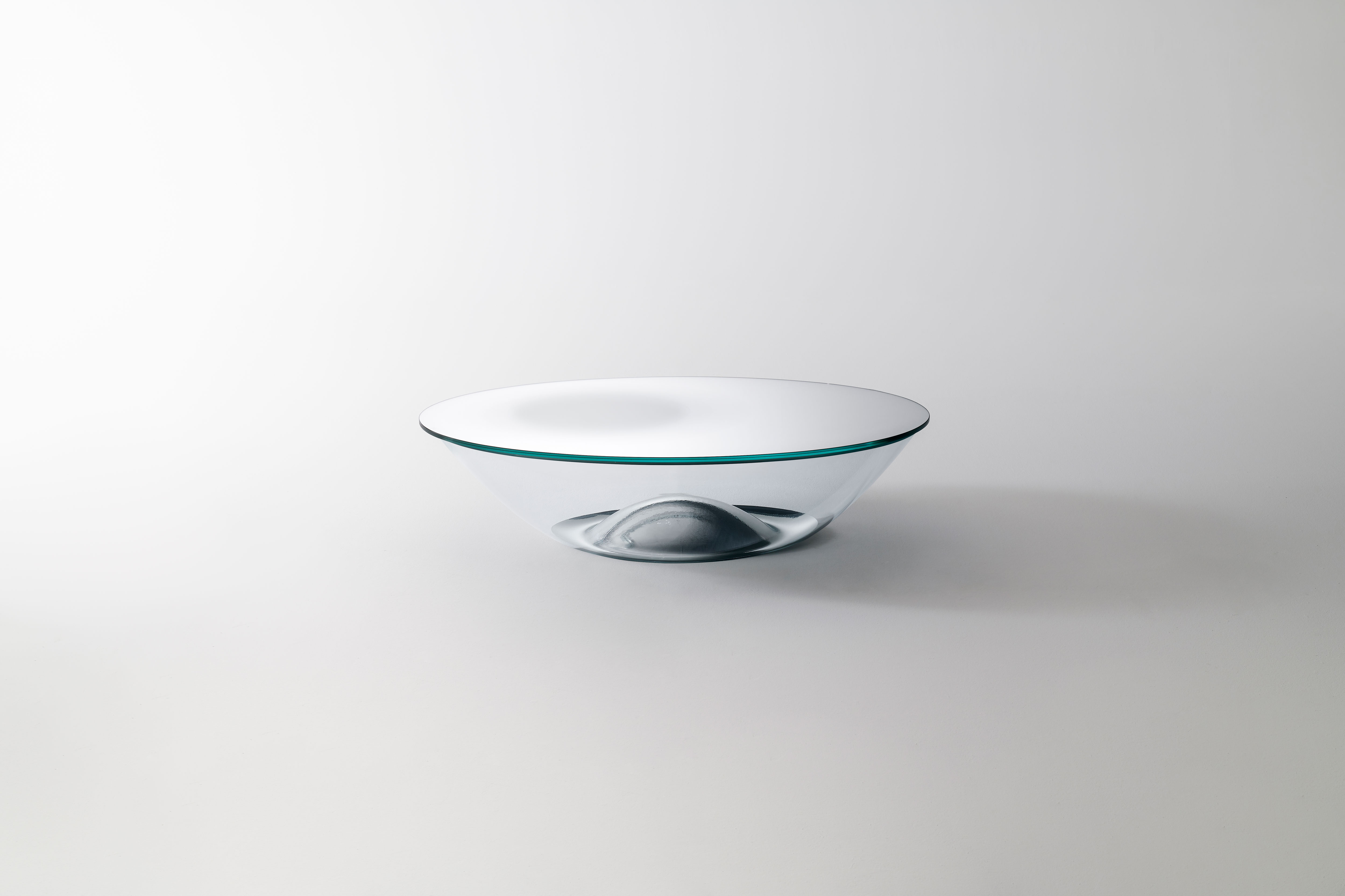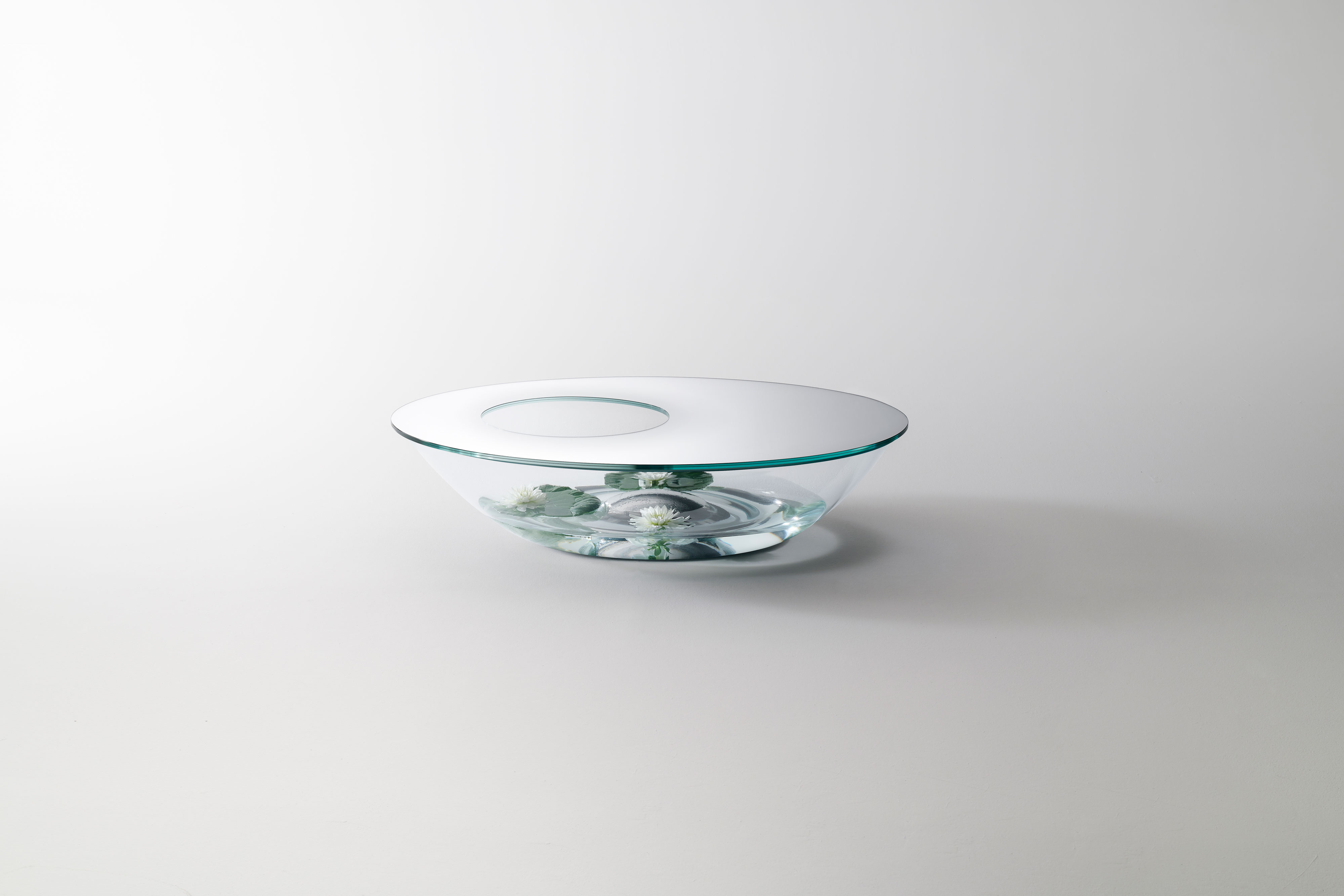 Nacre mimics the supple, natural lines of an oyster shell, perfectly capturing the essence of a low table. Its base is an oval basin made of transparent extra light glass with a mirrored bottom that is formed by carefully shaping the perimeter of a 12mm glass slab that has been carefully moulded using an advanced heat treatment technique. The transparent circular area below is highlighted by the 6+6mm laminated glass in an extra light mirror finish on the top, which is resting atop this basin and gradually fading in a circular pattern. Furthermore, the top may have a hole next to the transparent part that opens to the interior of the basin. This adaptable element turns the area into a useful storage/display unit, terrarium, or flower box.