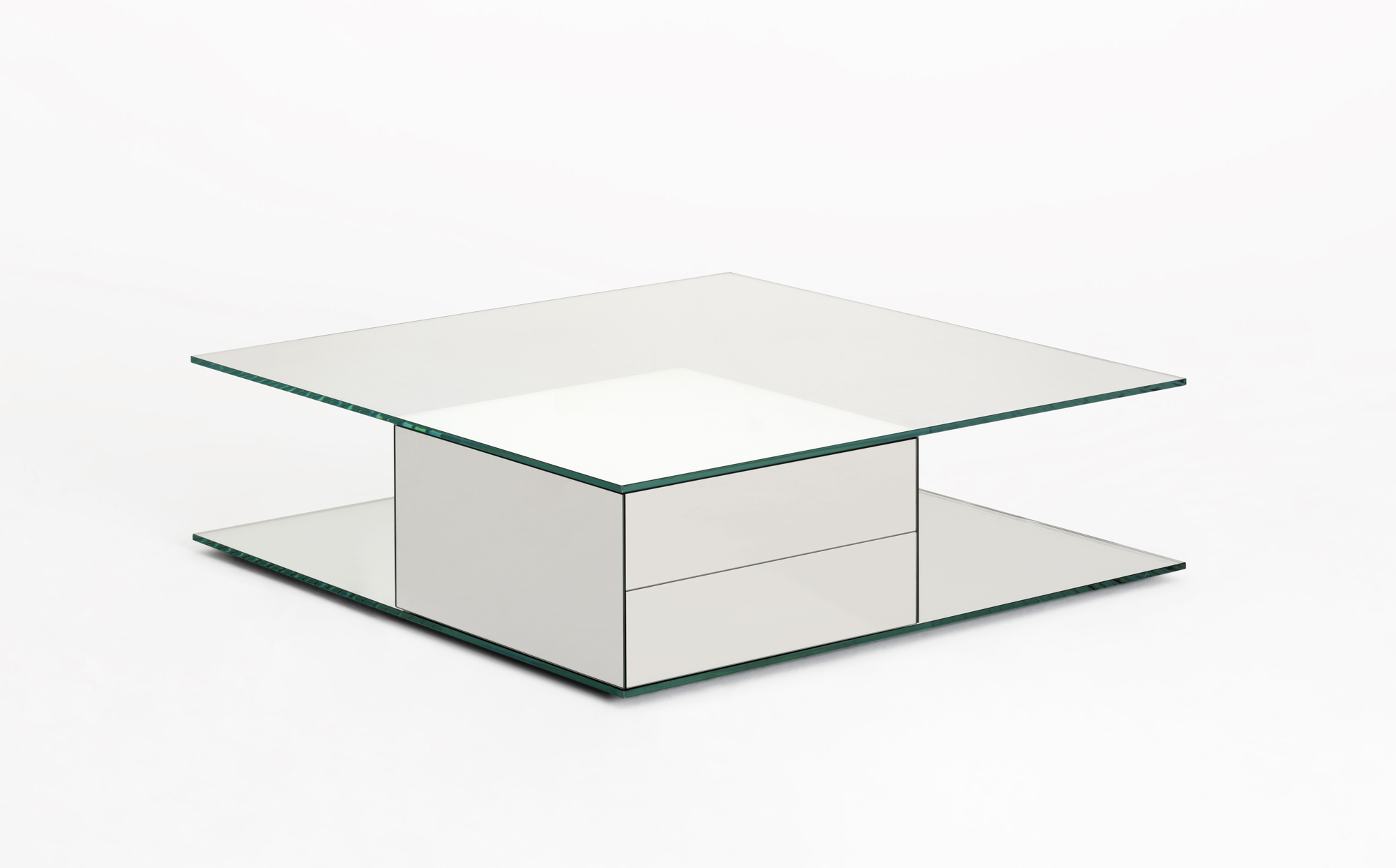 Low table with top and base in extra clear tempered 12 mm glass. The cantilevered top is supported by a drawer unit with push-pull blumotion opening drawers, covered with mirror joined at 45°. The base is completely mirrored, whilst the top is mirrored only where the drawer unit is located and remains transparent in the protruding part. A solid fixing system creates the stability and allows movement of the different elements.