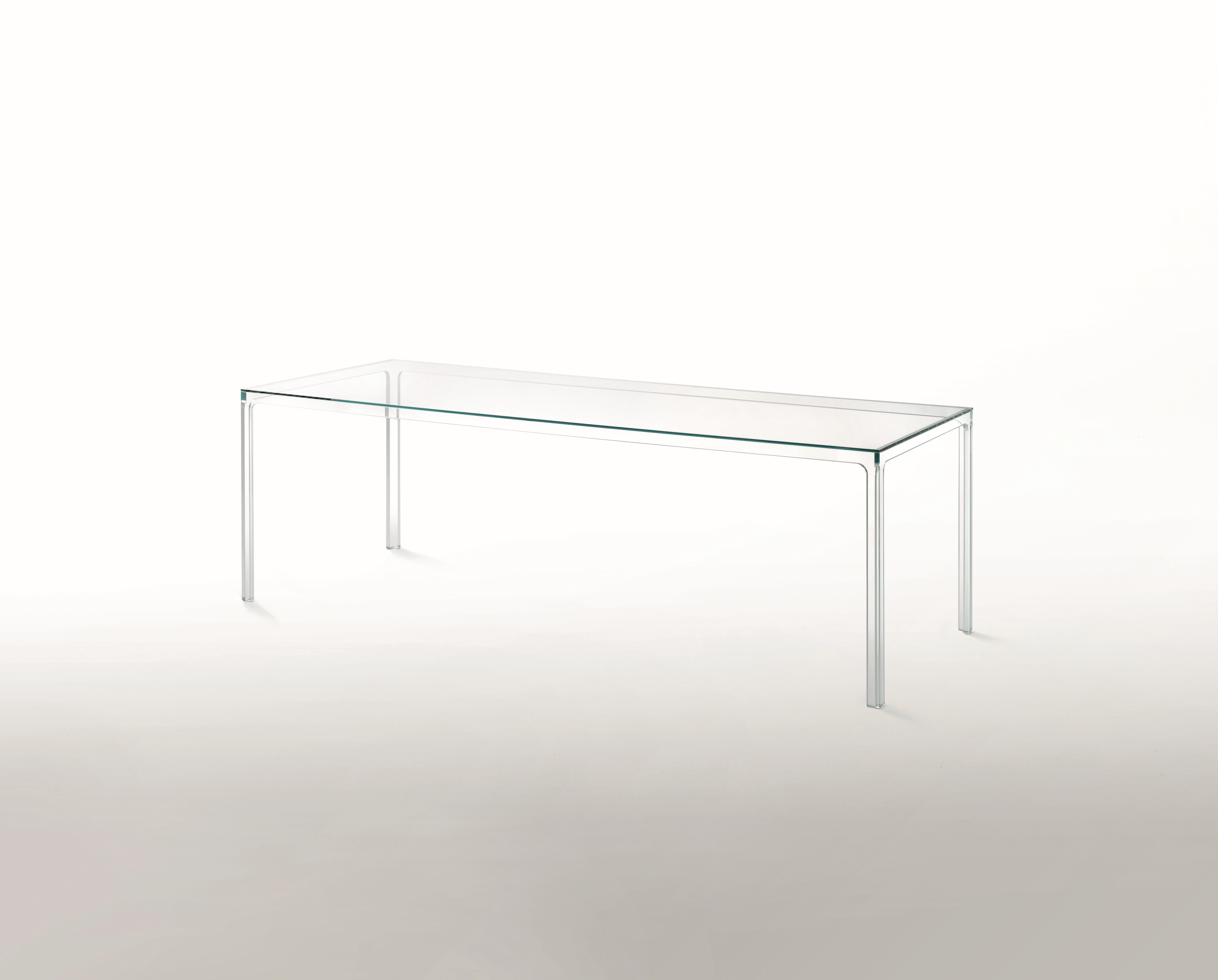 This table is made of transparent extra light glass, which is known for its lightness and clean design. Despite its delicate appearance, the slender base is actually solid and resistant, thanks to a special glass treatment. This base supports the tempered glass top, resulting in a visually light and elegant piece of furniture.