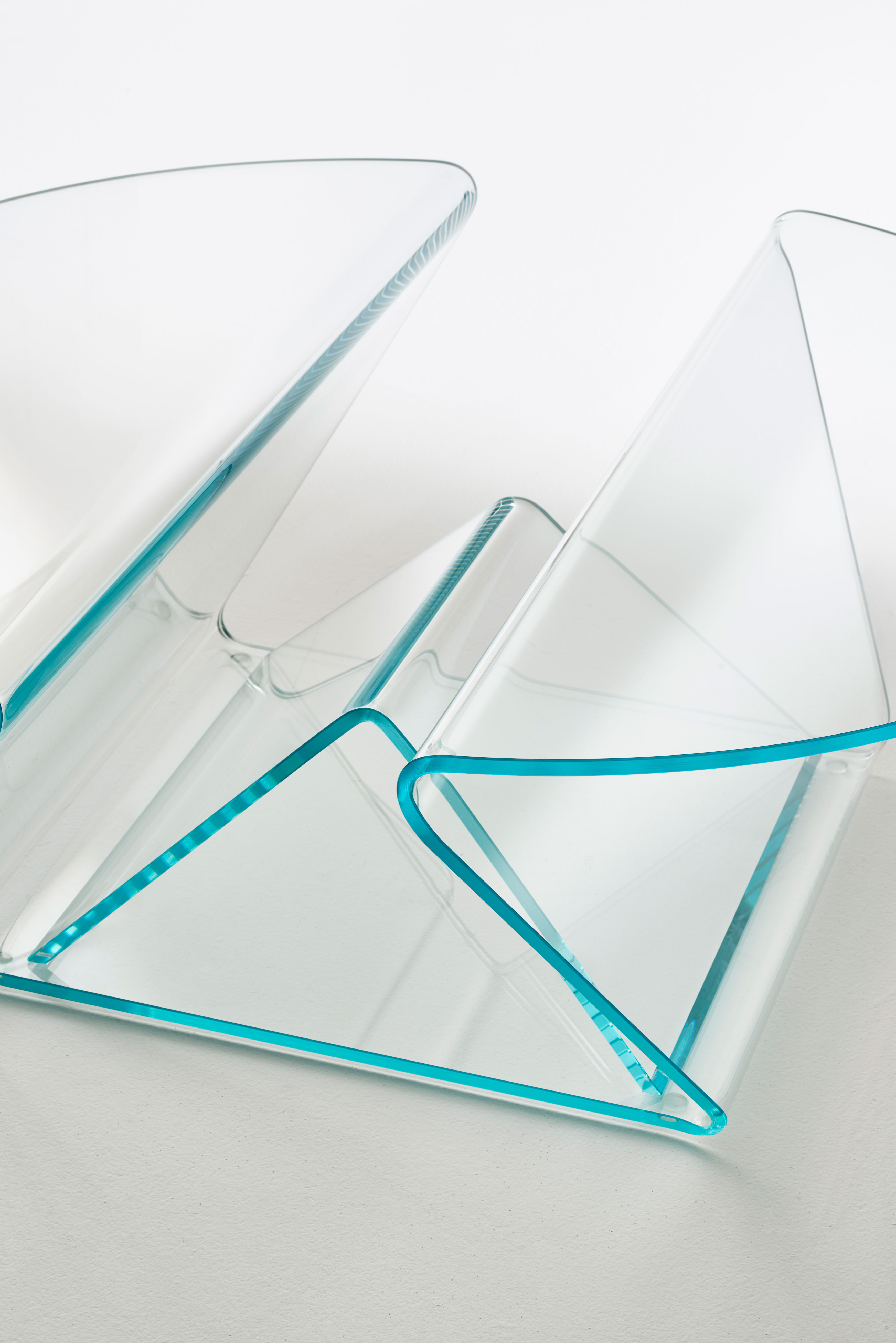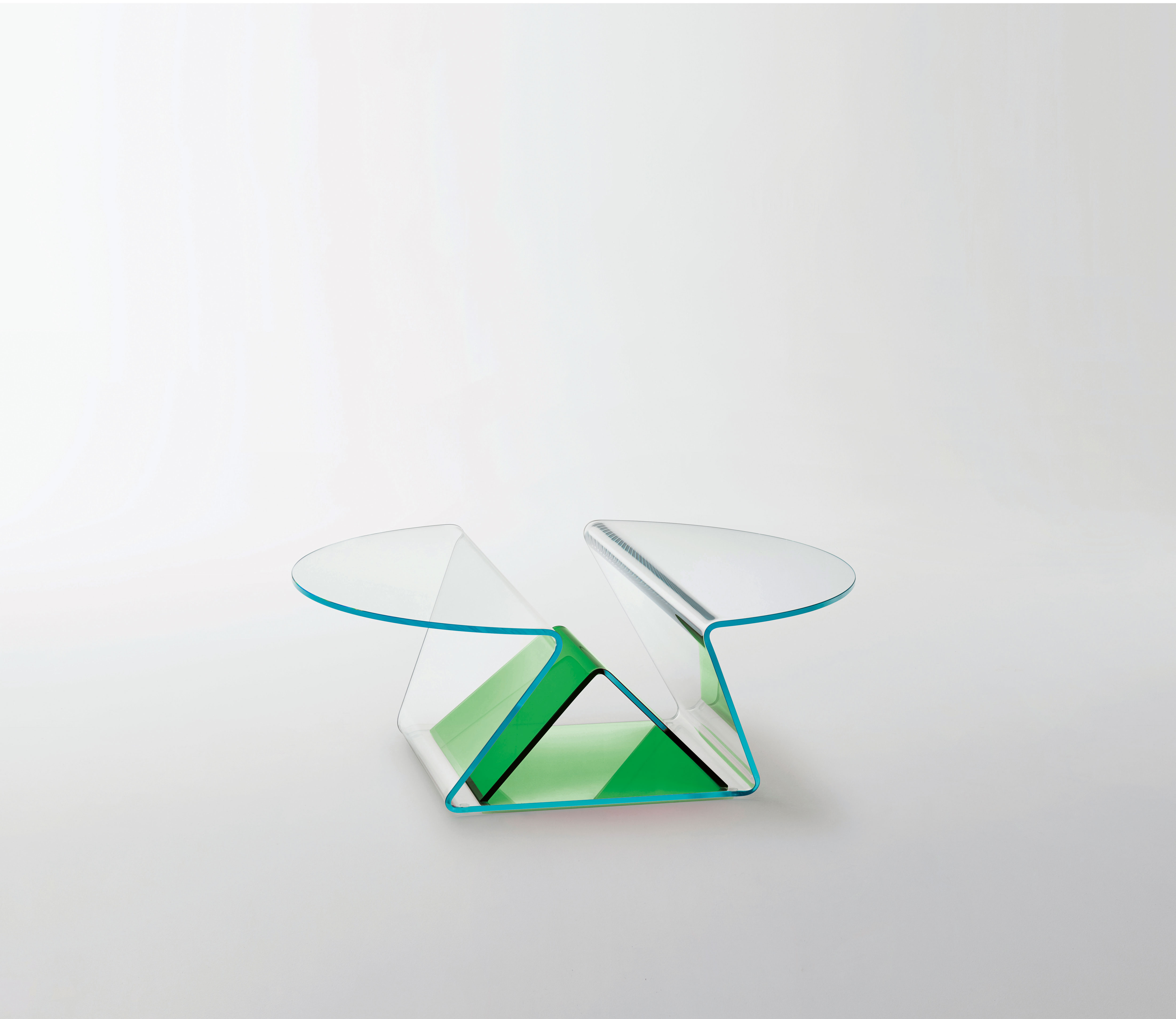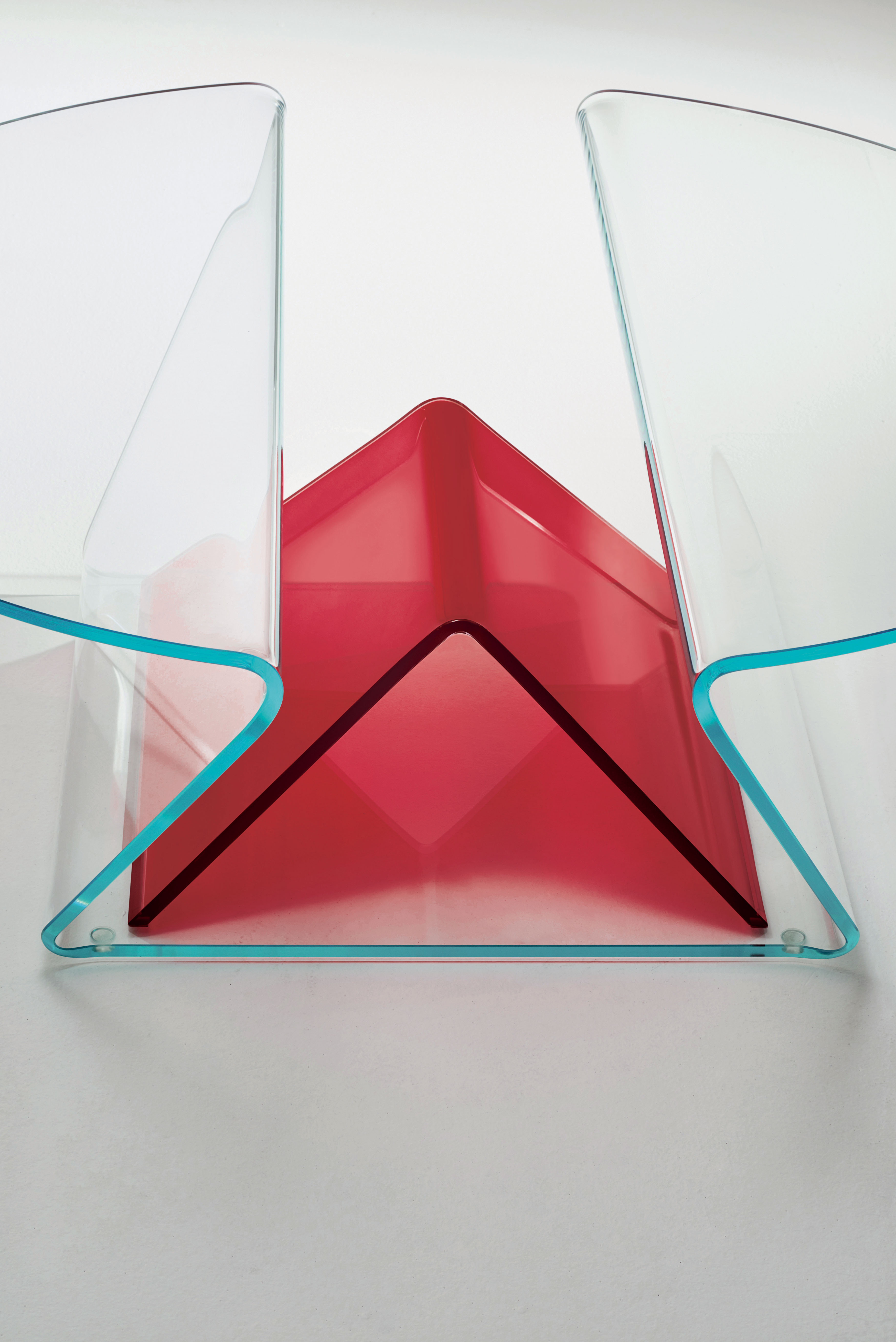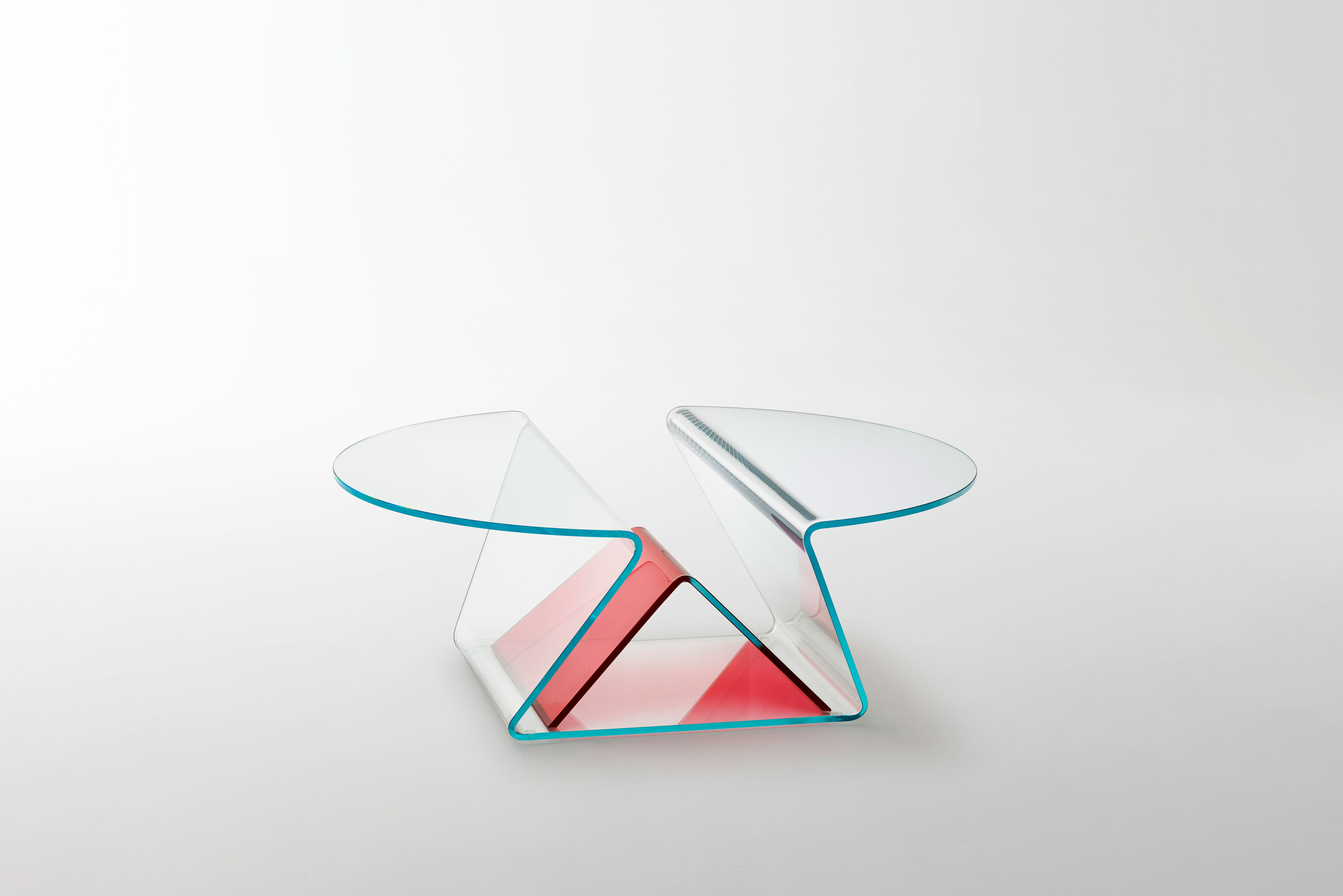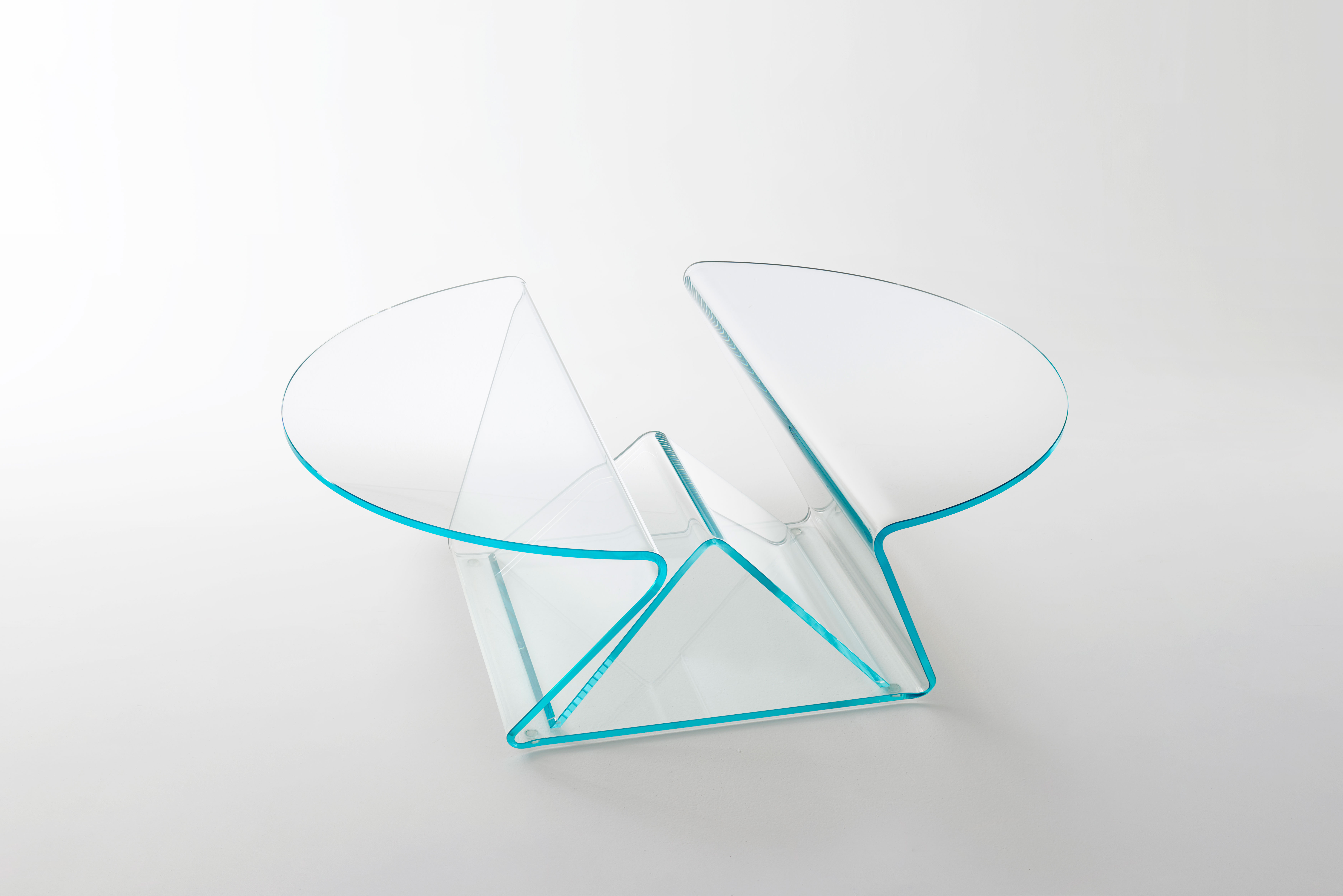 Presenting our multipurpose low glass table! This elegant piece, which is made of 12mm extralight glass, has soft, curved shapes that were achieved through a complex bending process. It has a handy storage compartment and two cantilevered tops, making it both fashionable and useful. Its central component is a useful magazine rack composed of tastefully curved glass with a unique reversed-V shape. This transparent table, which comes in transparent ruby red, blue, emerald green, or clear extralight options, is the ideal combination of design and functionality.