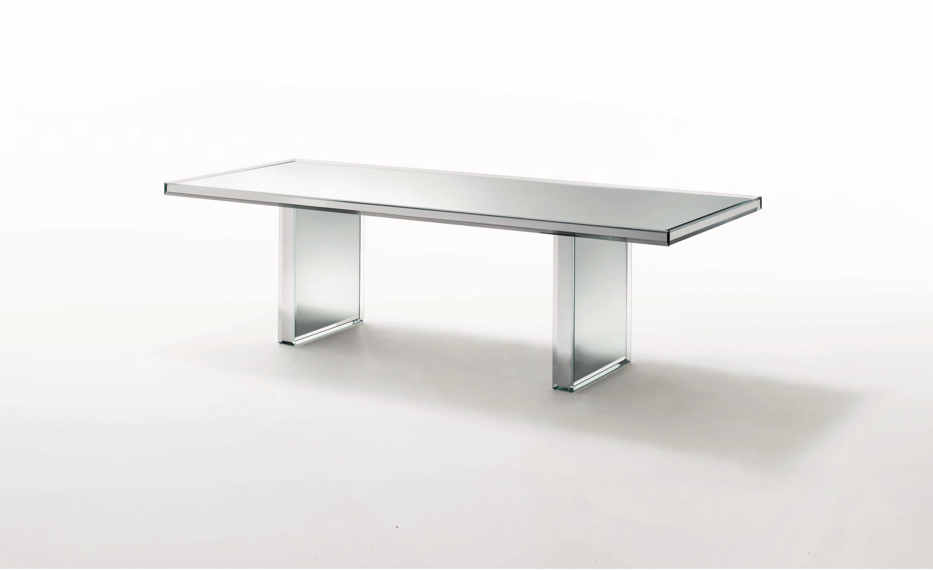 The transparent extra light glass used to make the table has a silver-plated finish and is 12 mm thick. The mirrored reflections and the expertly done bevelling and grinding along the edges add to its brilliance. Its overall stability and design are enhanced by the metal plates and screws that hold the bases to the top.