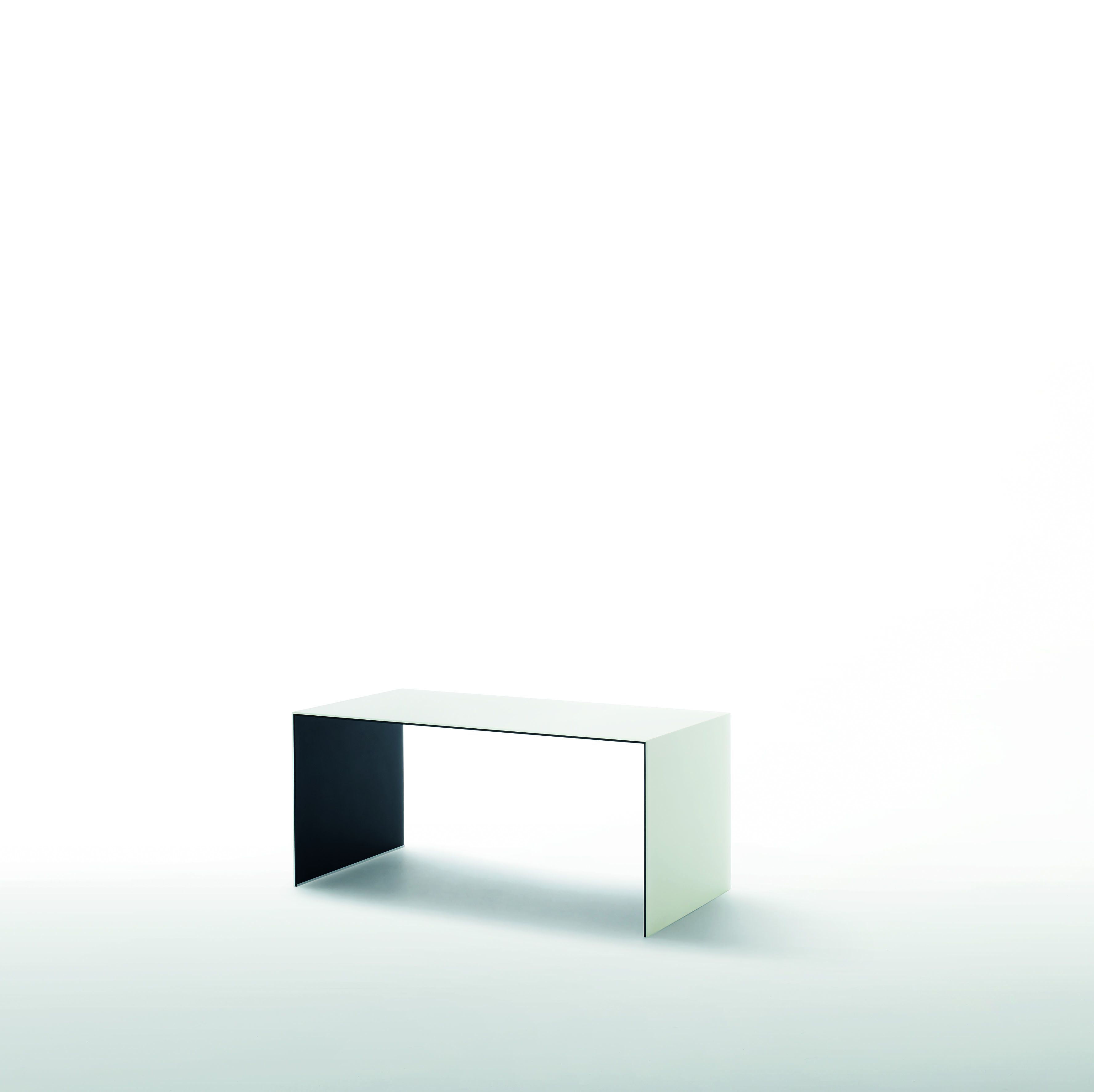 Series of bridge-shaped low tables, consolle and desk in coupled laminated glass. Available in glossy lacquered and opaque lacquered glass with the possibility to combine freely the colour of the lower side with the colour of the upper side.