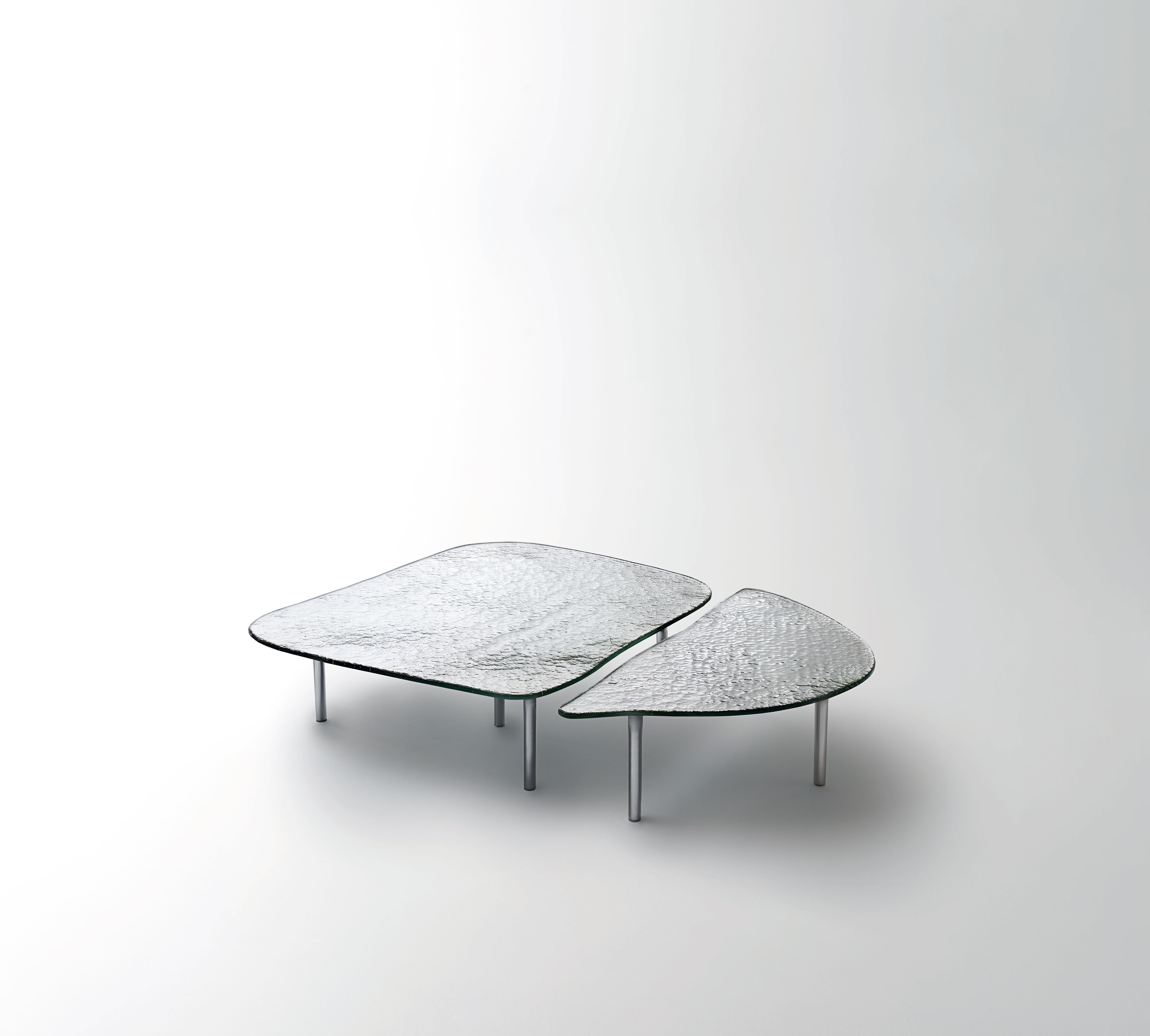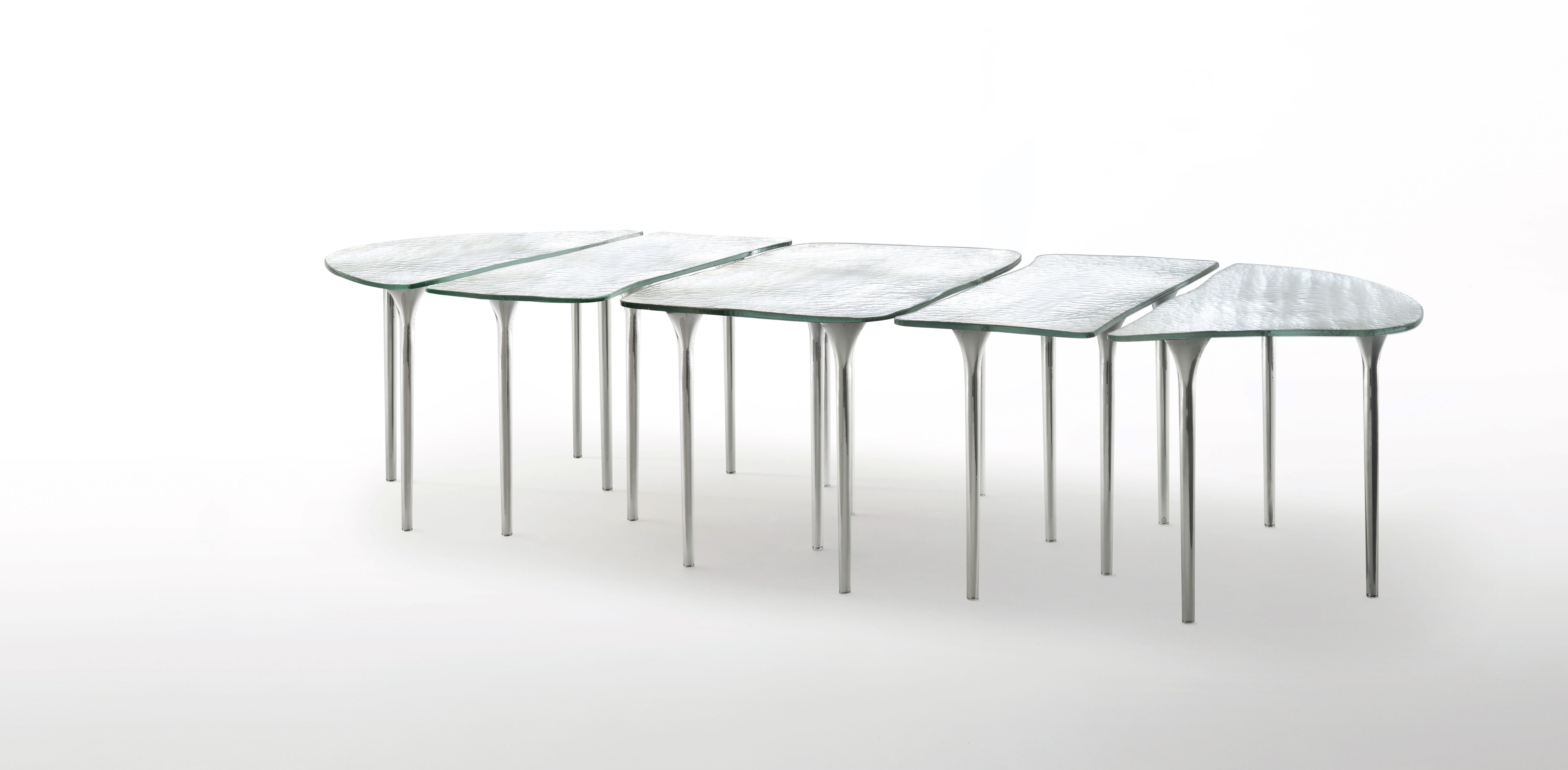 This line of blown glass furniture includes high tables, consoles, and low tables, all with rounded edges, delicate thin legs, and a soft, asymmetrical shape. Even though each of these parts can be used separately, when grouped together, they can create a more substantial table. The legs are finished to match the tabletop, and the tops are made from a unique poured silvered glass.