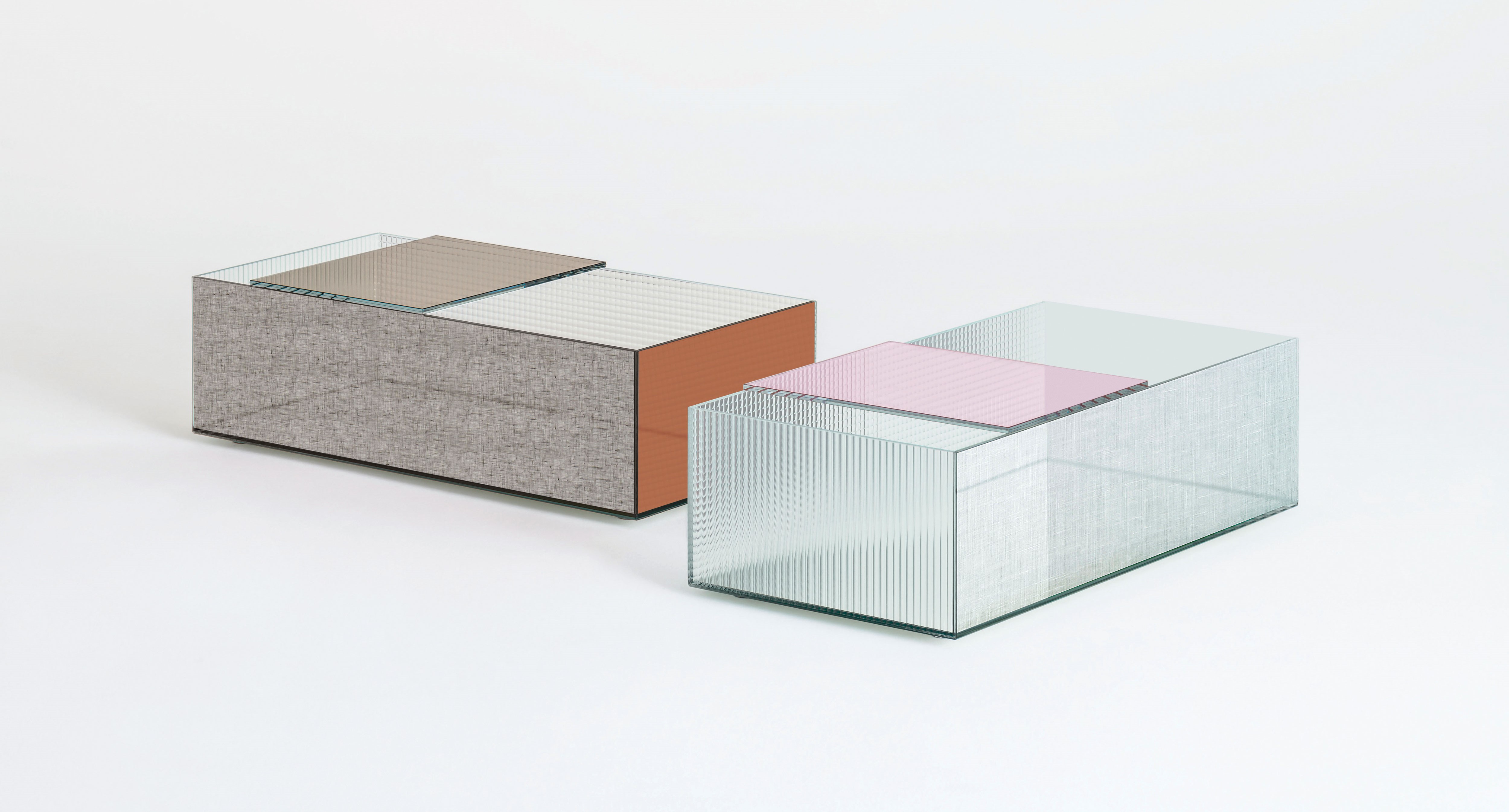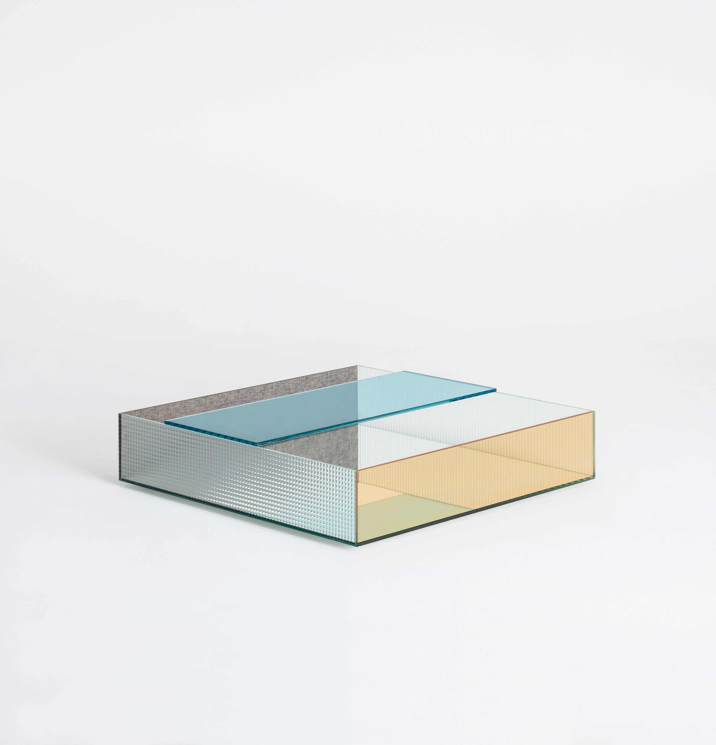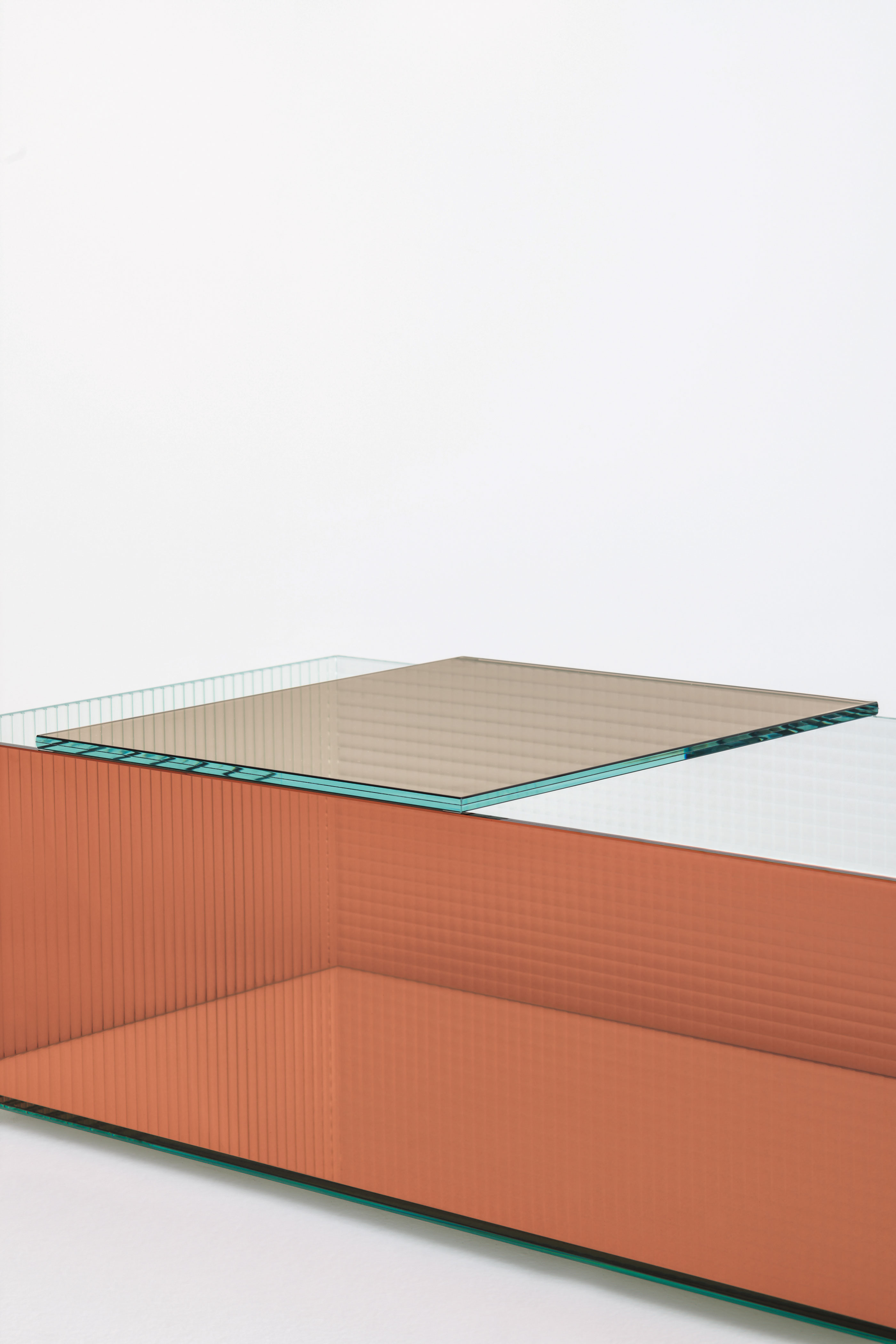 This Low composite table has a tubular shape that is created by 45° bonding of laminated glass slabs with various finishes and qualities. The four sides feature a variety of materials, with the bottom being mirrored. These materials include printed glass with Flutes design, printed glass with Quadretti design, glass embellished with Botticelli or Masaccio fabric, depending on the style chosen, transparent coloured glass with a choice of twelve colours, and extra light transparent glass. A support surface that can be placed however desired is needed to finish the coffee table. It is offered in transparent extra light or transparent coloured glass, with a selection of 12 colours.