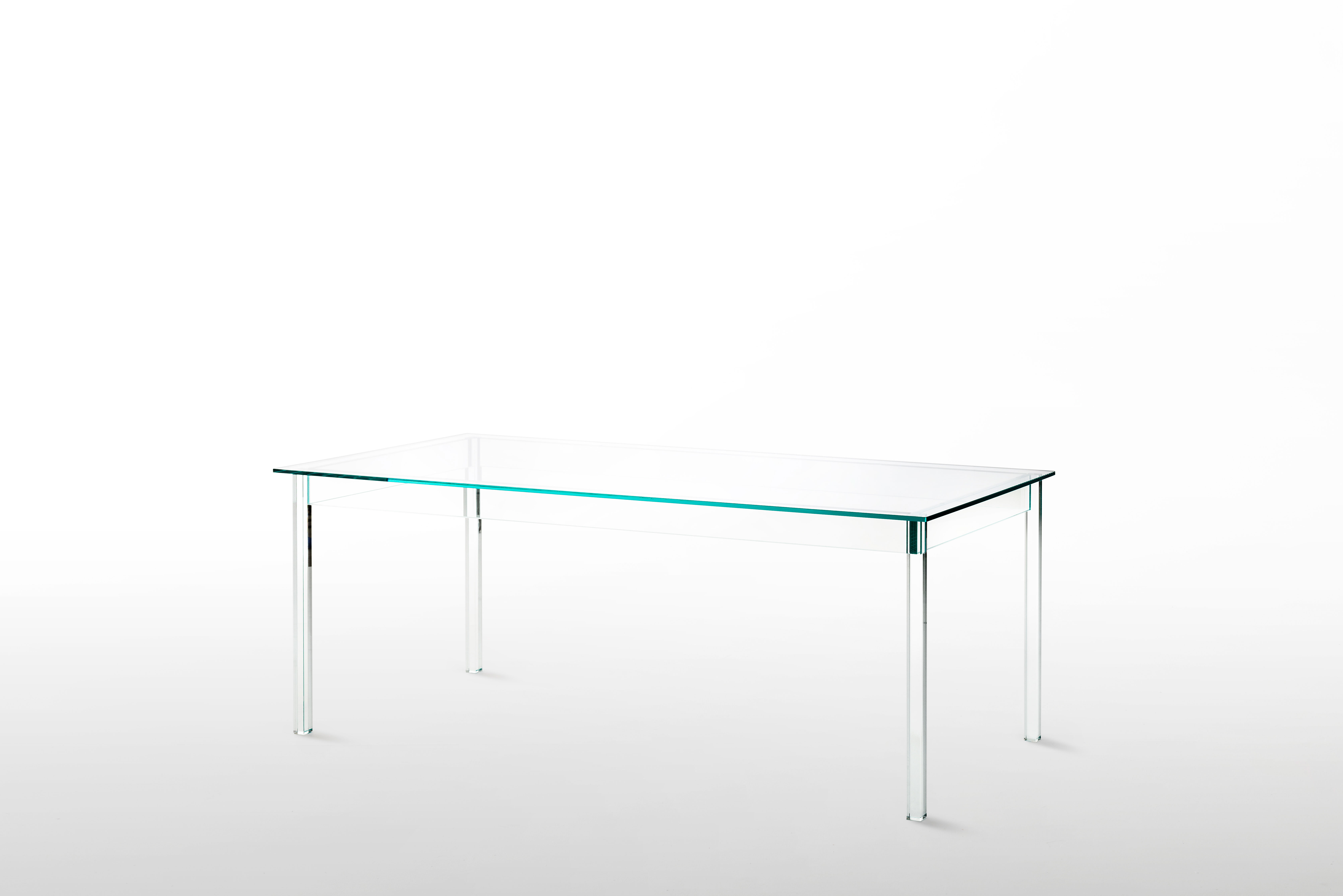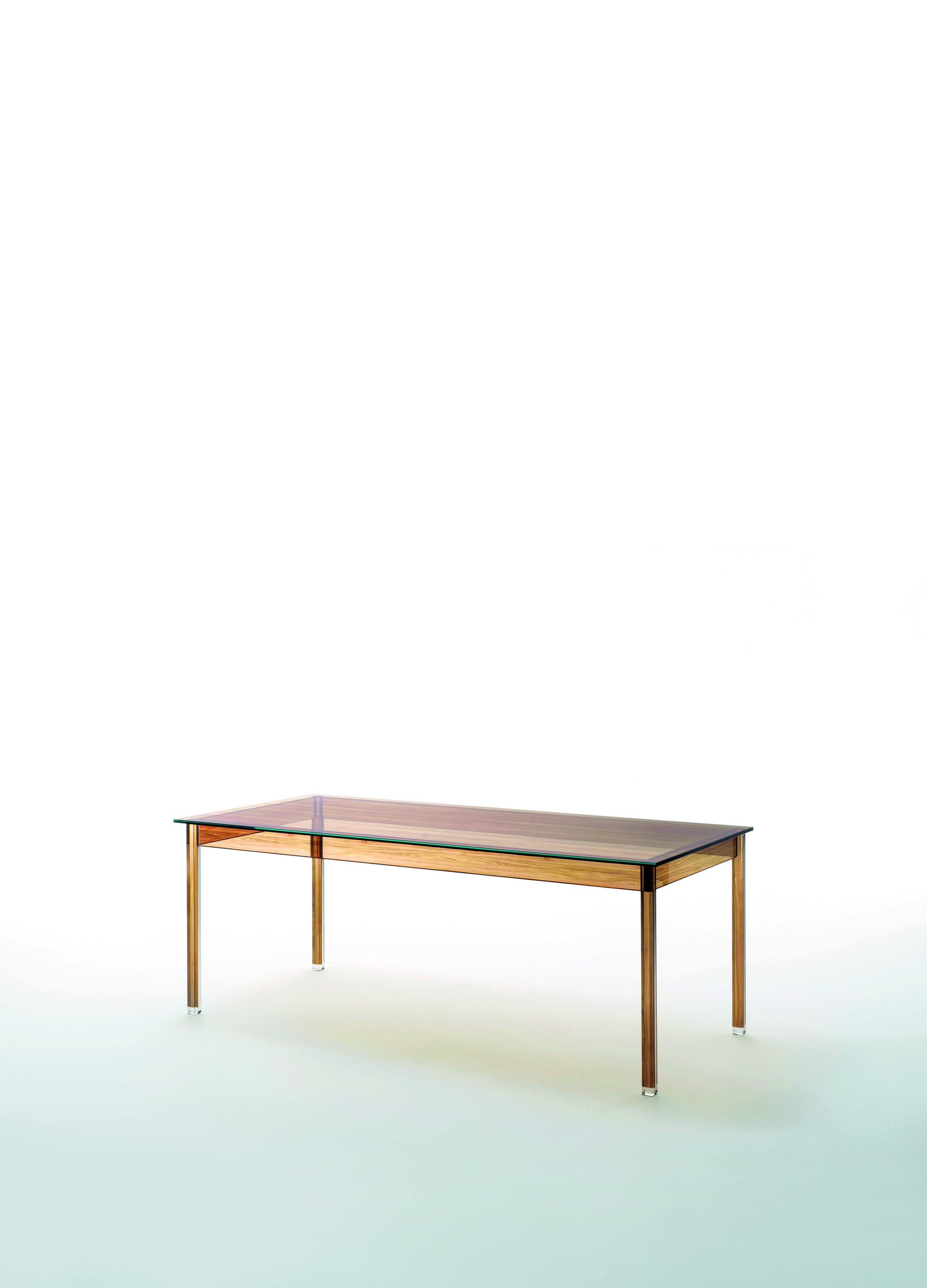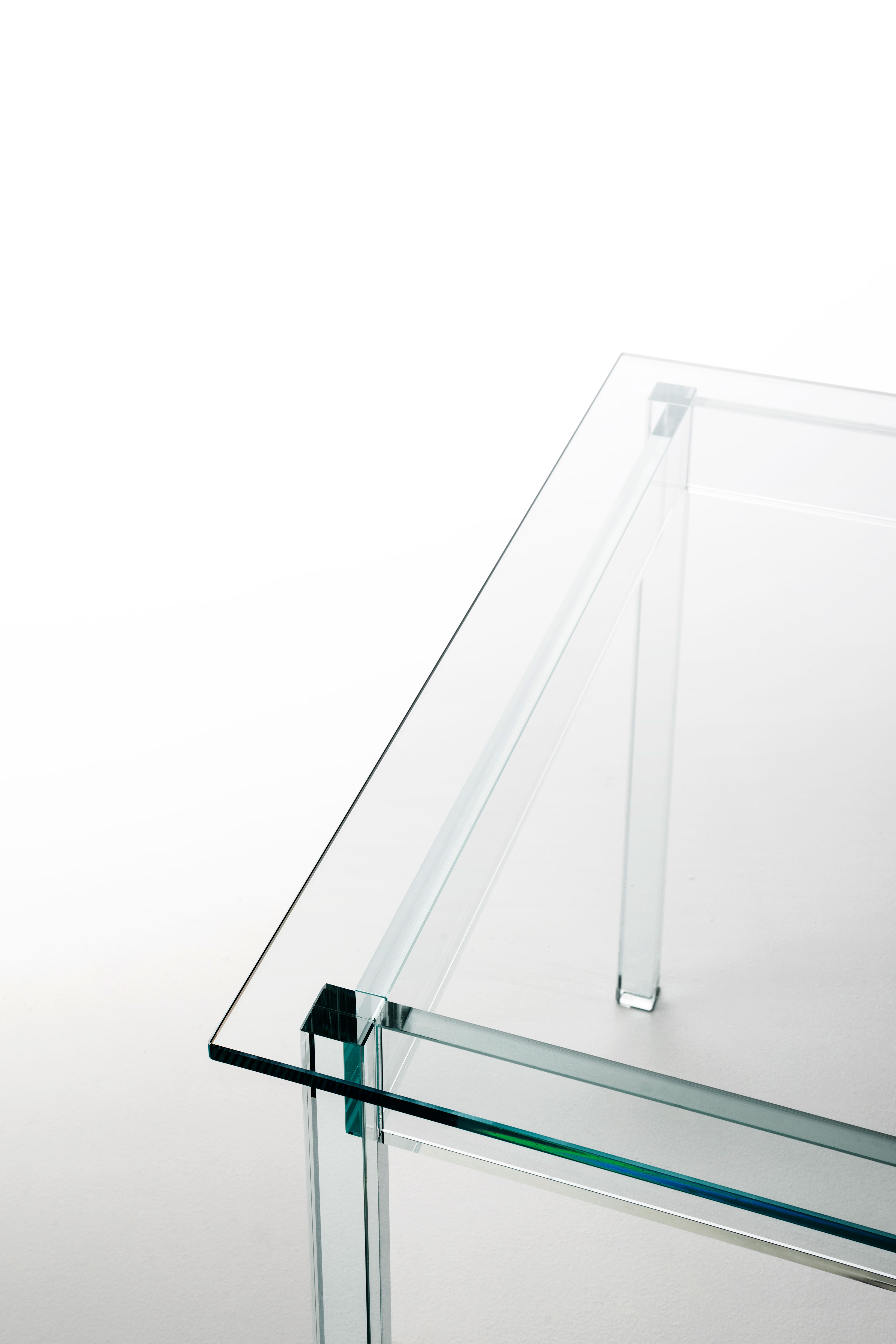 This High table features a special printing process that enables the essence of walnut to be transparently reproduced onto the glass surface. It is a unique blend of laminated and glued glass. It presents the wood as a sublimated and ethereal symbol, transcending its inherent material source through an experimental fusion of the disparate materials, supported, and absorbed within the extra light glass. It comes in clear or dark walnut finishes and is housed in an extra light glass structure that is transparent and has a tempered top.