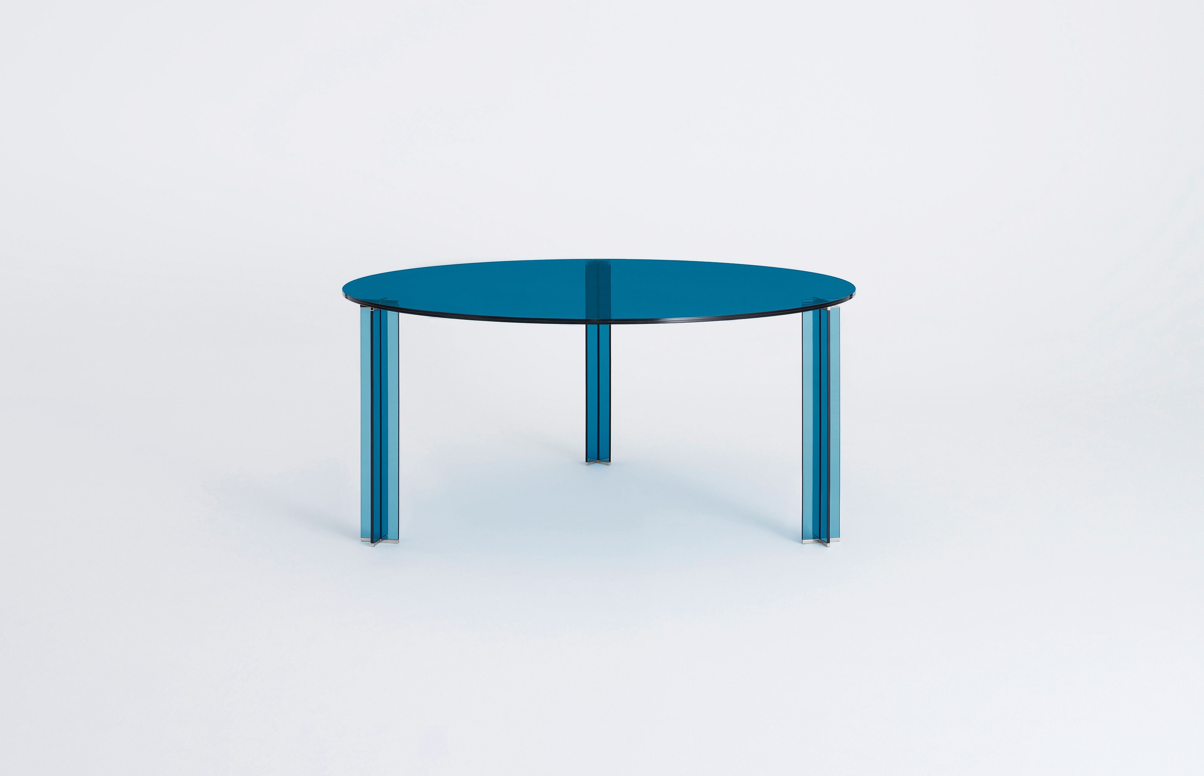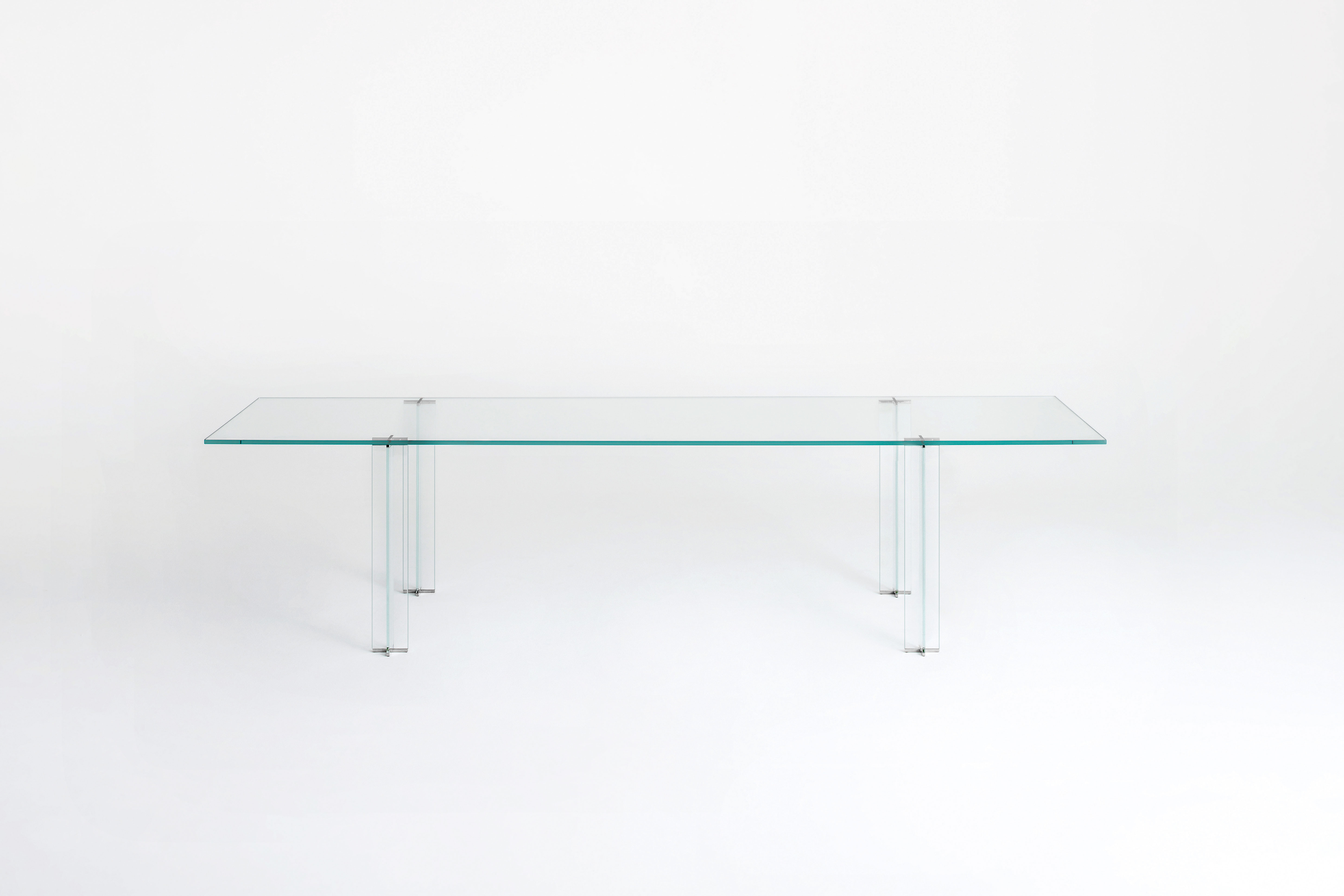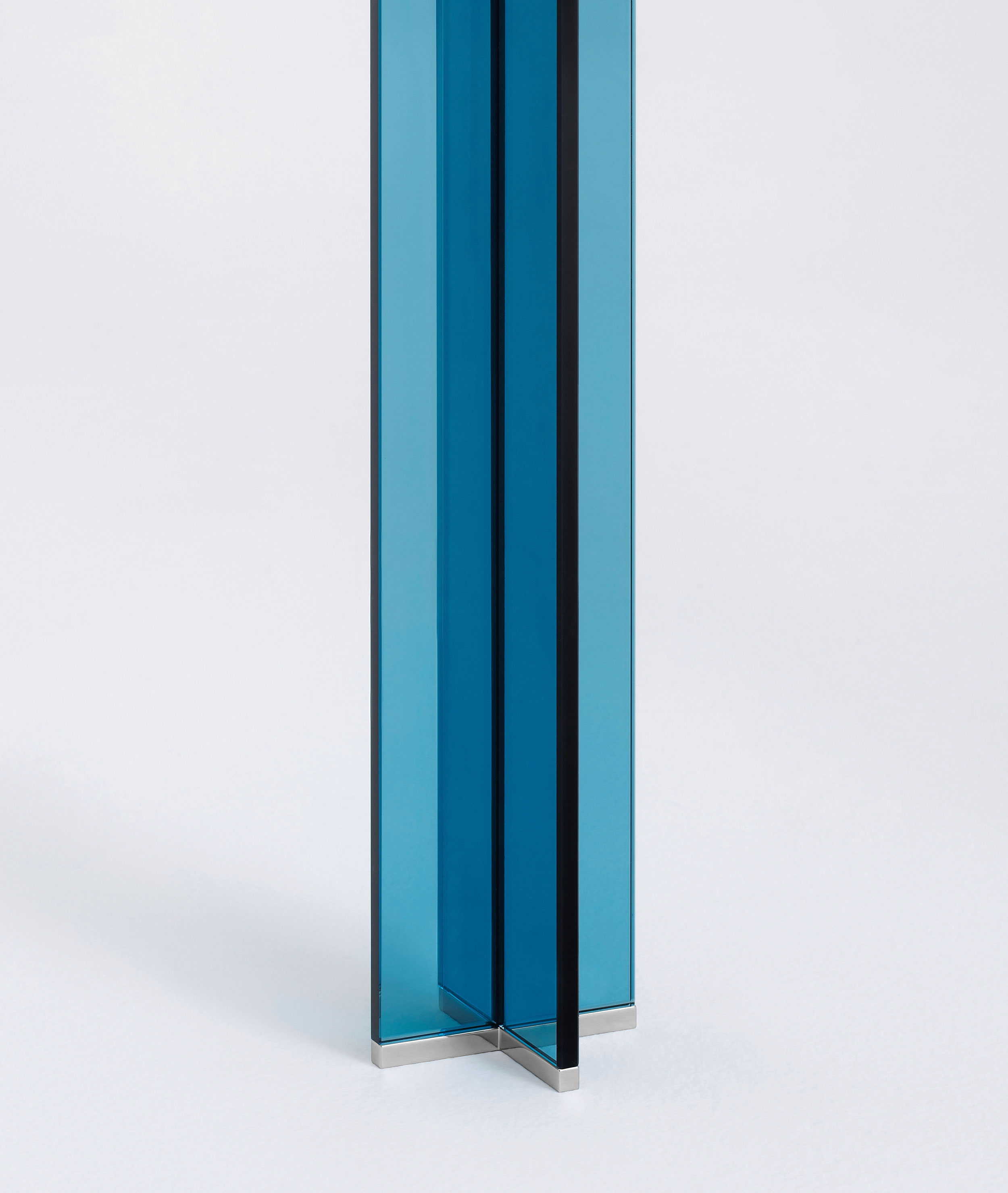 This High table comes in a number of shapes, including square, round, oval, and rectangular, and its top can be made of transparent extra light or smoked glass that is 15 mm thick. As an alternative, an 8+8 mm laminated "blue paste glass" top is available. The legs are UV-bonded, extra light, smoked, or blue paste tempered glass that is 10 mm thick. Sophisticated stainless-steel plates with a mirror polish are used to connect them to the top. The table is further enhanced at the bottom by four mirror-polished stainless -s teel feet that are expertly incorporated into the leg design.