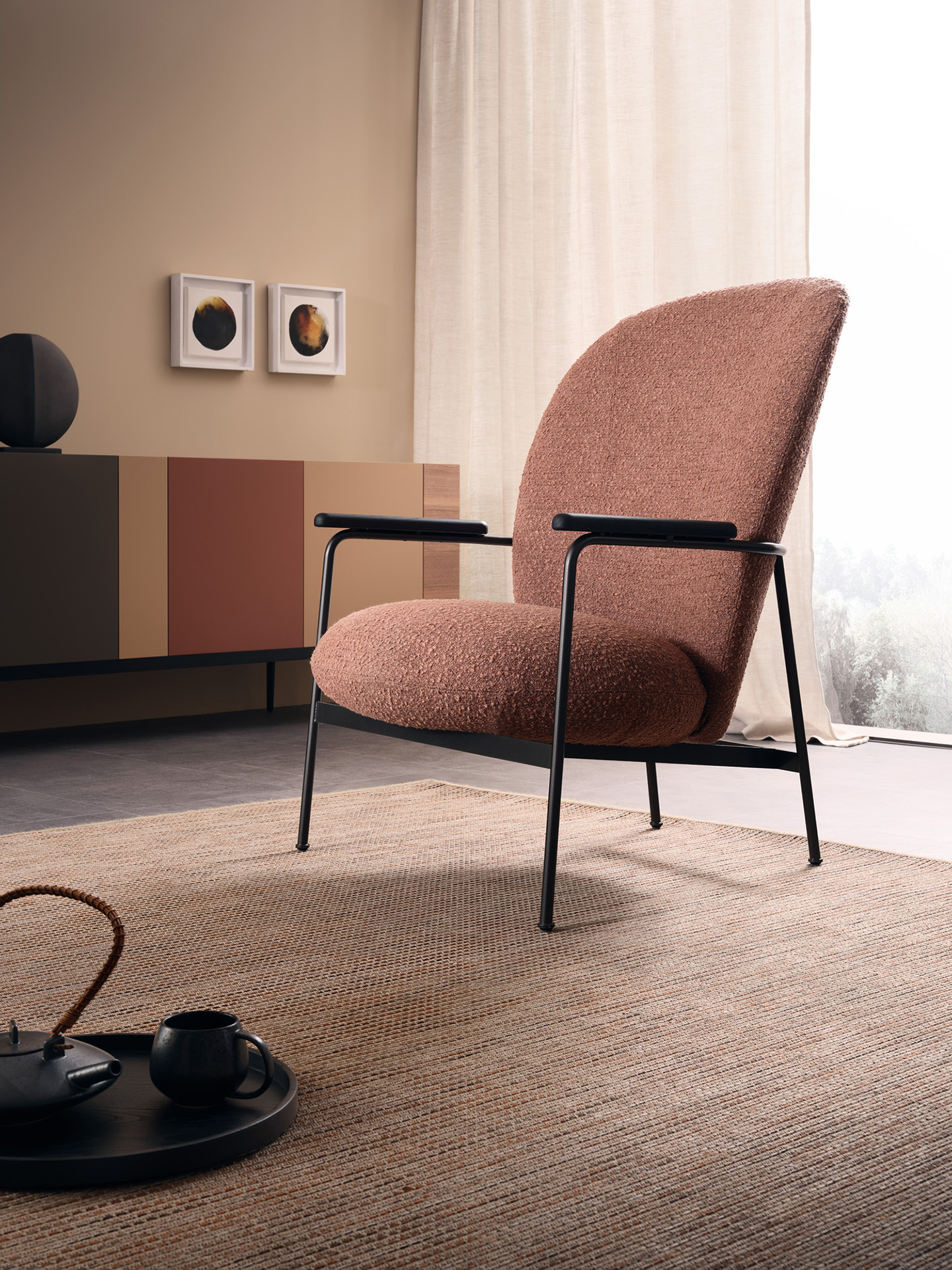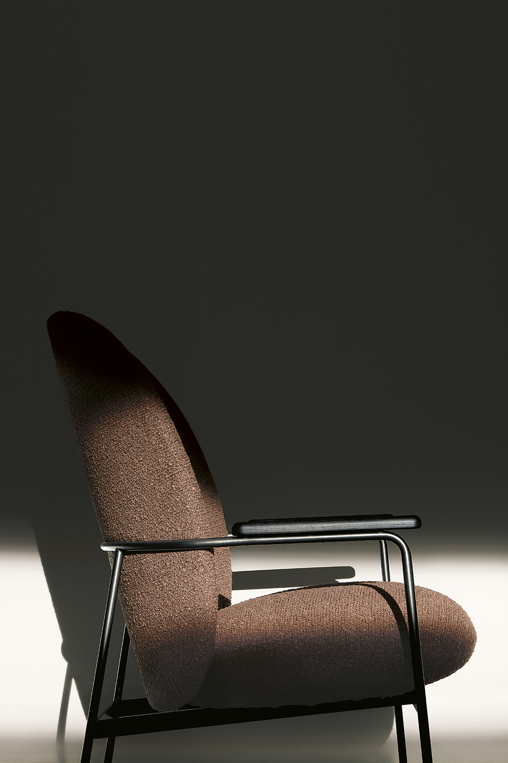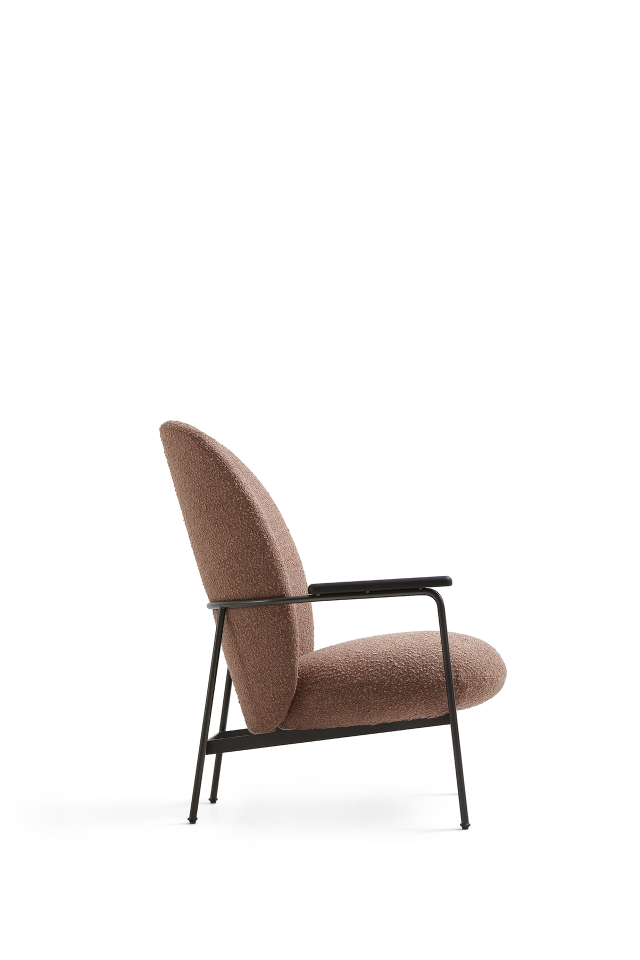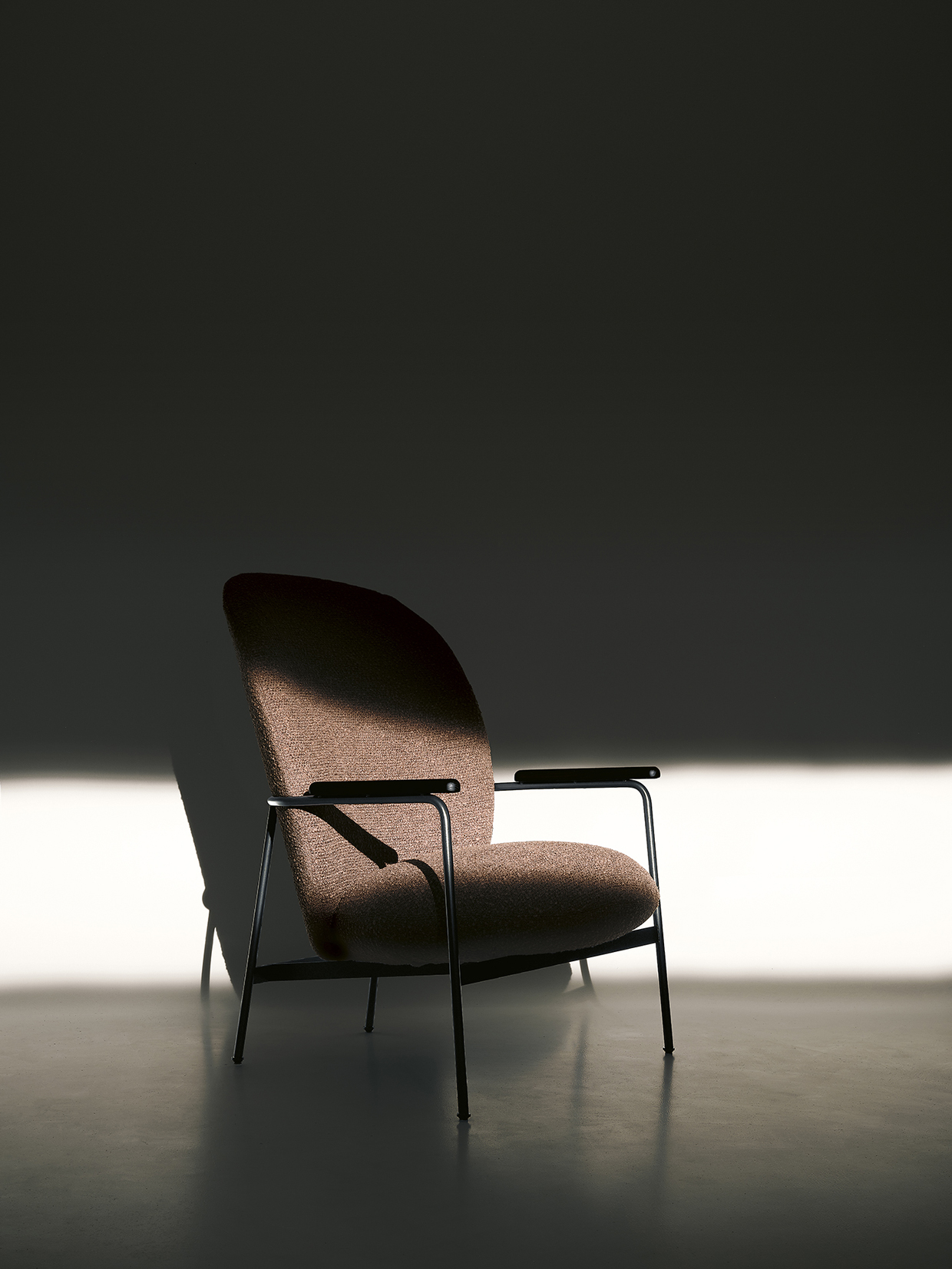 With its high backrest, rounded shape, solid wood armrests, and elegant proportions for contemporary living areas, the Claire lounge chair by Norm Architects blends comfort and minimalist style.