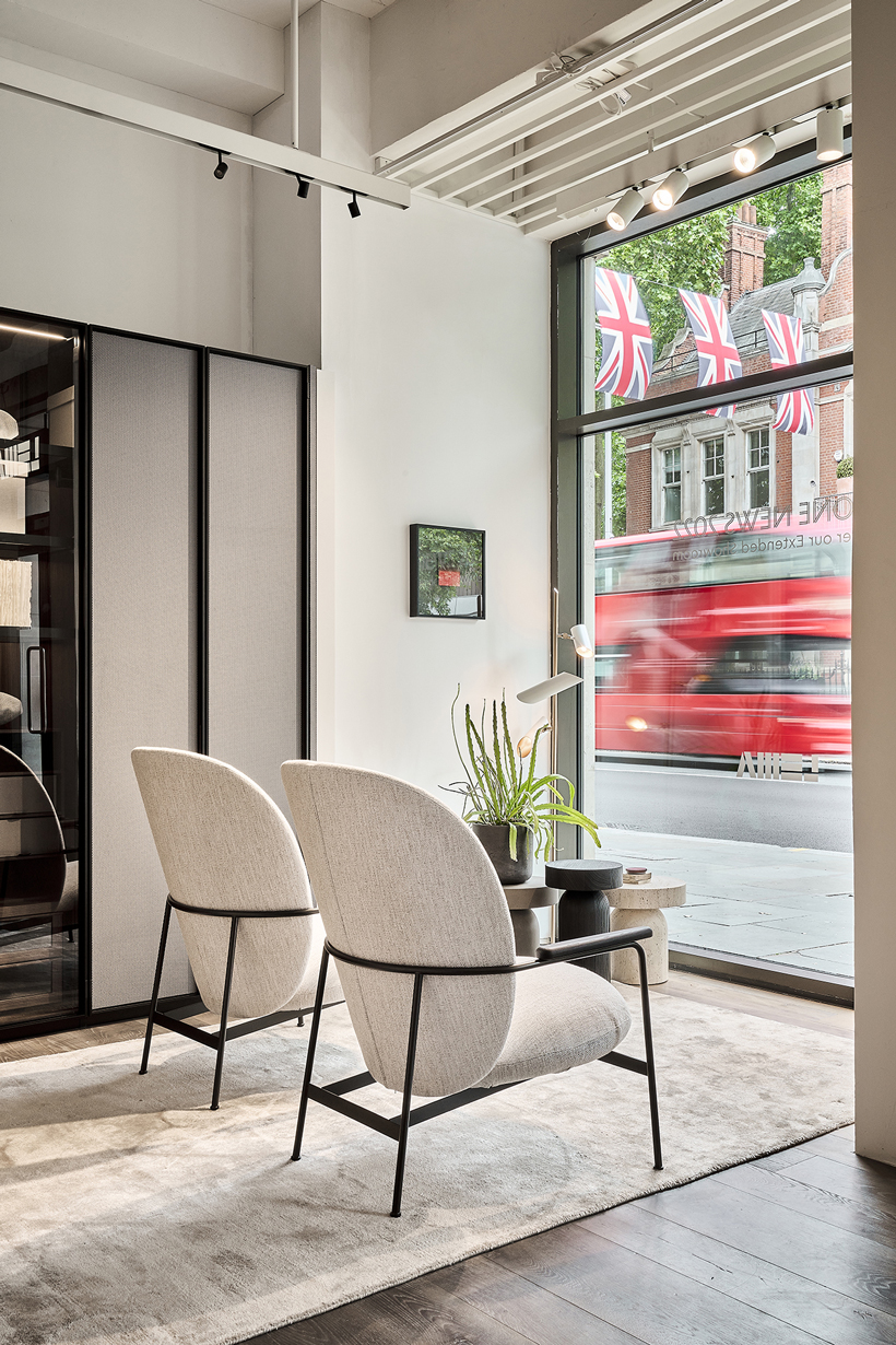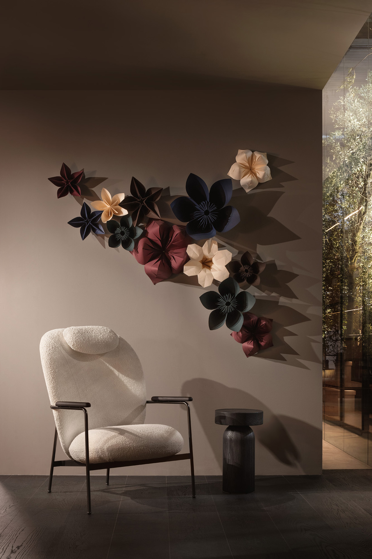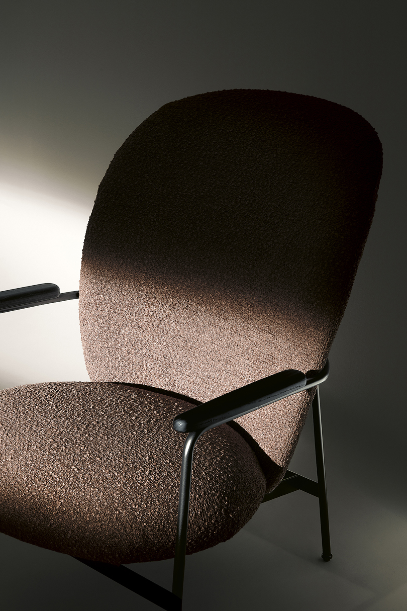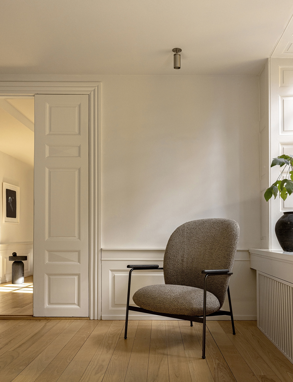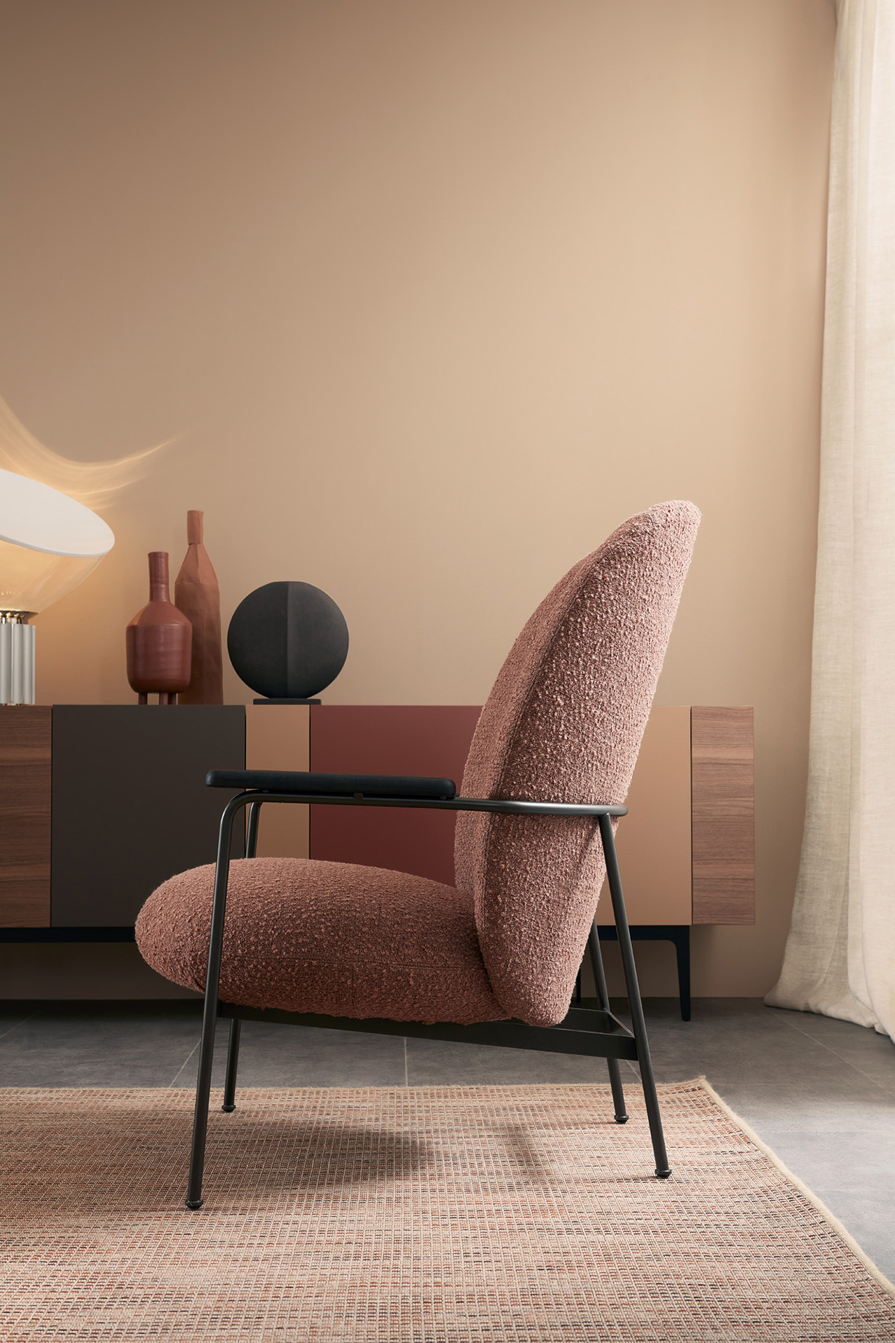 With its high backrest, rounded shape, solid wood armrests, and elegant proportions for contemporary living areas, the Claire lounge chair by Norm Architects blends comfort and minimalist style.