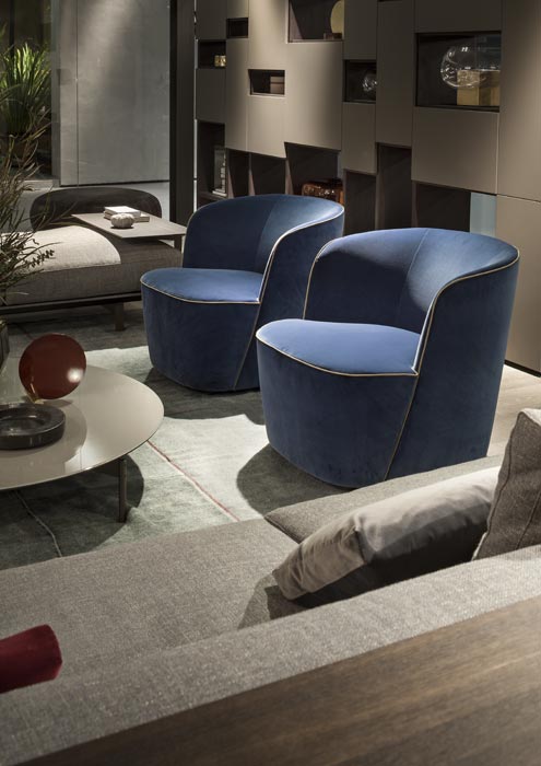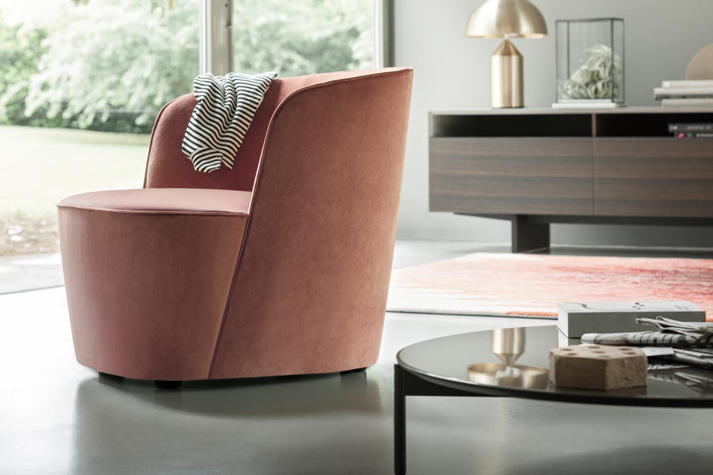 The elegant and discreet Felix armchair is ideally located in the sleeping area. The stitching and seams reveal graceful and subtle contours of the curved backrest, enclosing this monolithic seat.