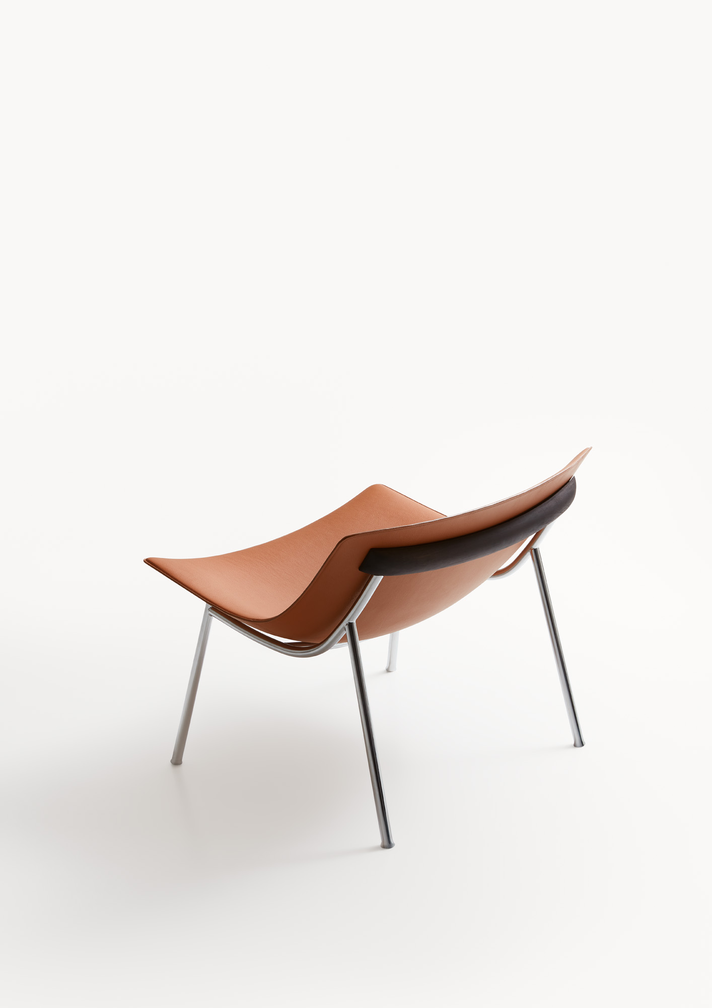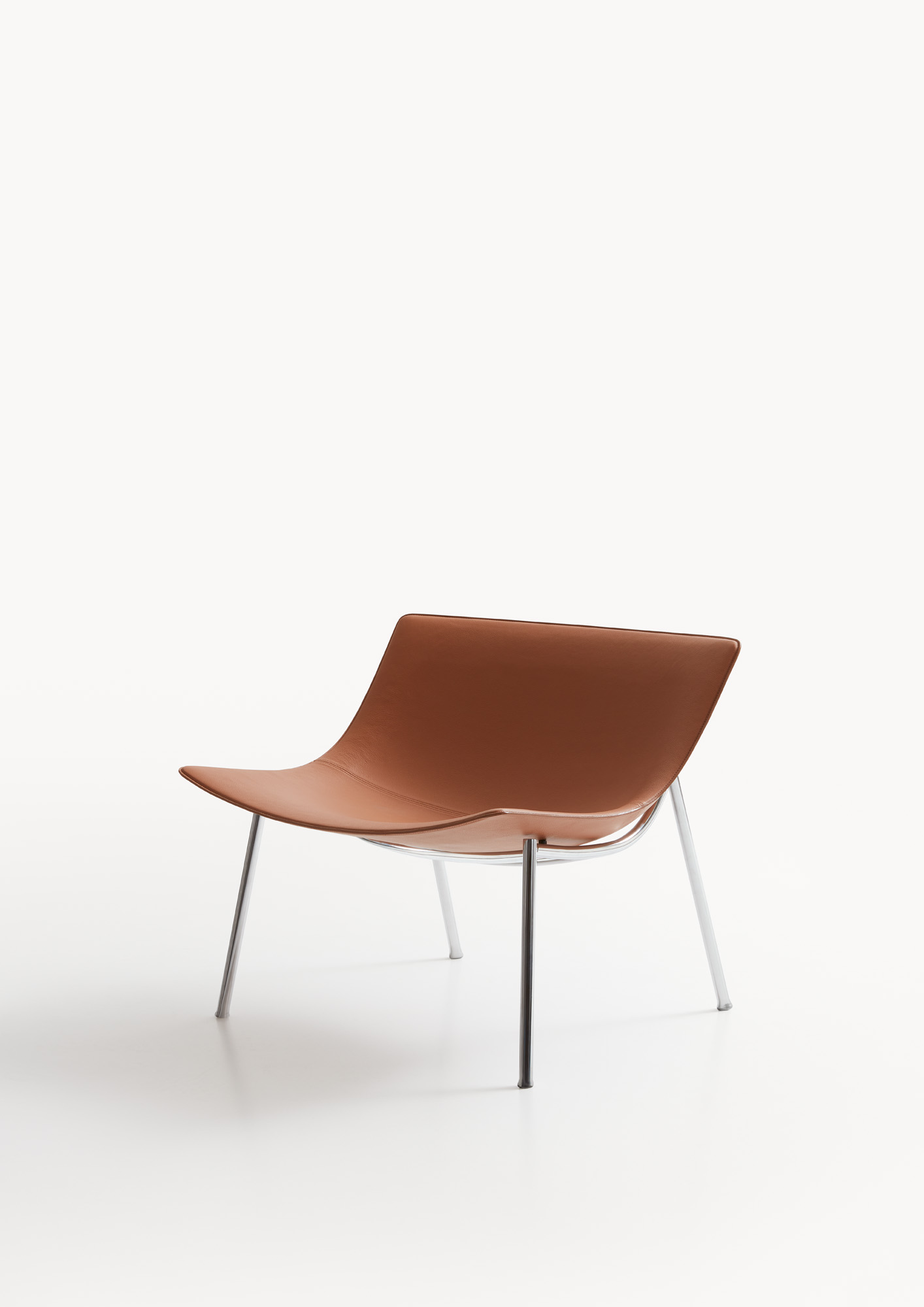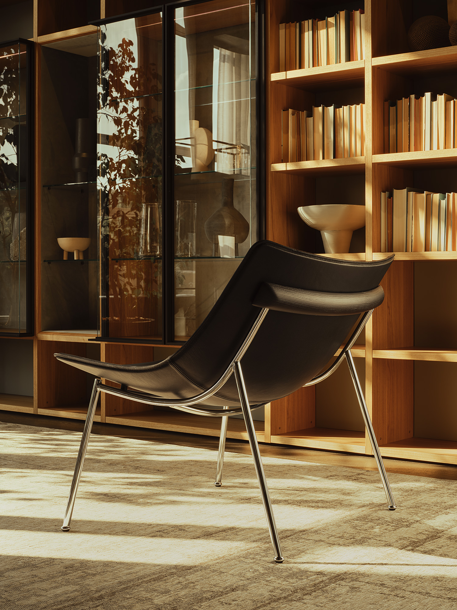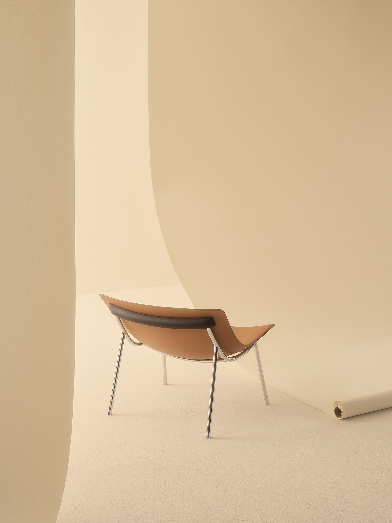 Omega is a lounge armchair that blends vintage 1950s style with modern elegance. Featuring a lightly padded shell upholstered in leather or vegan leather, it pairs soft seating comfort with a sturdy metal frame. A horizontal wooden element supports the backrest, highlighted by precise stitching that defines its sleek edges—a timeless fusion of history and contemporary design.