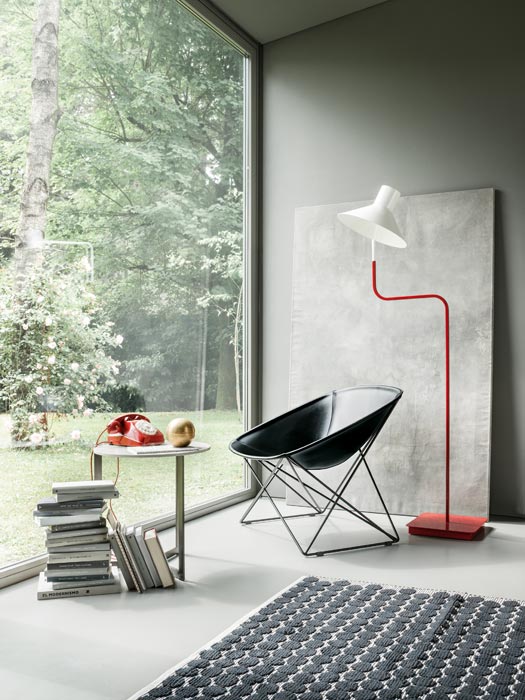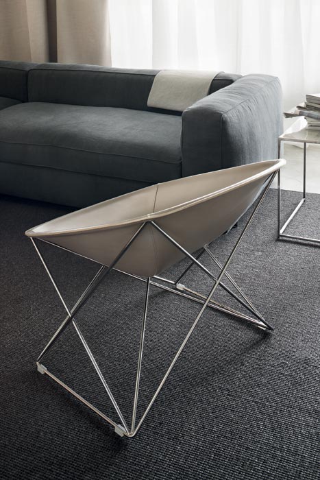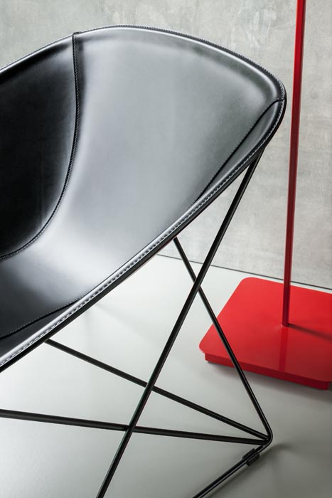 The Popsi lounge chair stands out for its sought after design and choice of materials: metal and leather. Its base is constructed with a light metal in a complex web pattern. From the four points on the floor, they rise to acute angles to support the four apexes of the wide leather seat. Finished with sewing to underline the petal’s flowing curves, it is the perfect example of Lema’s tailoring approach.