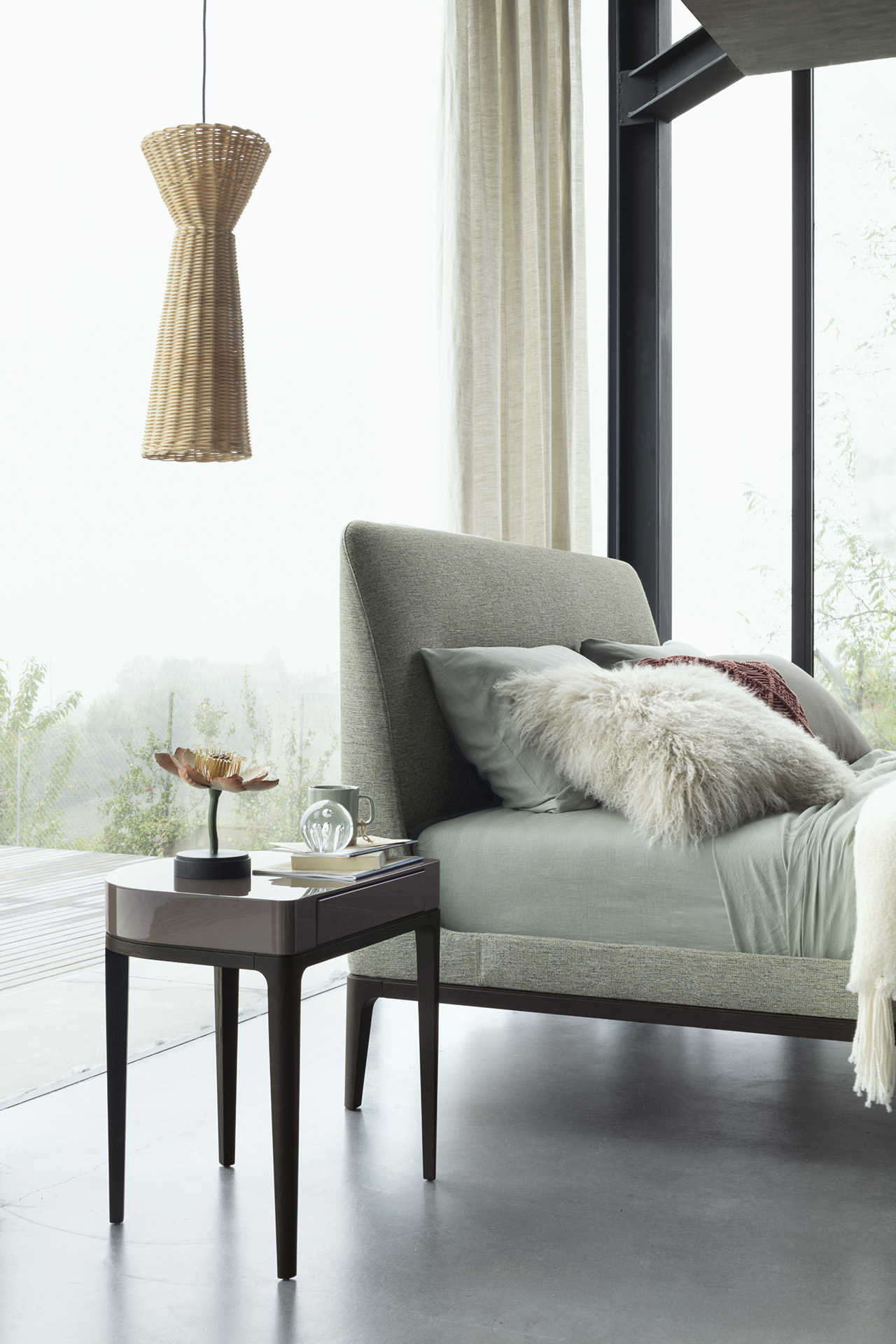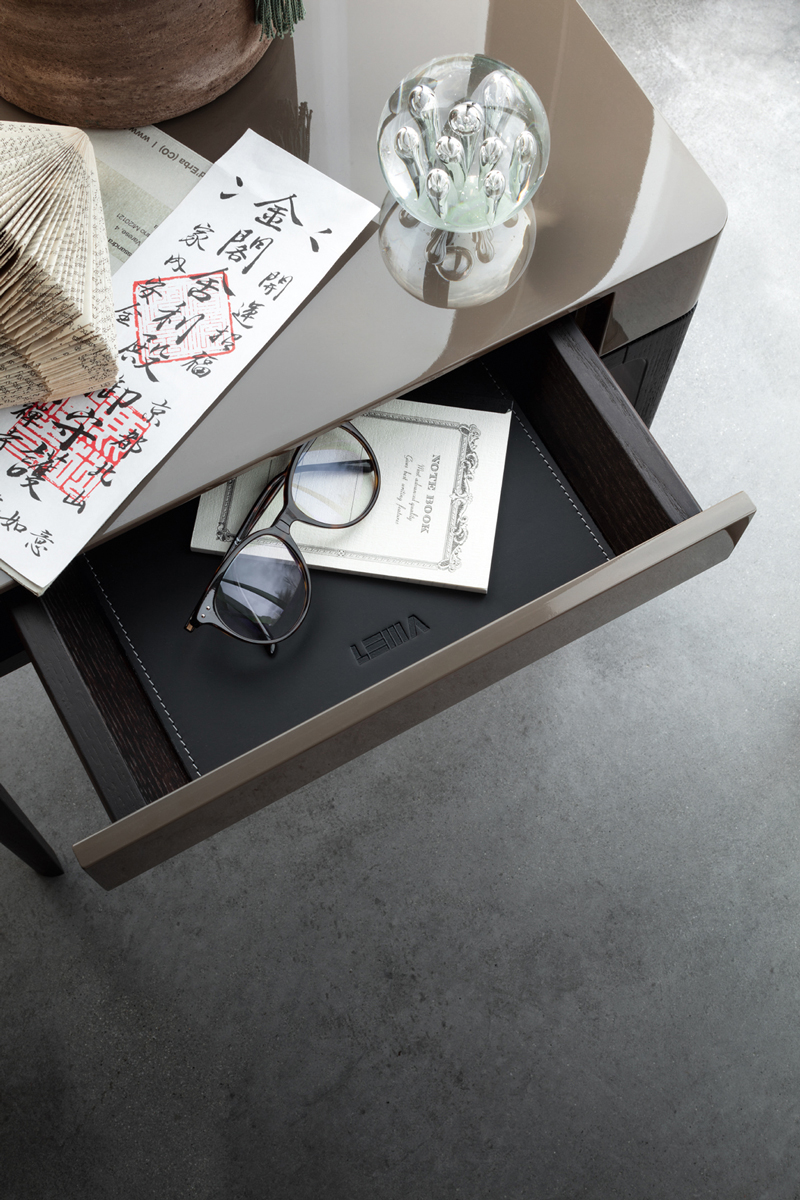 The unmistakable hand of Roberto Lazzeroni gives life to the VIC bedside table, a design that reinvents classical lines in a modern form. With its agile solid wood structure, VIC is available with or without a drawer, finished with an elegant leather base. The top is available in glossy or matte lacquer.