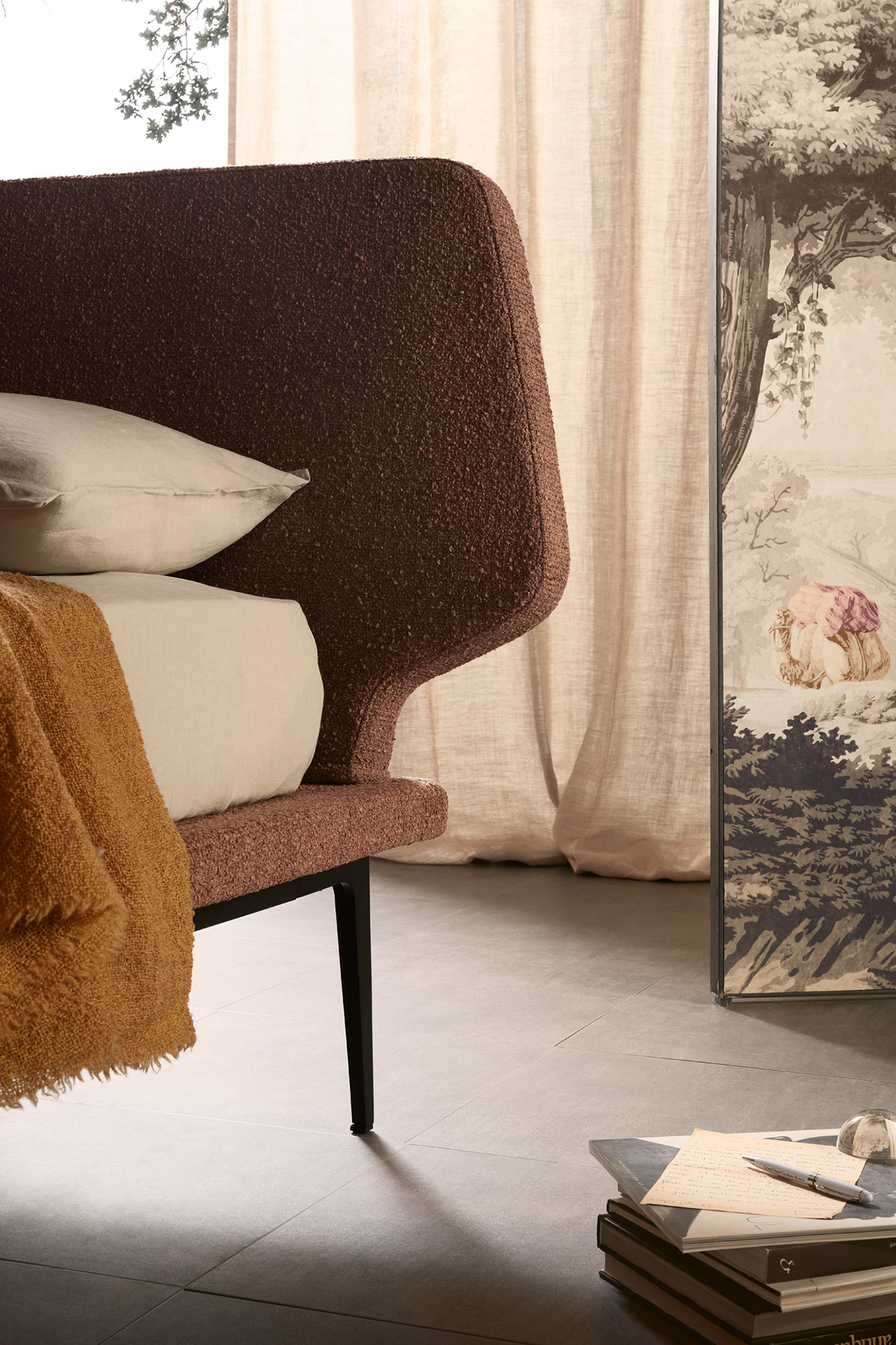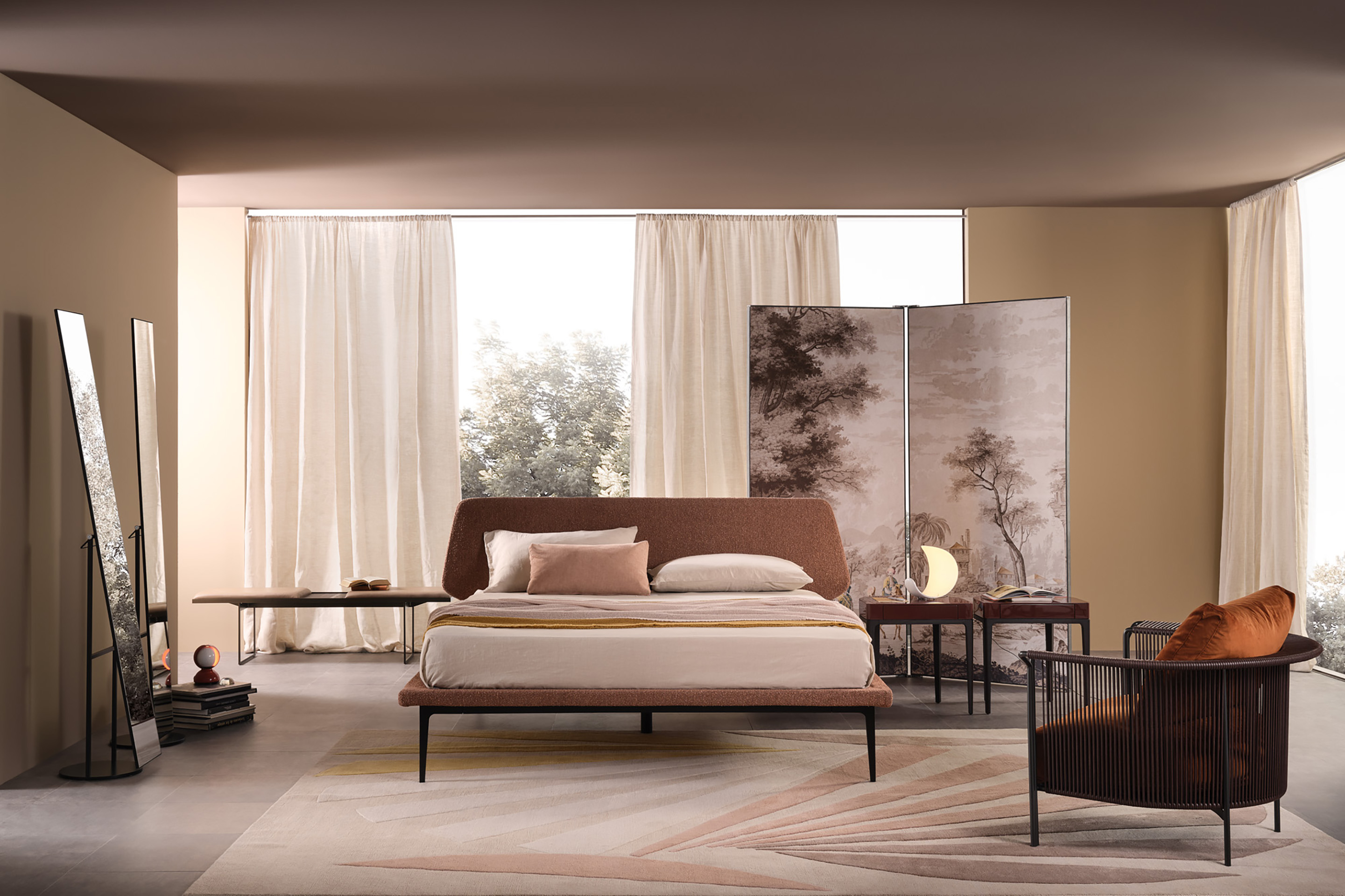 The irregular but symmetrical headboard characterises the Dream View bed making this piece modern yet inspired by styles of the past. The bed consists of a light structure with delicate metal feet and a net frame completely covered in fabric from Lema’s assorted colour catalogue.