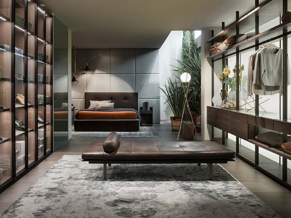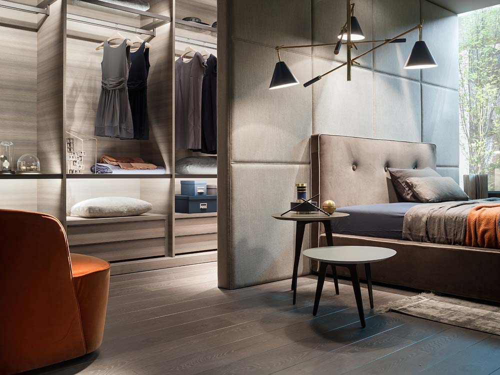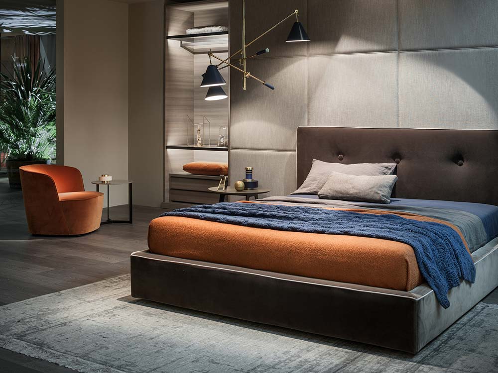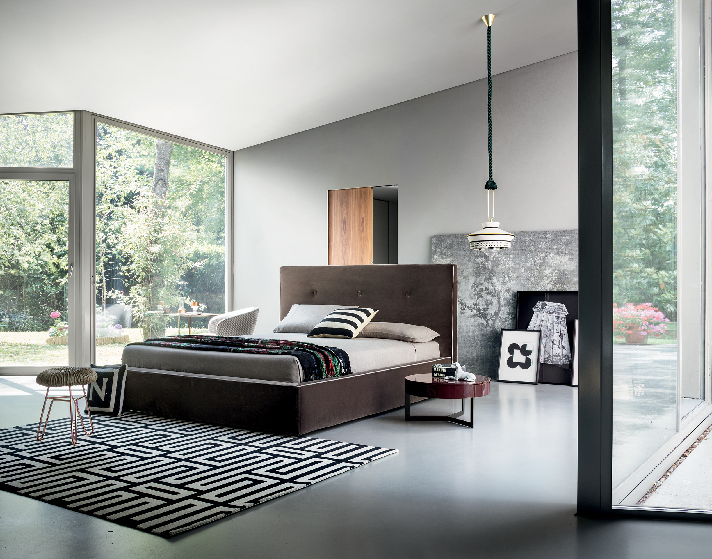 The Madama bed stands out for its soft, reassuring shape. An elegant application with the upholstered headboard recalling the capitonné style and the thin rat-tail cord contouring the frame.