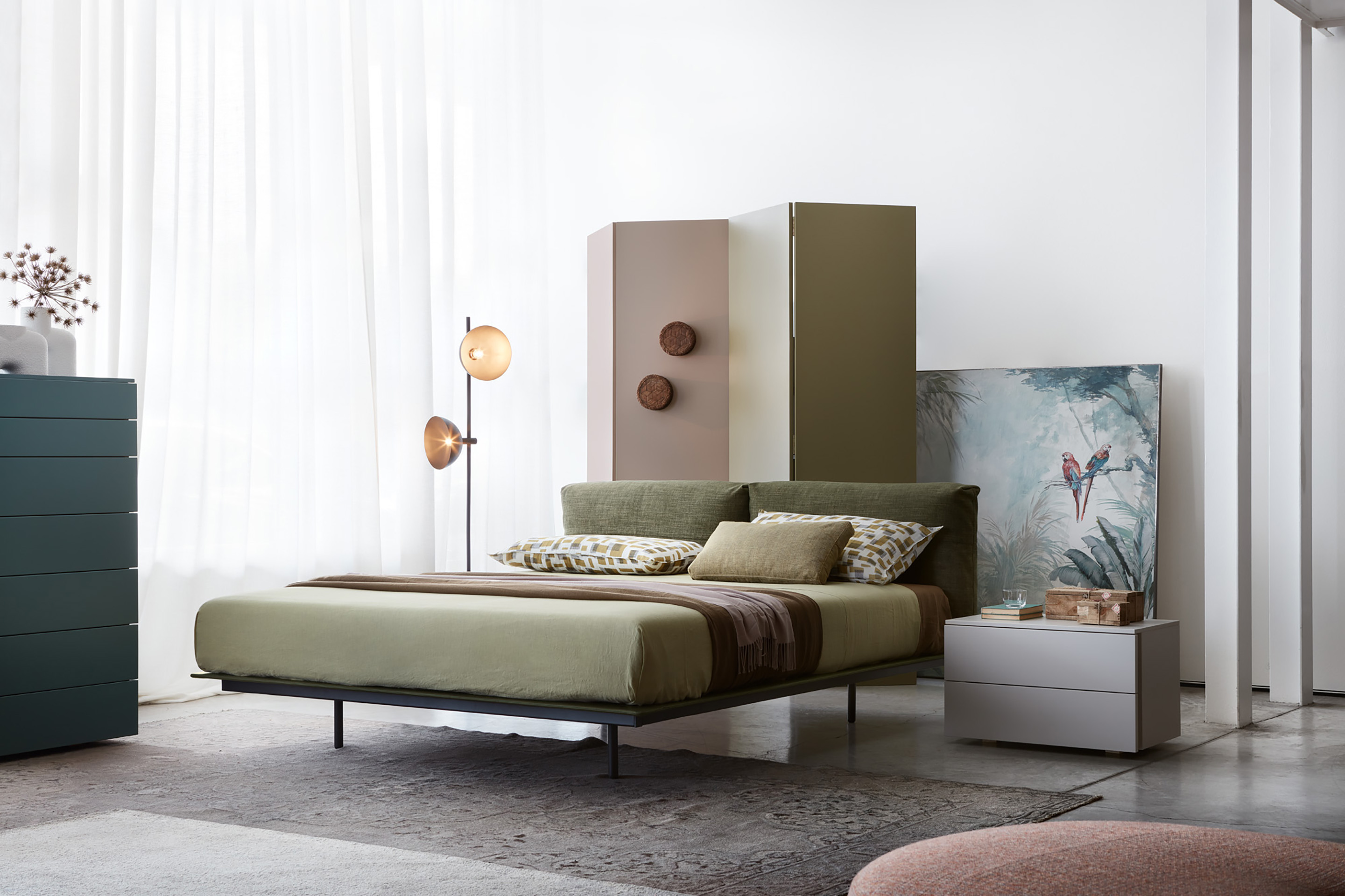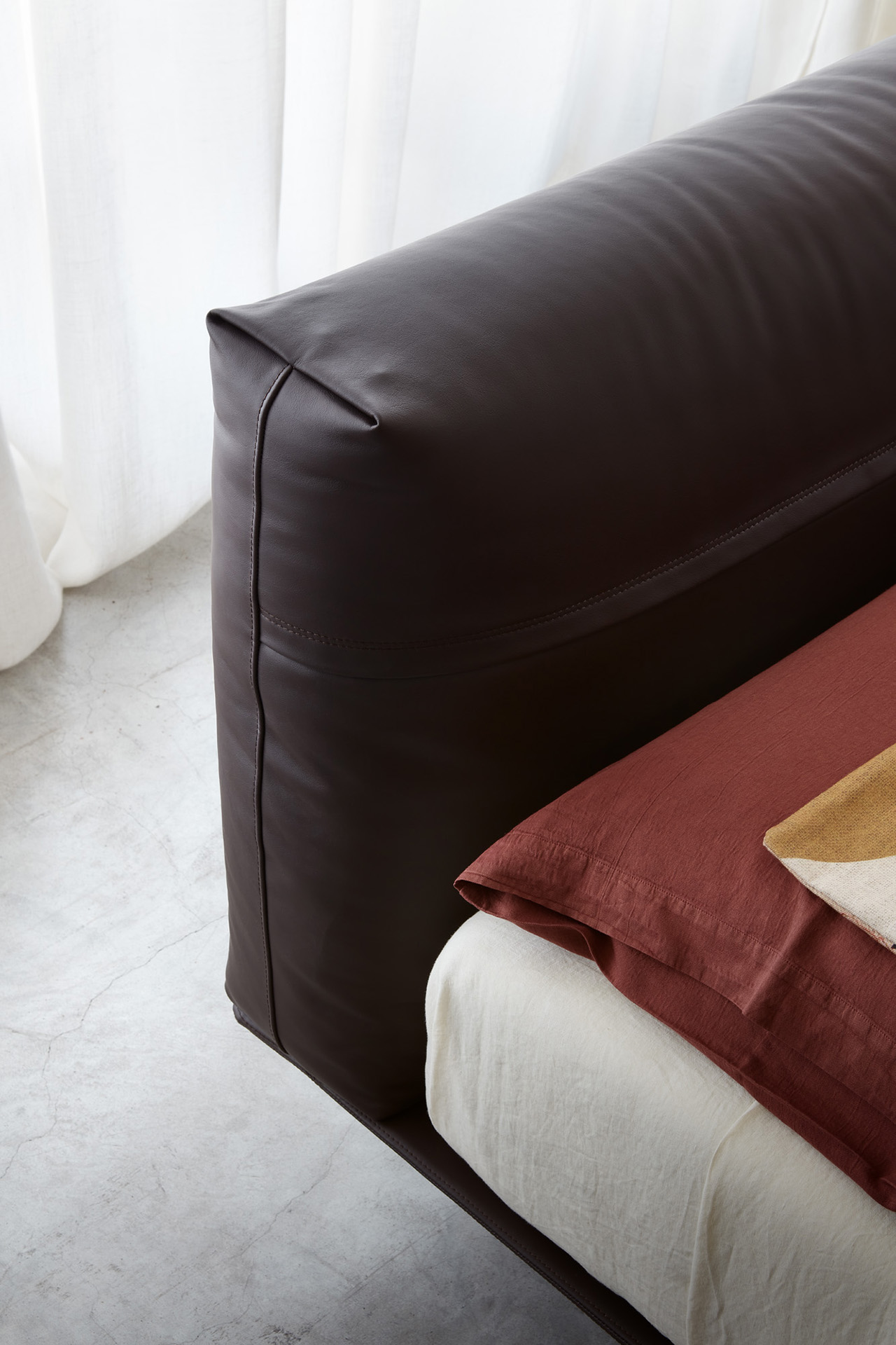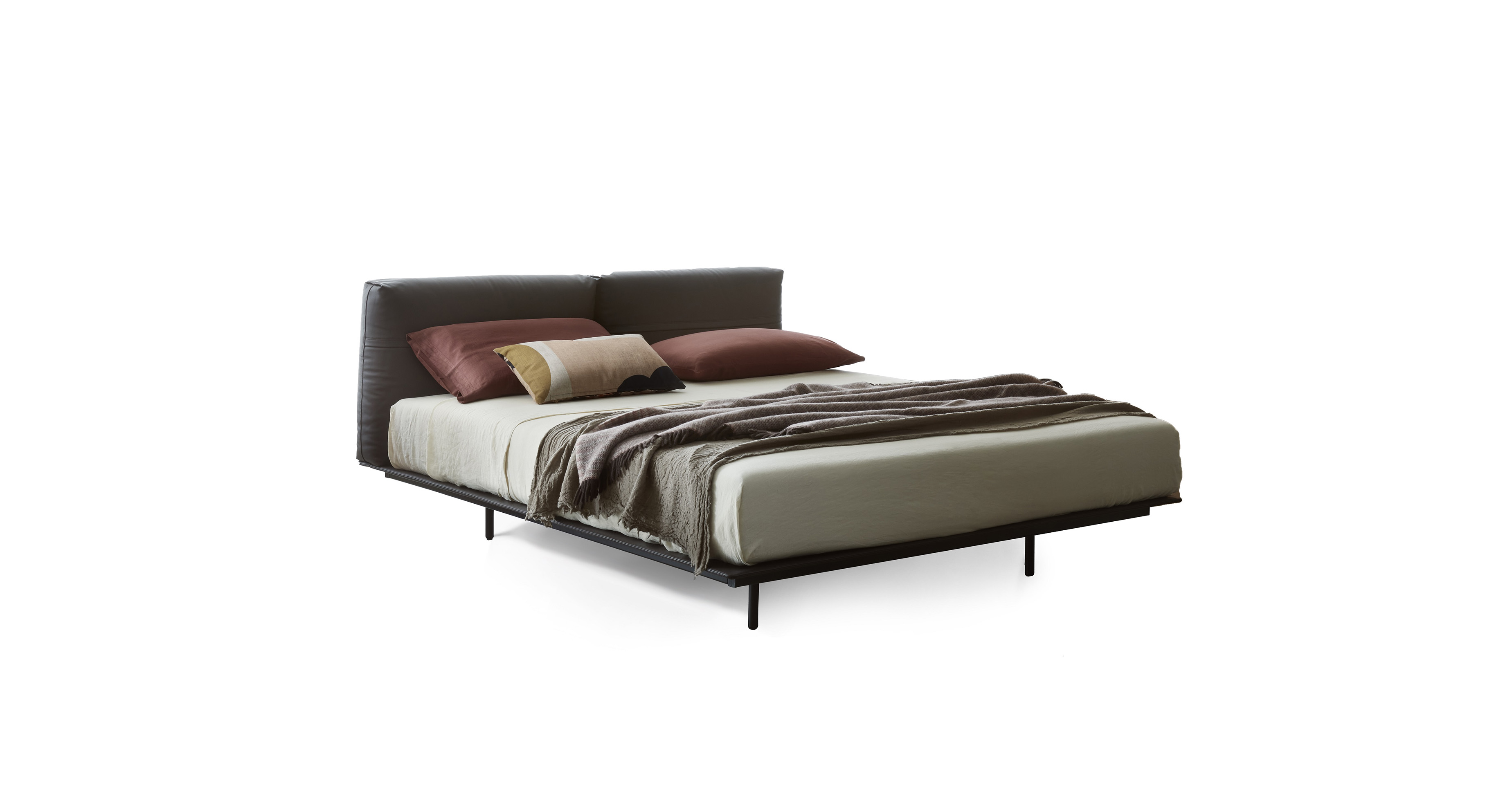 The MyNight bed features a mattress with bold volumes set against a minimalist base, creating a floating effect. Its soft headboard resembles a cozy sofa, with customizable cushions in leather or fabric.