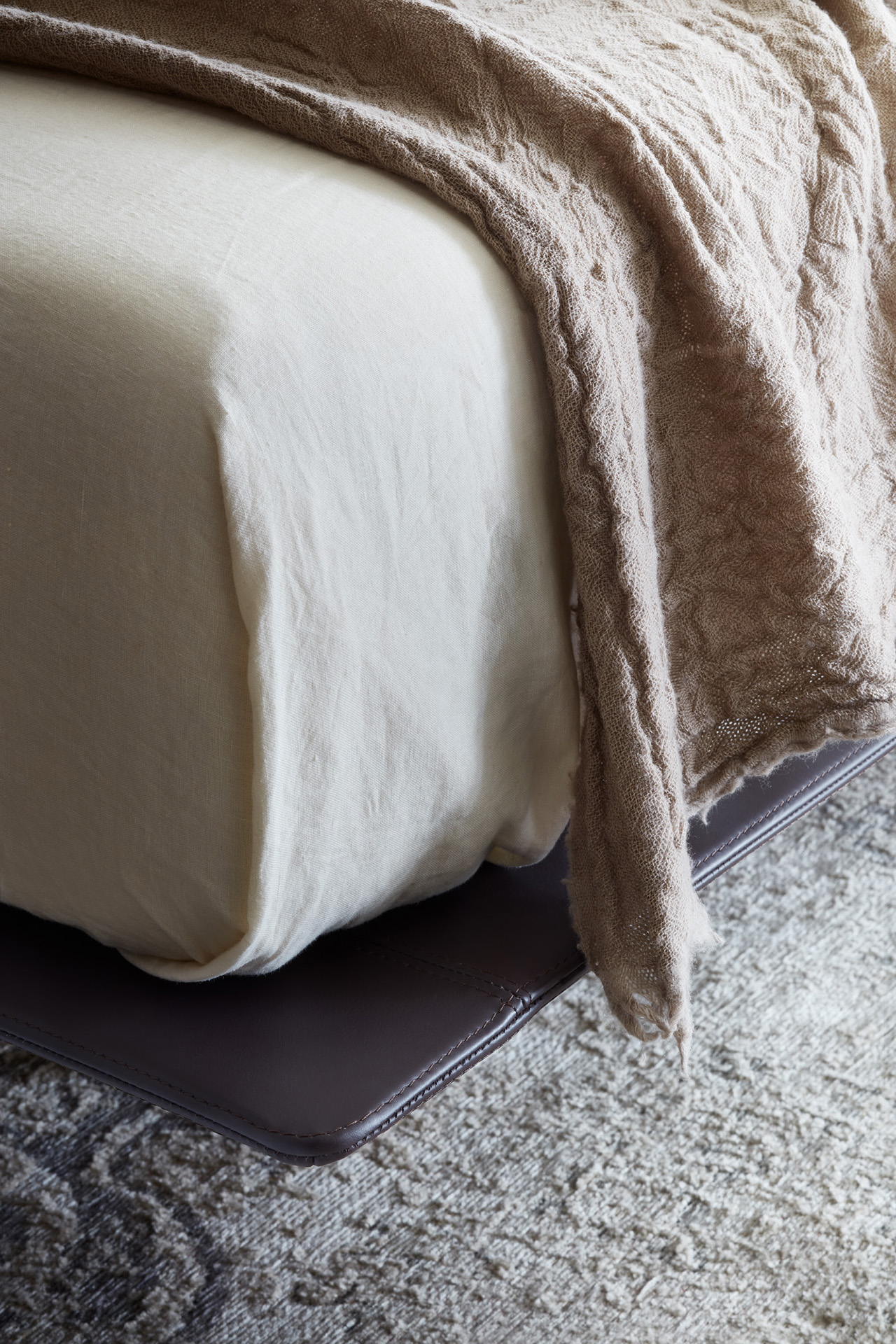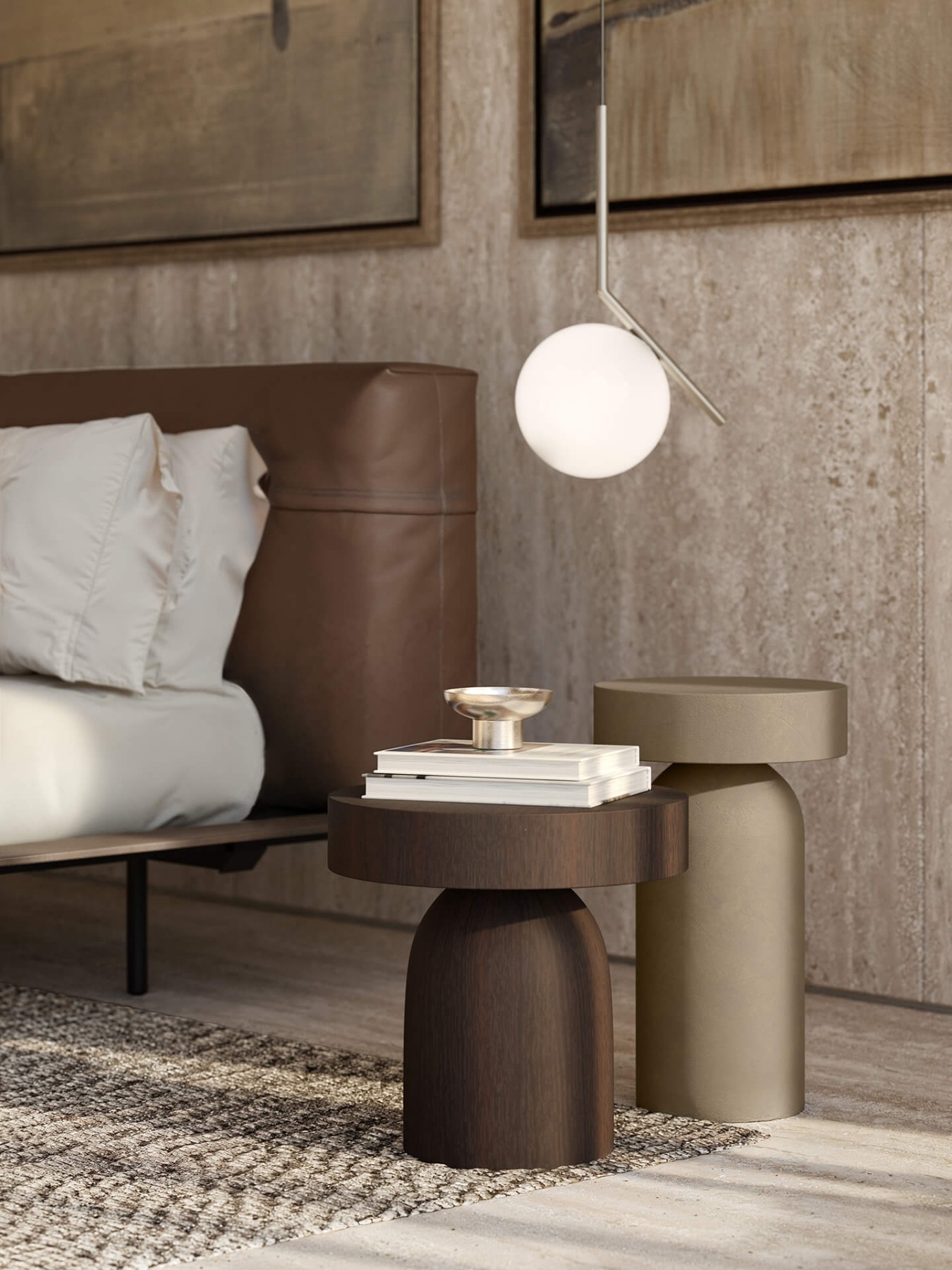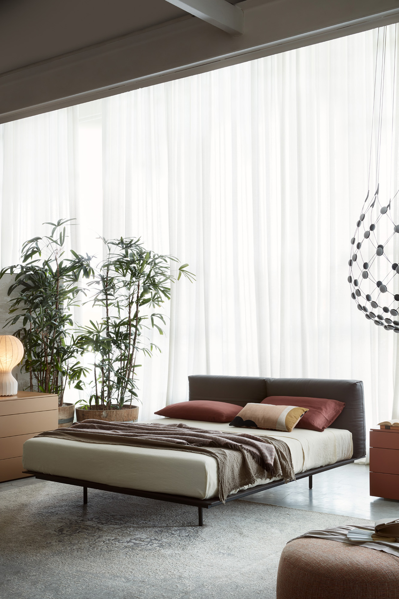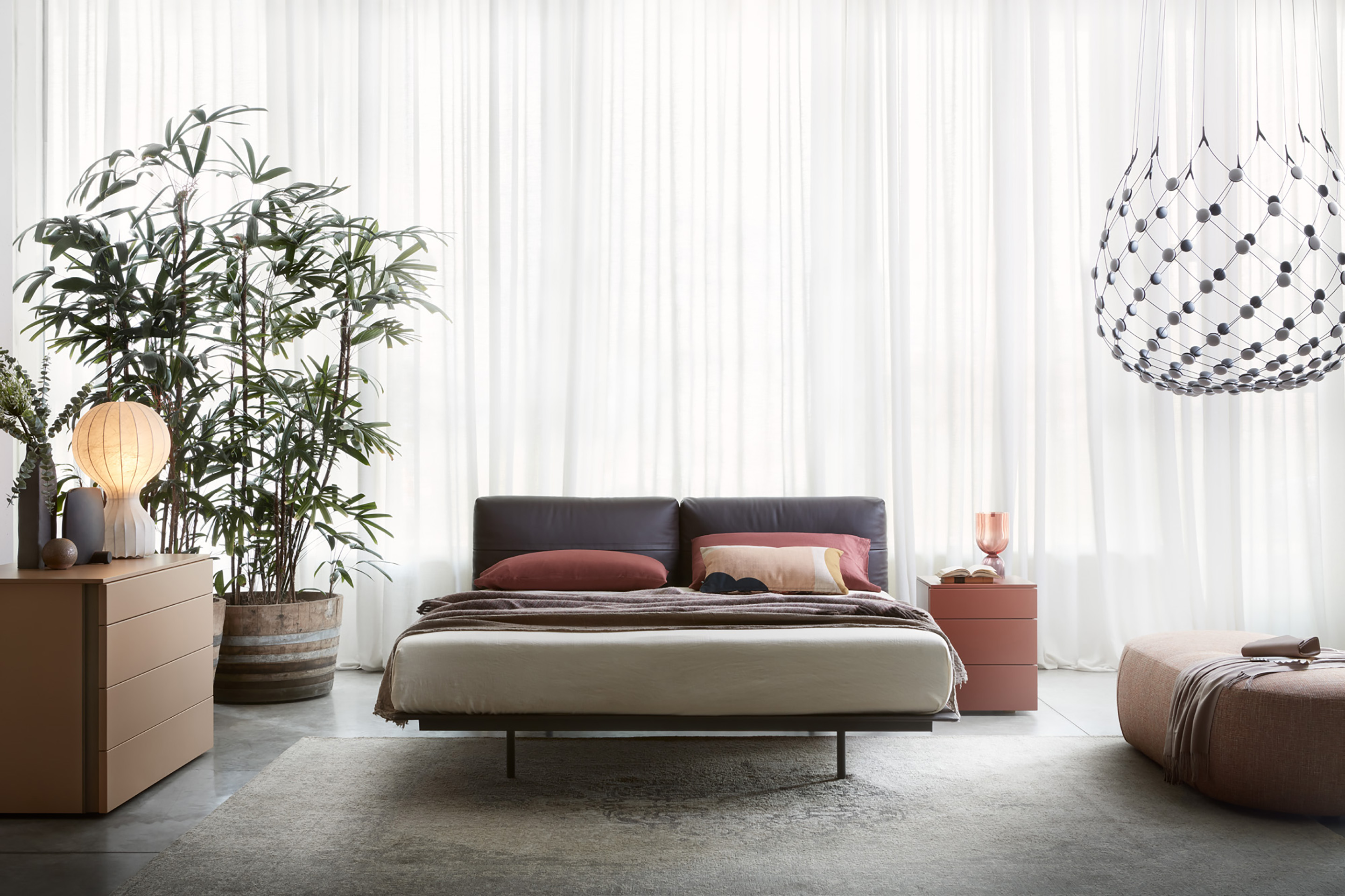 The MyNight bed features a mattress with bold volumes set against a minimalist base, creating a floating effect. Its soft headboard resembles a cozy sofa, with customizable cushions in leather or fabric.