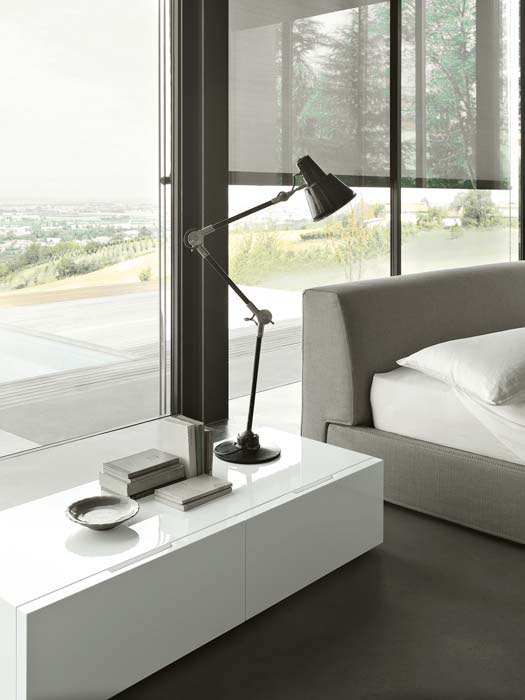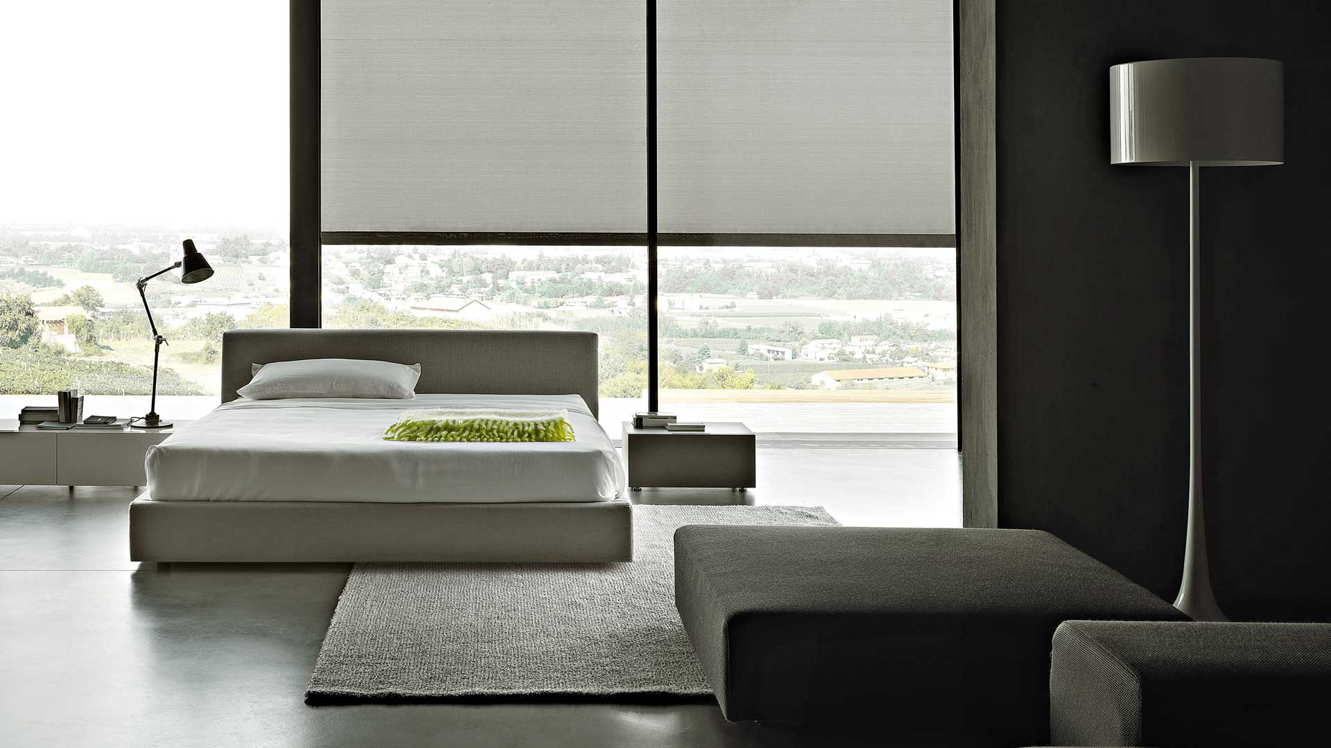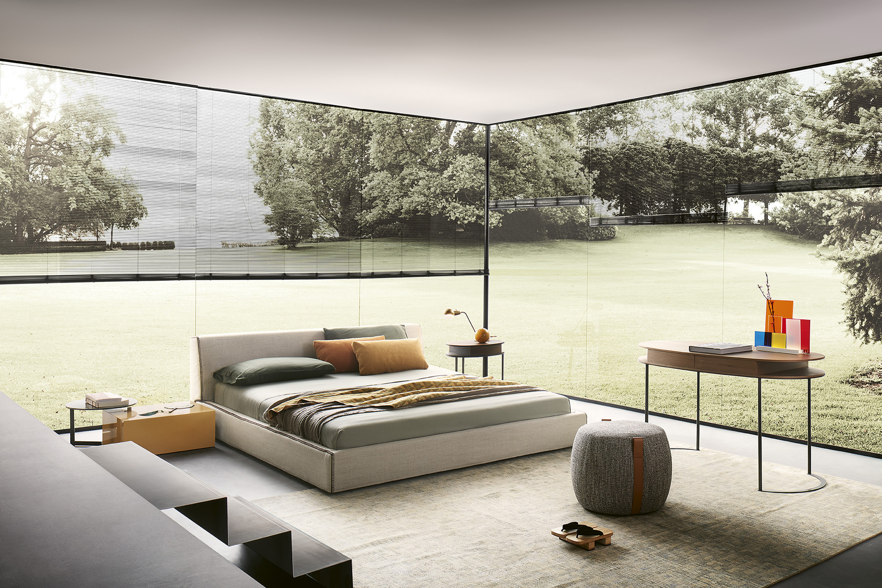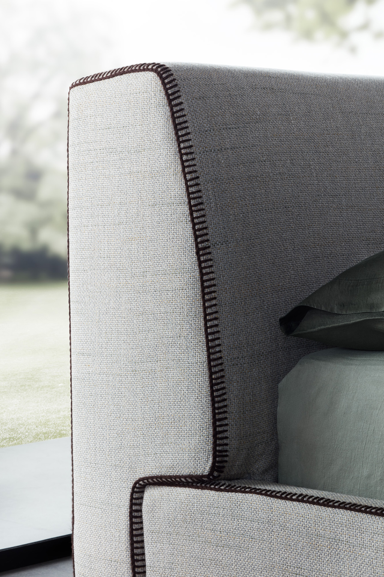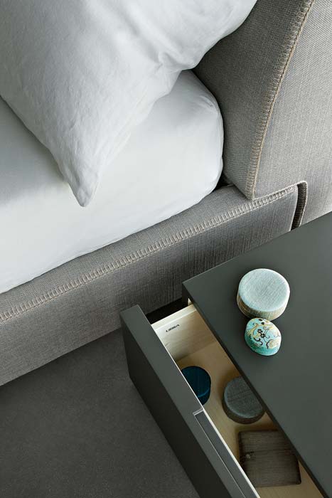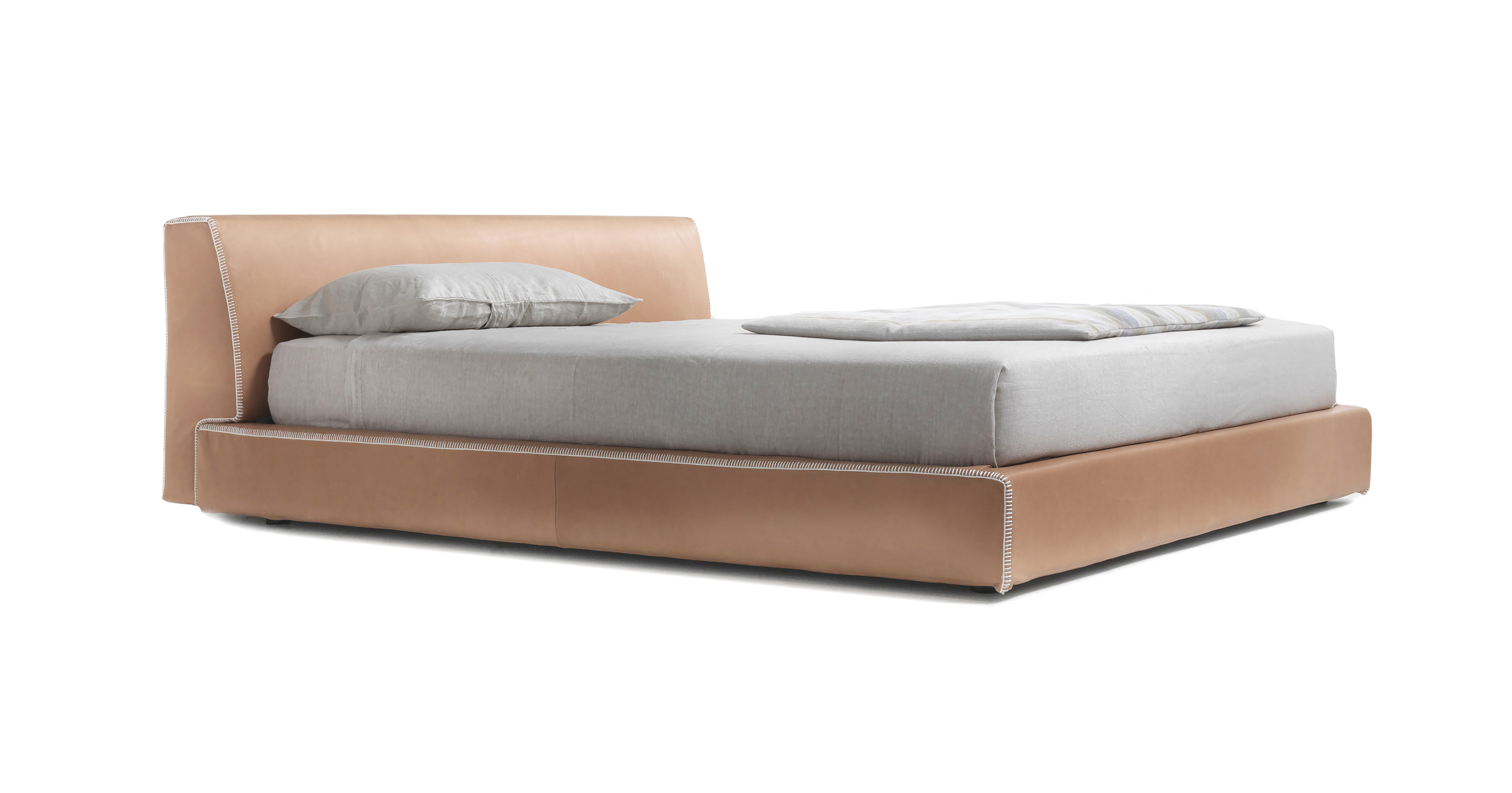 The linear design of the Softland double bed is characterised by its leather or fabric upholstered frame. The design is embellished with a contrasting blanket stitch emphasizing the bed frame’s form.
