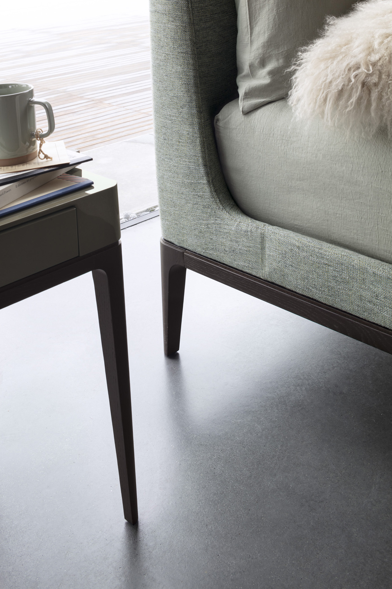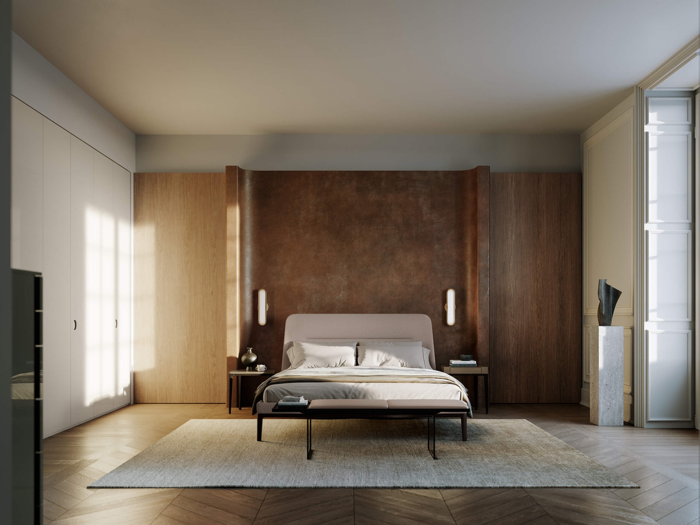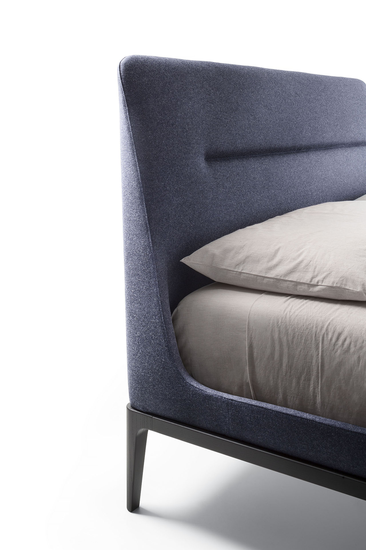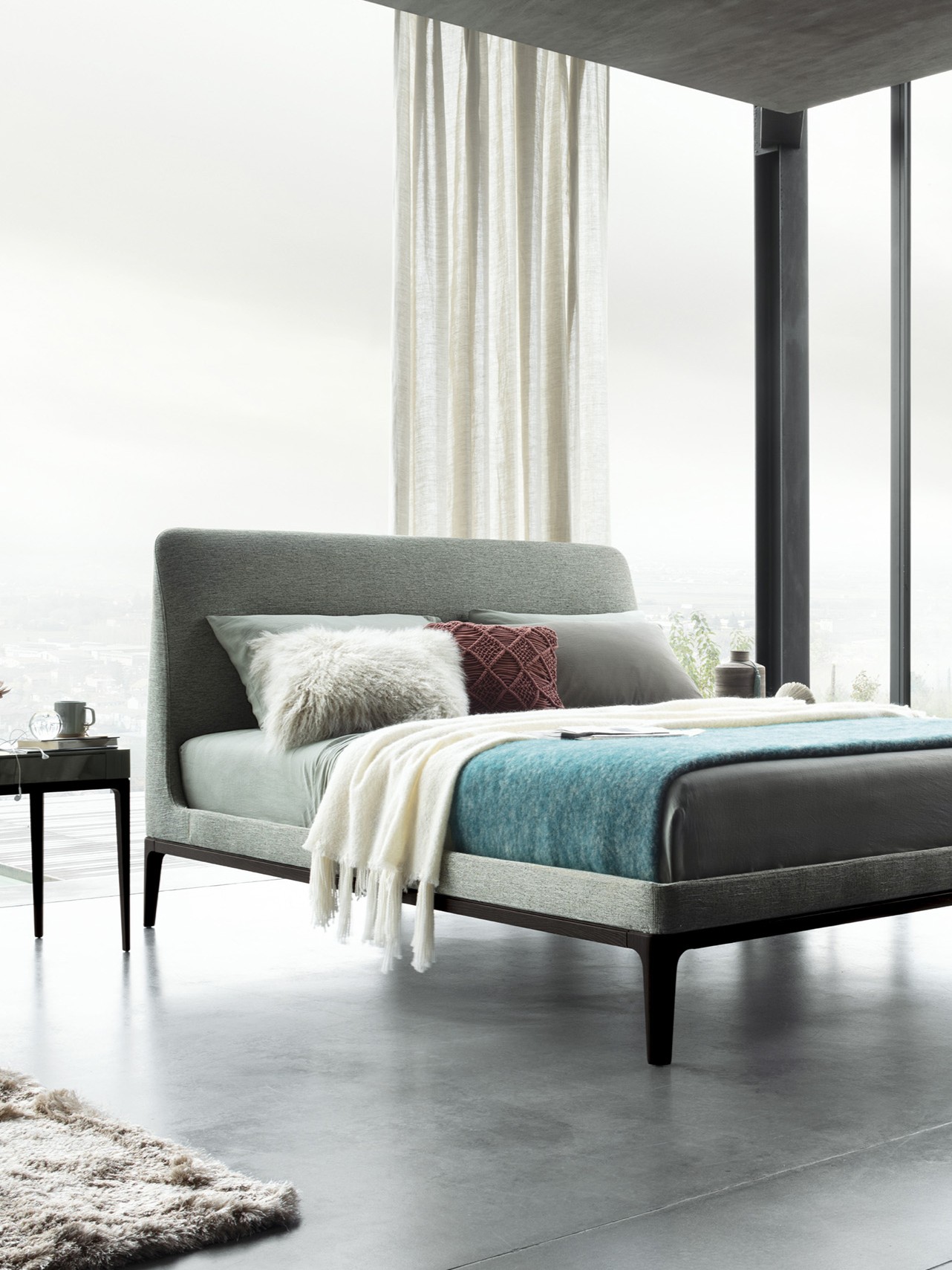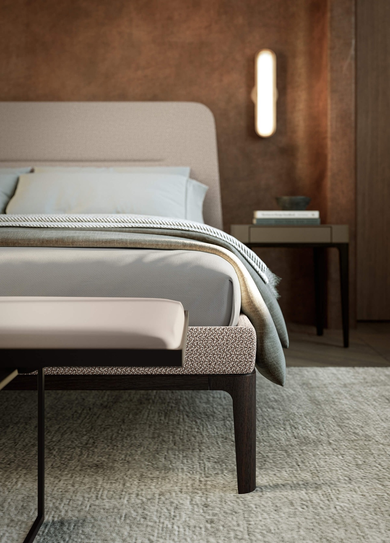 Inspired by the past’s stylistic elements and fused with a contemporary flair, Victoriano is an upholstered bed with a solid wood structure. Its high headboard, slightly curved at the sides to accommodate the mattress and embellished by central topstitching, is connected to the bed frame by a continuous, gentle line. This is a classical bed that graces any modern environment.