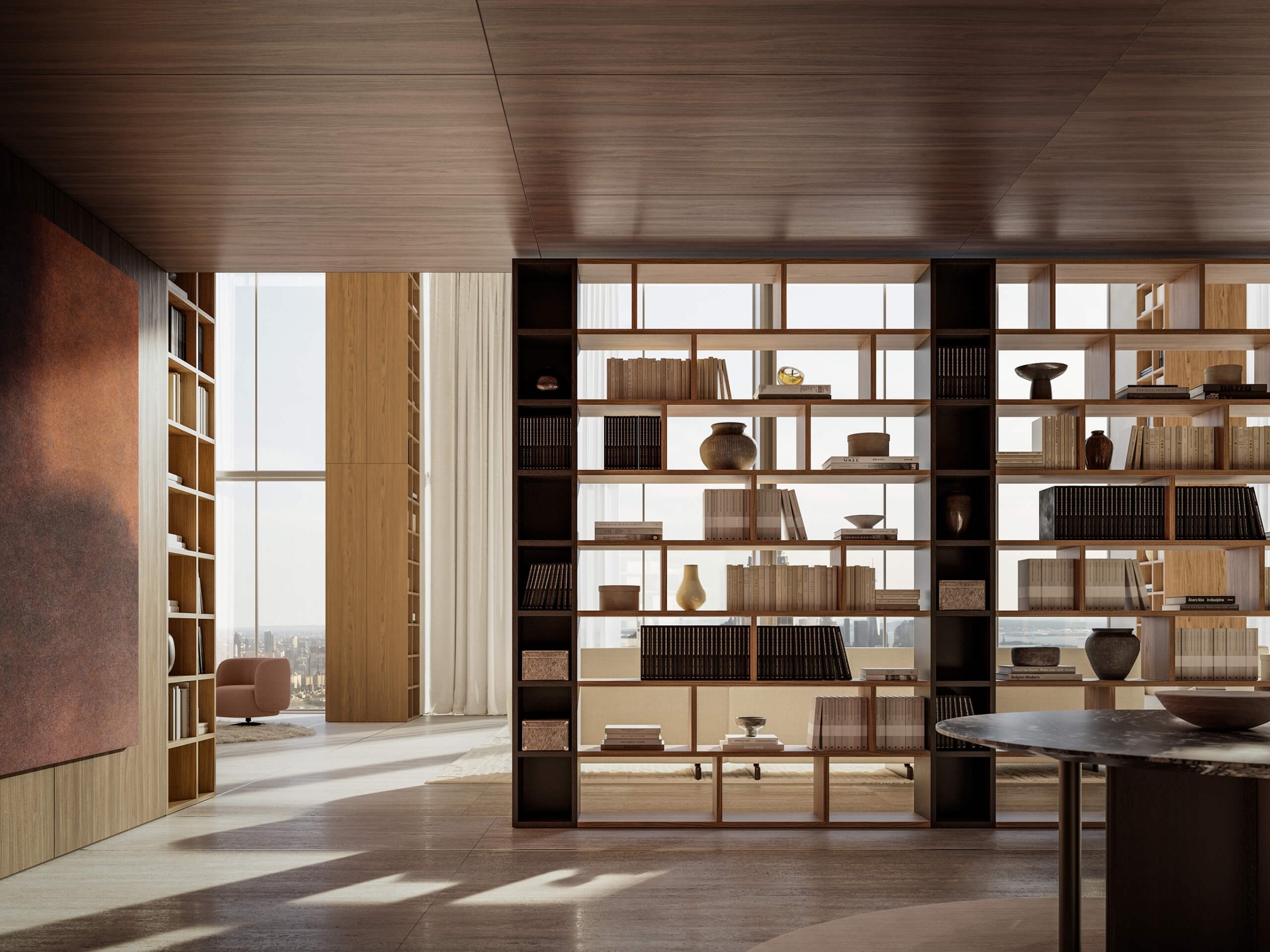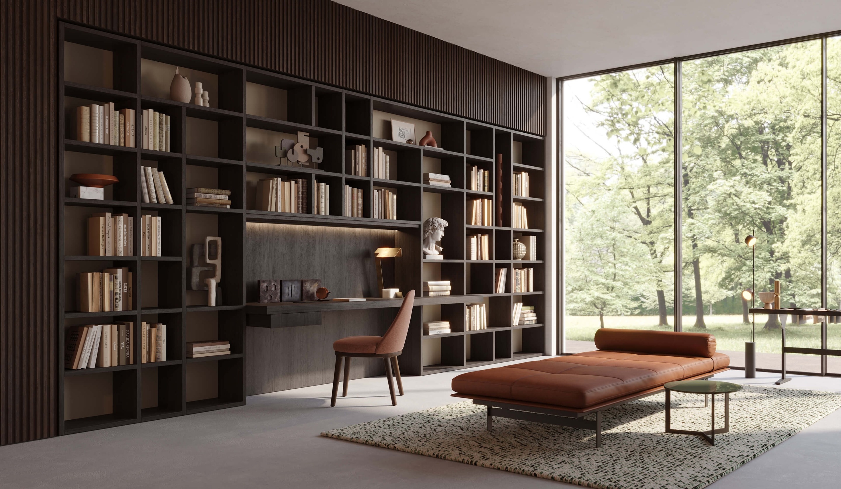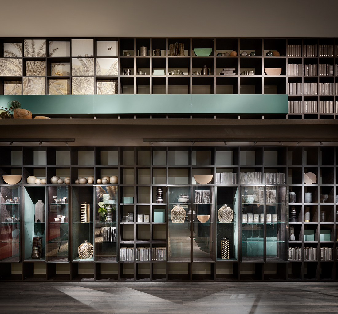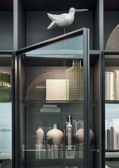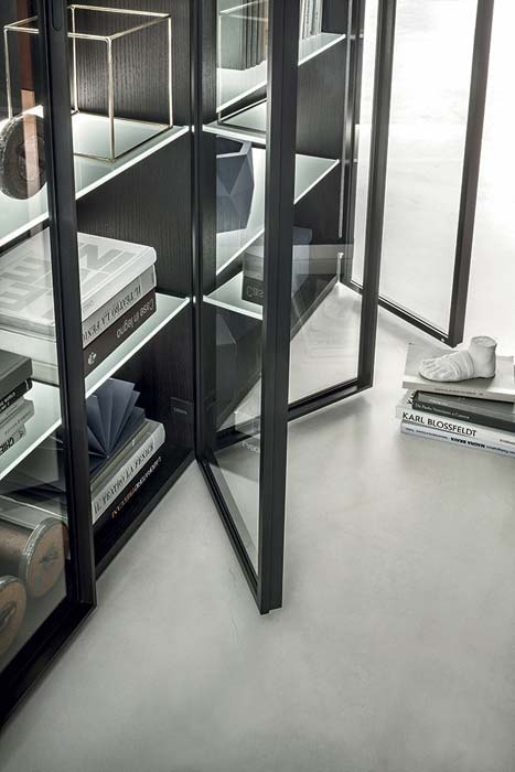 Designed by Lema in 1978, Selecta Noce L is the evolution of the first Italian freestanding system. It was the first product to join the details of wood craftsmanship with a series of technical innovations that makes it one of the most versatile products today. With many compositions available, Selecta Noce L perfectly blends contemporary design with industrial processes. Throughout the years, Selecta Noce L kept on reinventing itself with new finishes and elements that adapt to today’s living spaces, satisfying every aesthetic and functional needs. With over 1500 elements in the vast catalogue, all in a variety of finishes and bespoke touches, the composition possibilities of Selecta are practically infinite. To the shelves there can be added doors and containers to ensure a variety of uses. Wooden shelves with integrated lighting system with minimum encumbrance (11mm) which adhere to the backing, for a pleasant soft light. To enrich the project, GLANCE can also be integrated, elegant glass cabinets, available in double and angular versions, with the structure in bronze and extra clear glass. This has been designed together with Matteo Nunziati, recapturing the style of the glass cabinets and cupboards which he has designed in the past. For those who look for a storage library, the spaces with velvet backing and glass shelves entrust the most precious objects.