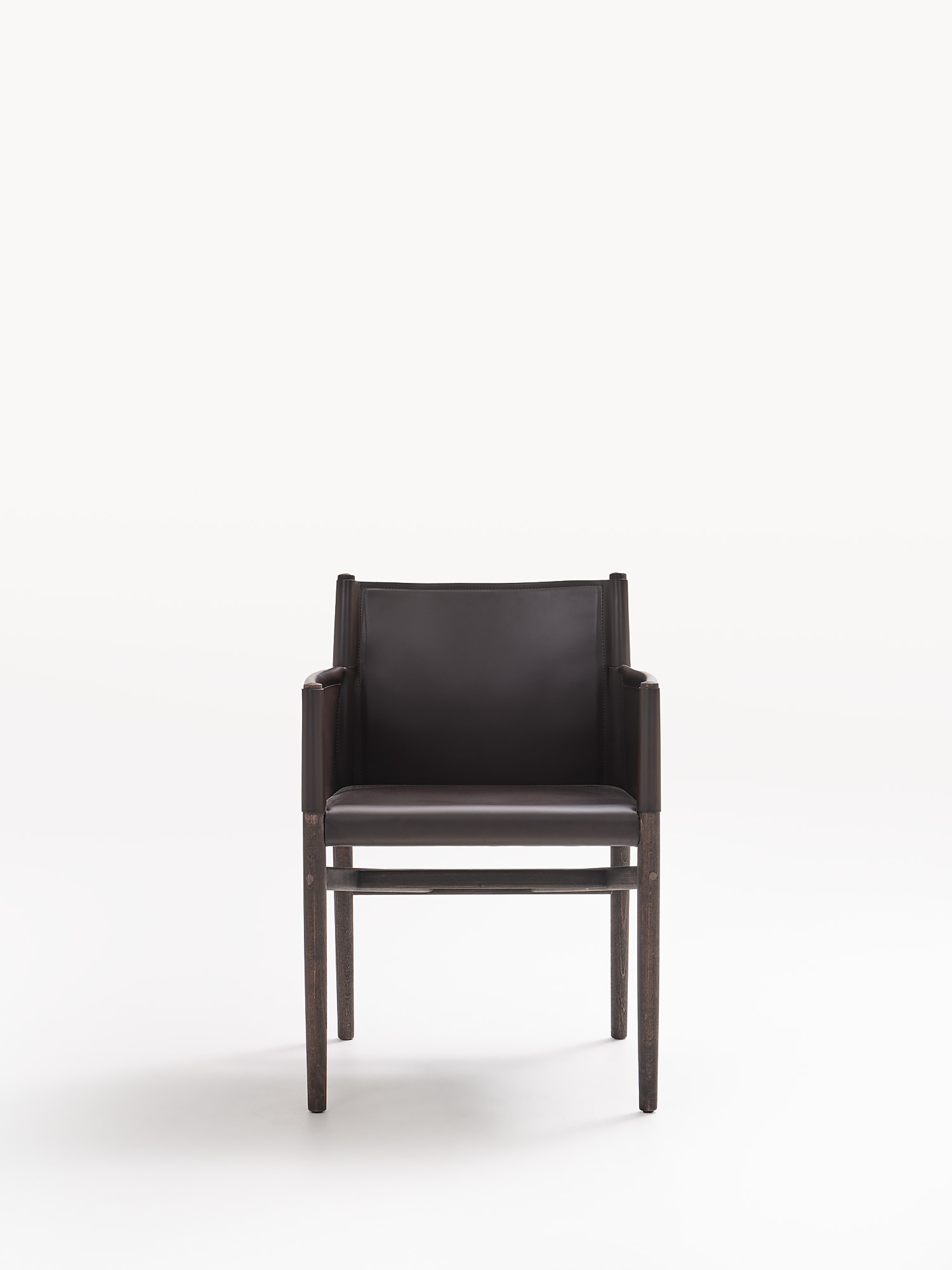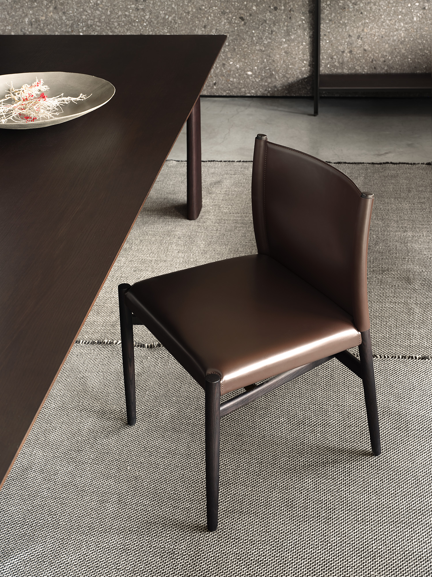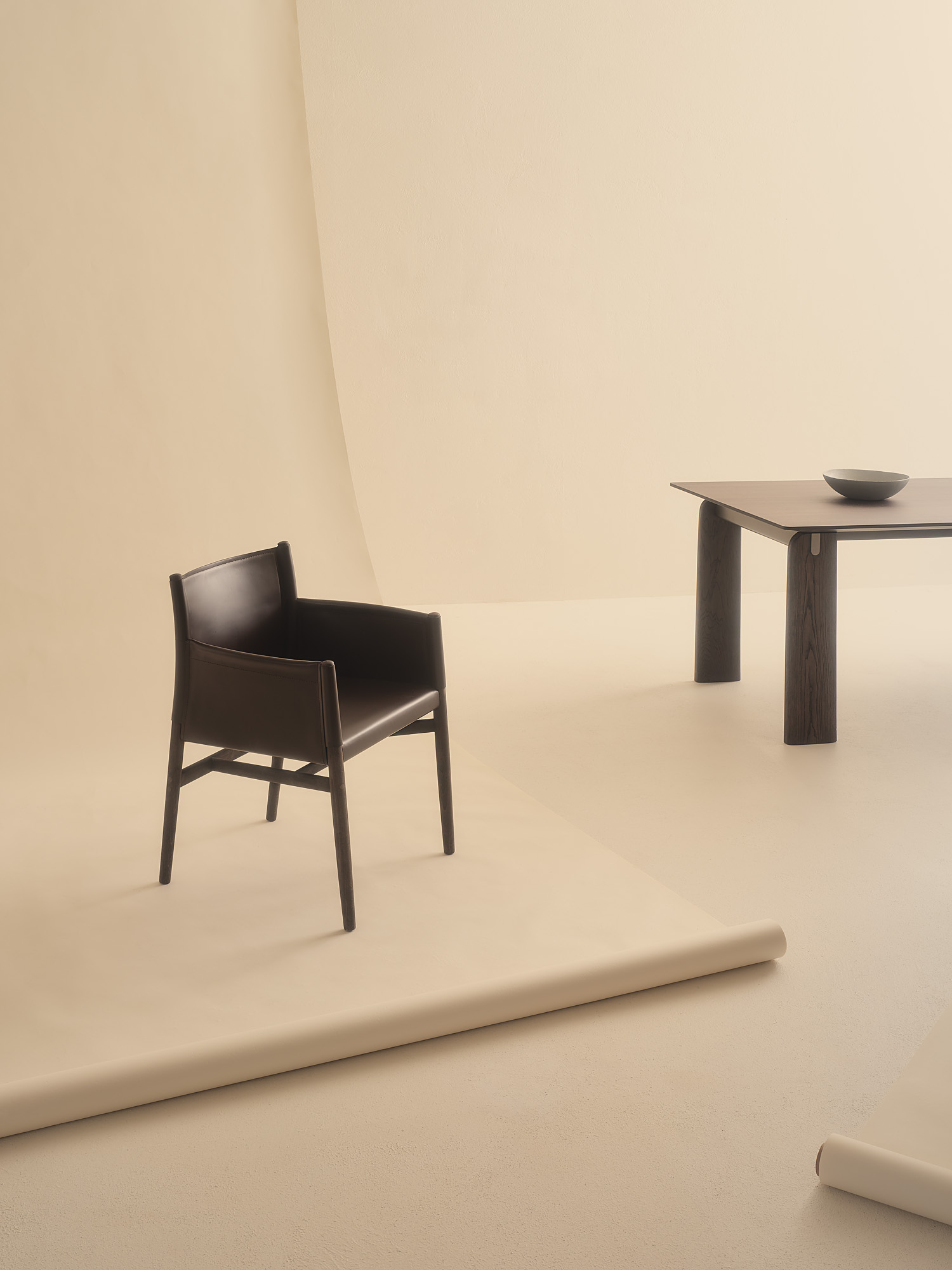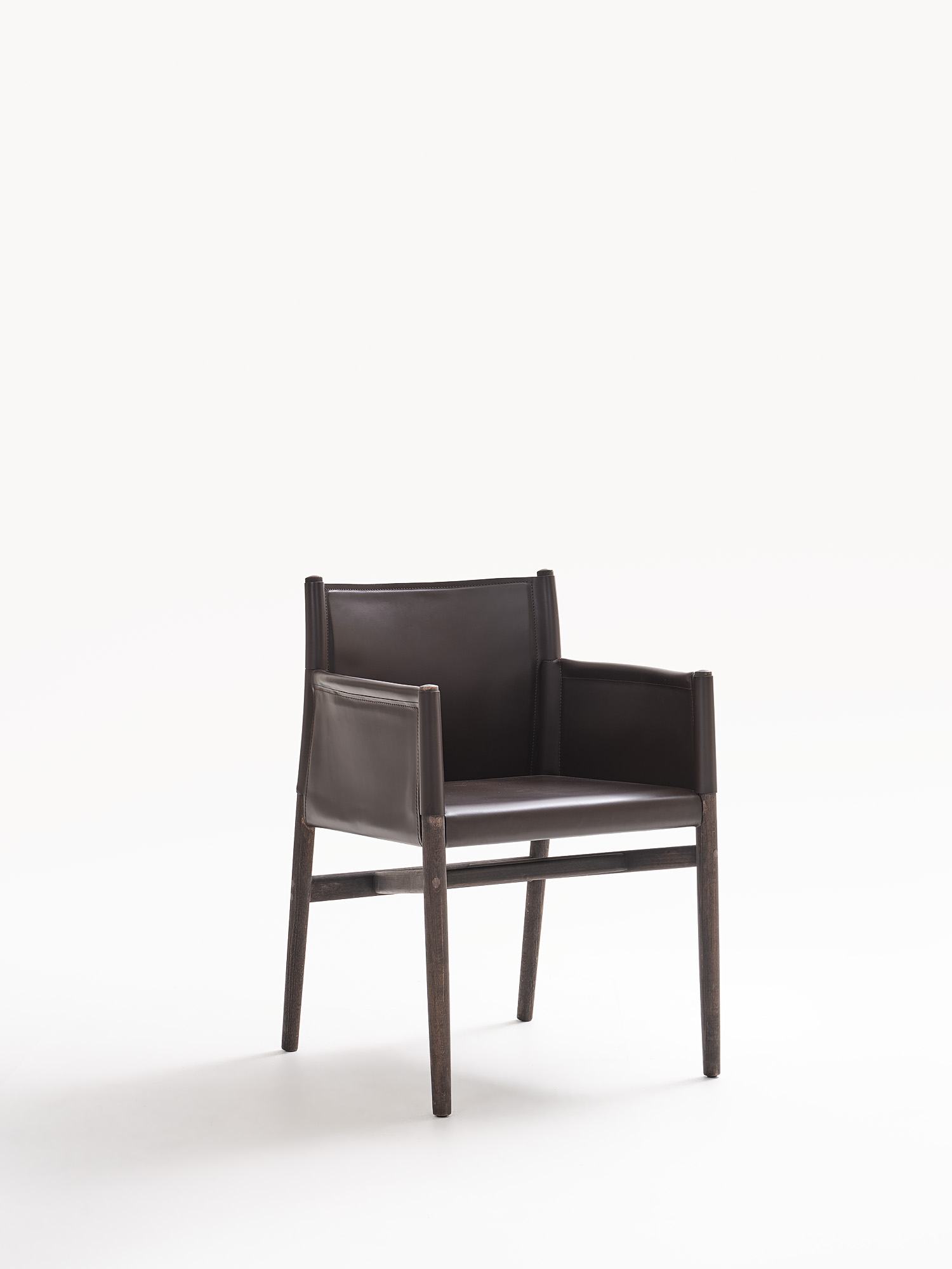 Ayon, by Gabriele and Oscar Buratti, blends artisanal charm with industrial precision. Wrapped in light leather and set on an ash wood frame, it offers comfort with refined detailing—visible stitching and a thermotreated oak stain that enhances the natural grain. Available with or without armrests, Ayon comes in a wide palette of shades, making it a versatile and elegant seating choice.