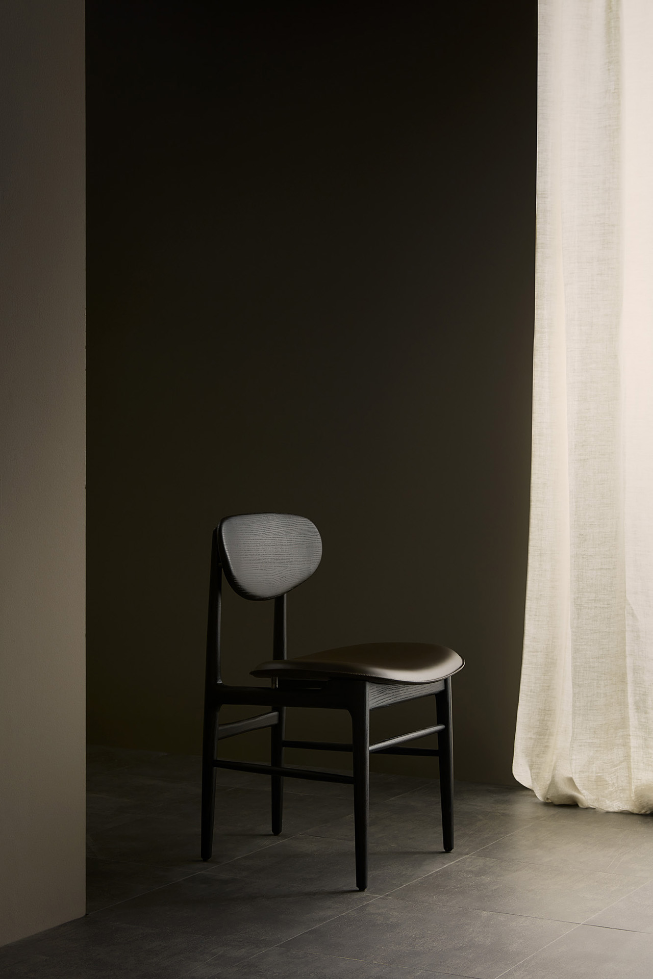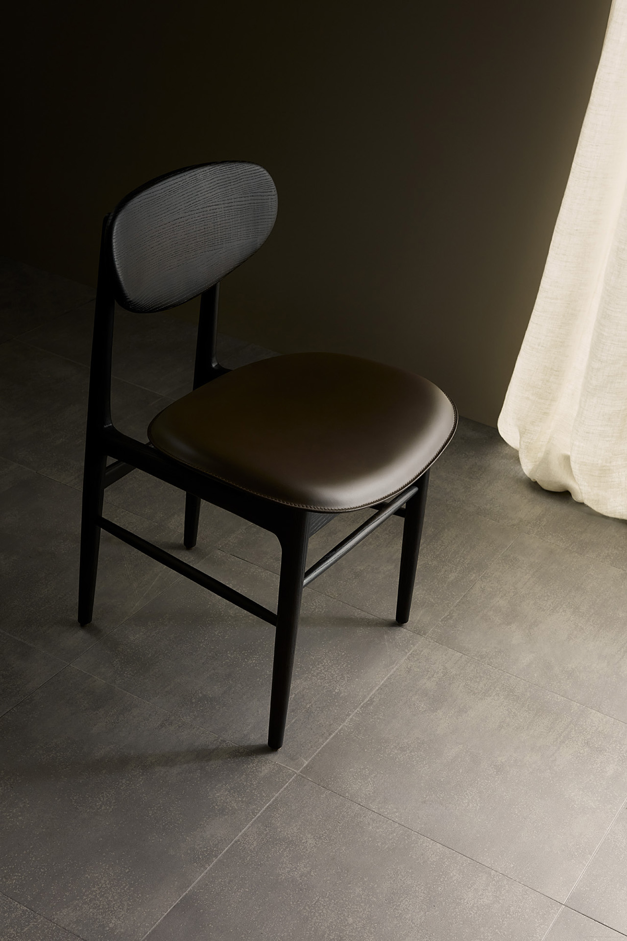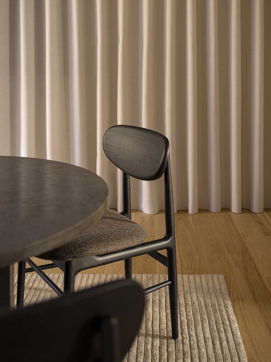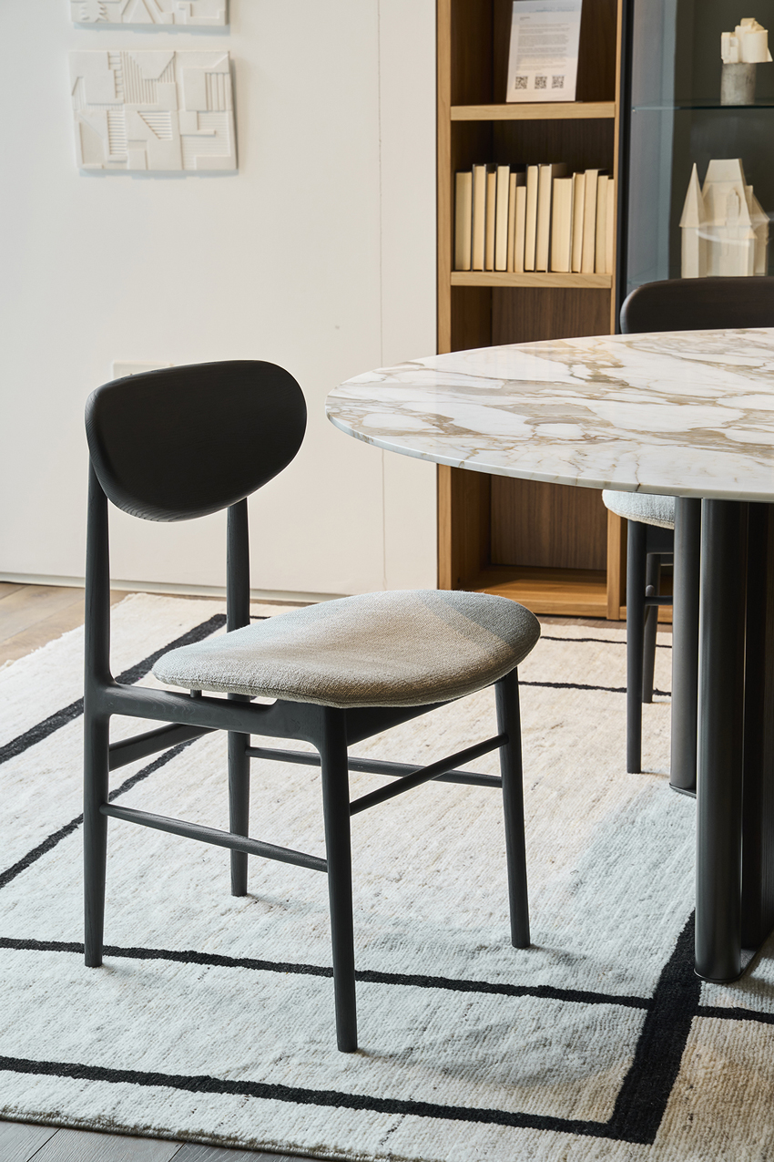 The Fred dining chair blends meticulous craftsmanship with mid-century Italian style, featuring a solid wood backrest and flexible upholstered seat for unexpected comfort and elegant minimalism.