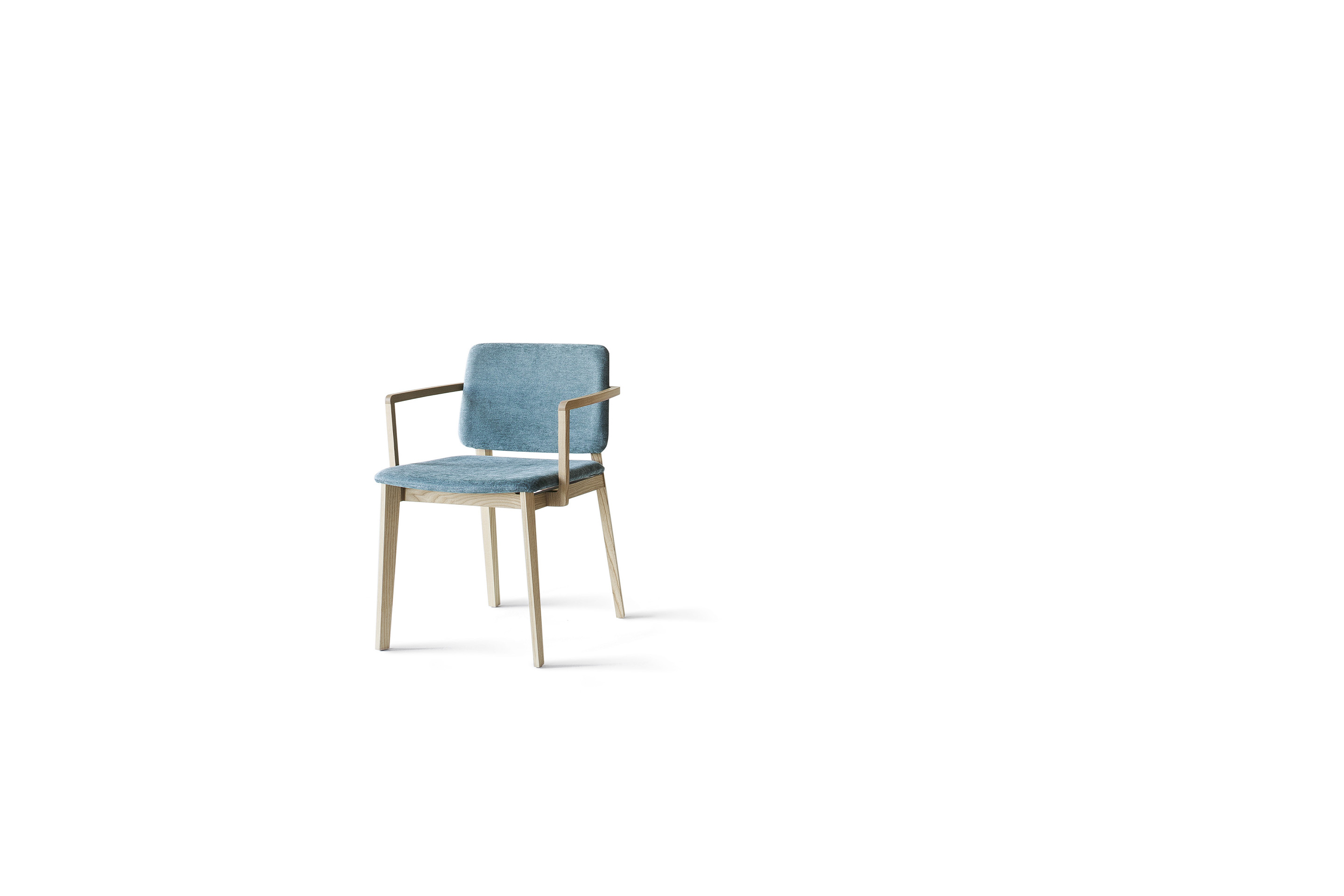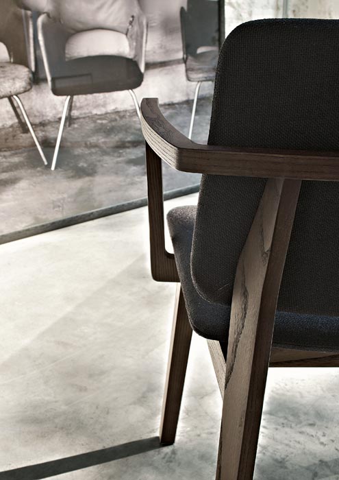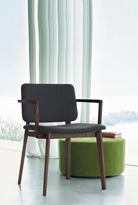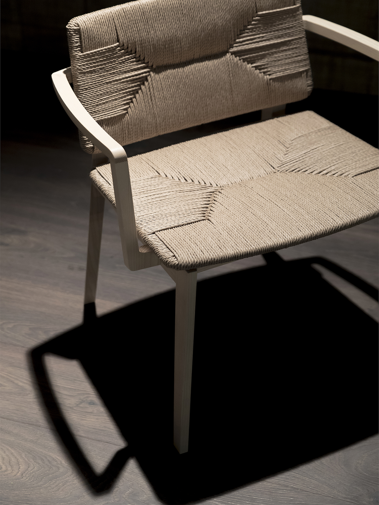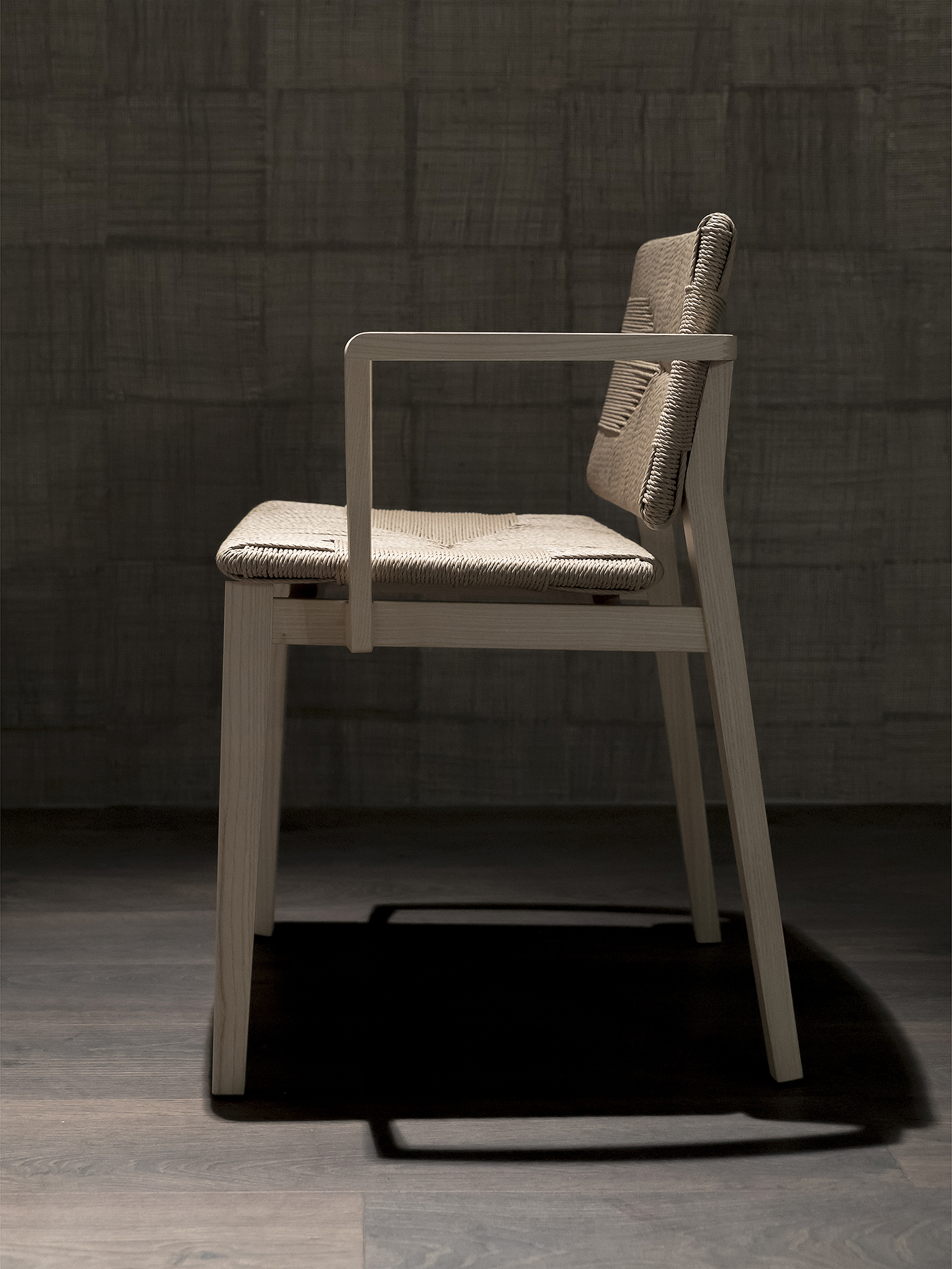 The rigorous design of the Hati chair creates a linear yet warm-looking seat. Available in numerous variants: chair or armchair, with backrest and seating in fabric, leather, eco-leather, twine or entirely in wood.