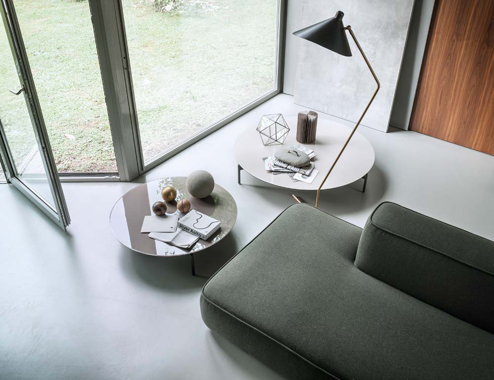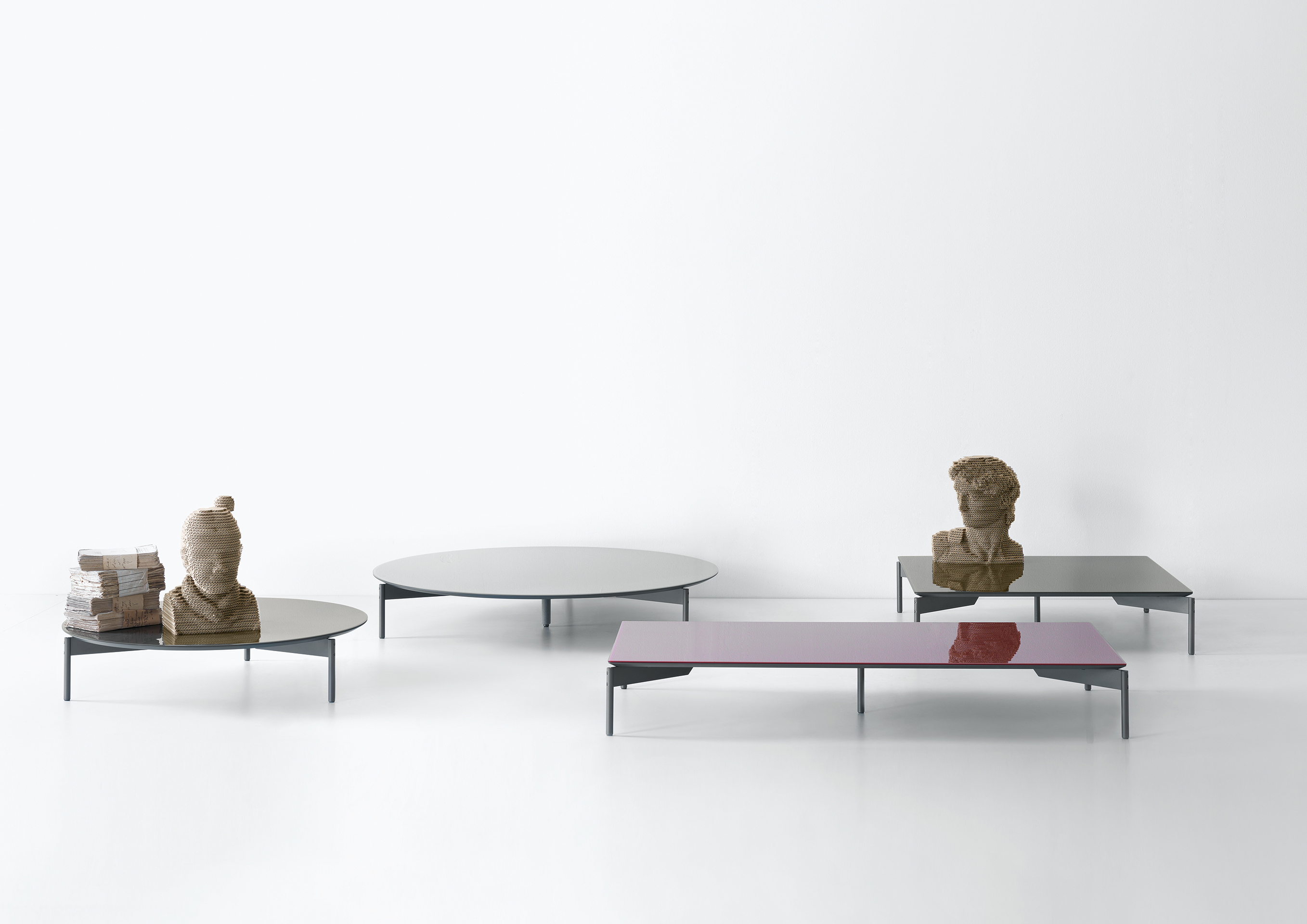 Timeless simplicity – the circle and the square – characterises the Cruise coffee table. The base supports the tabletop on which glass plates are placed with a ground border that creates a 1 mm-thick profile, conveying a visual lightness with an artisan flavour.