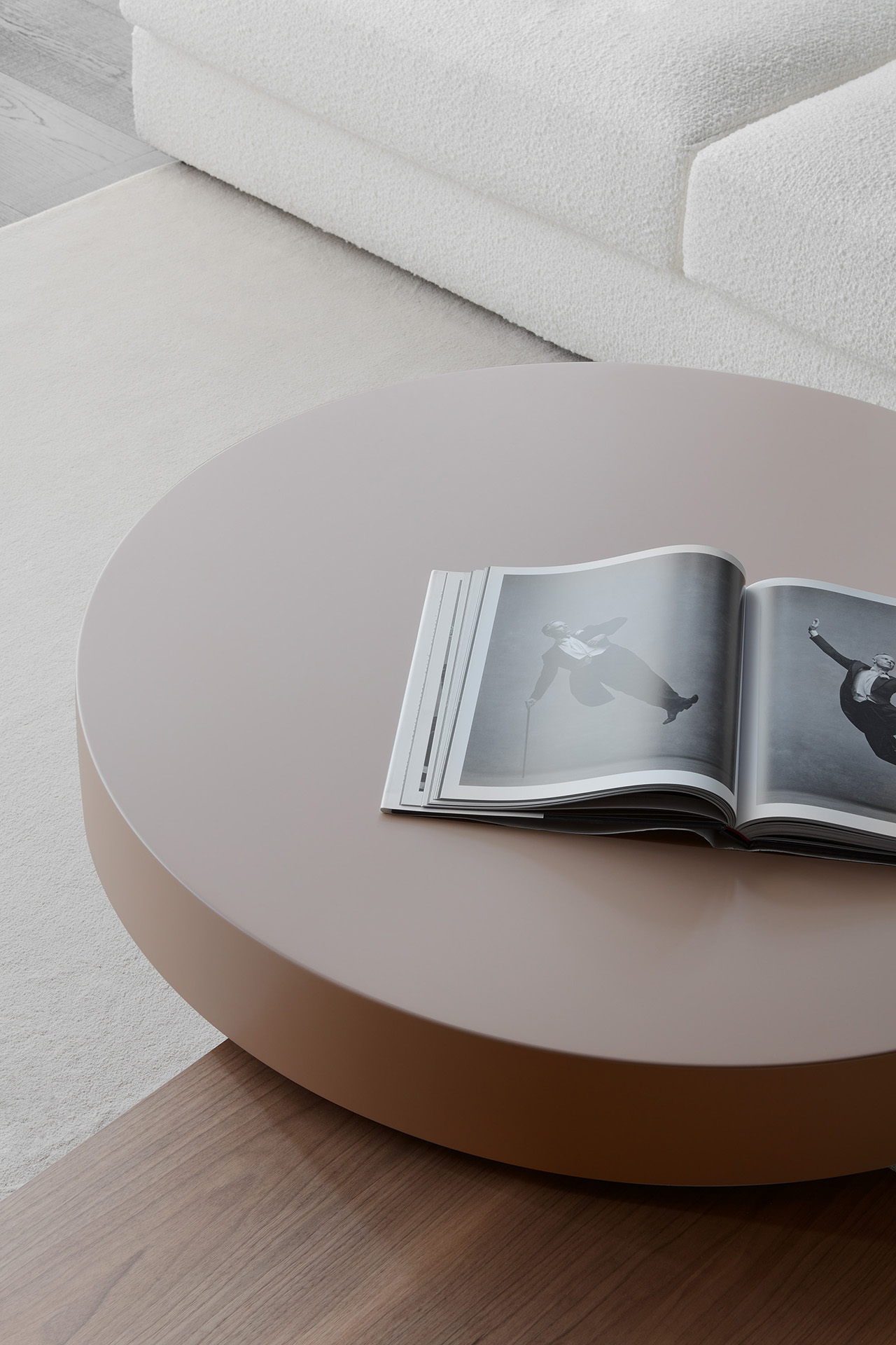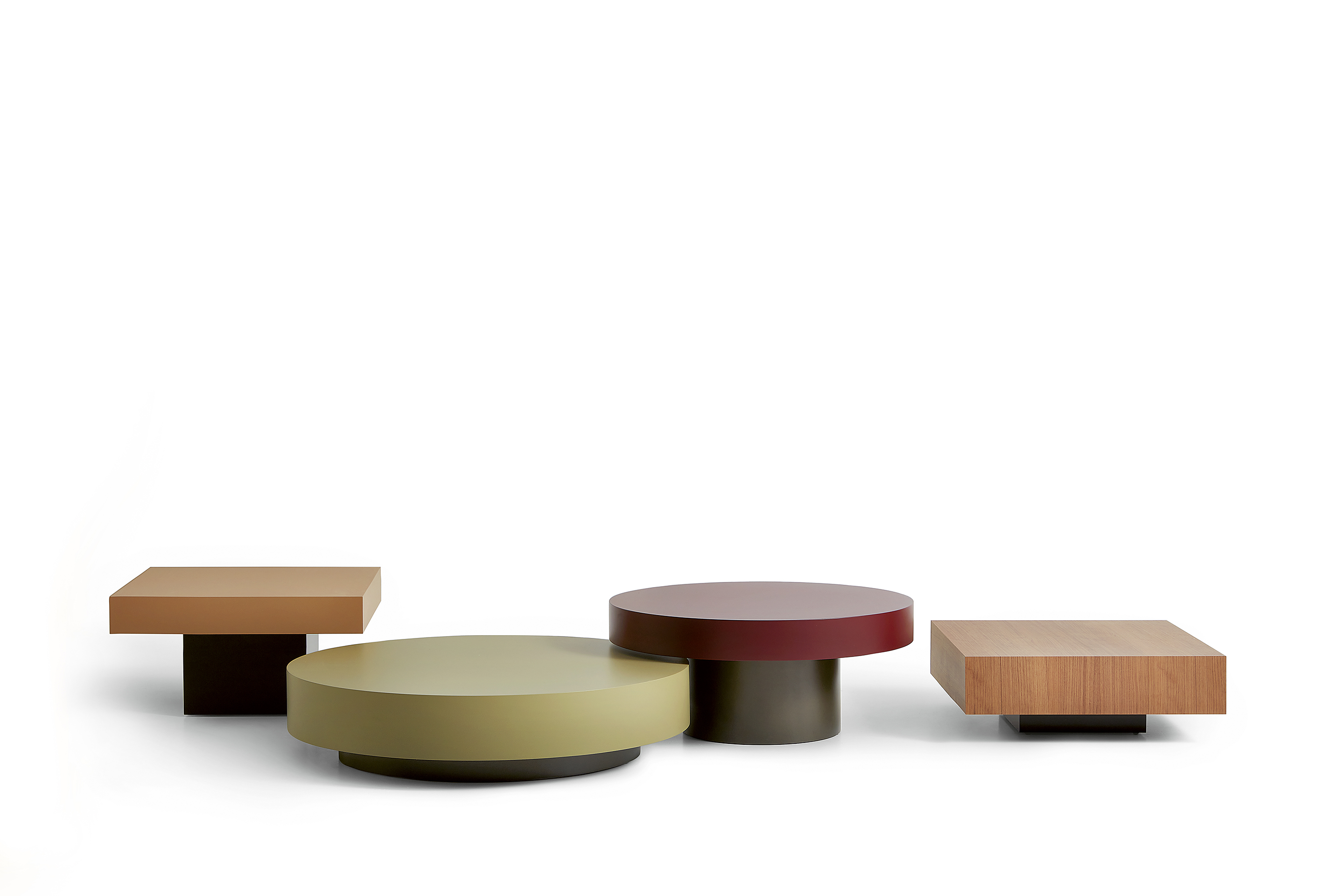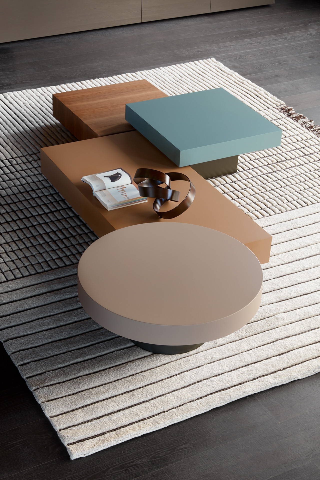 Dolmen coffee tables offer geometrically shaped tops - rectangular, square, or round - that can be freely arranged and combined. Featuring bronze-painted metal frames and options of matt lacquer or wood tops.