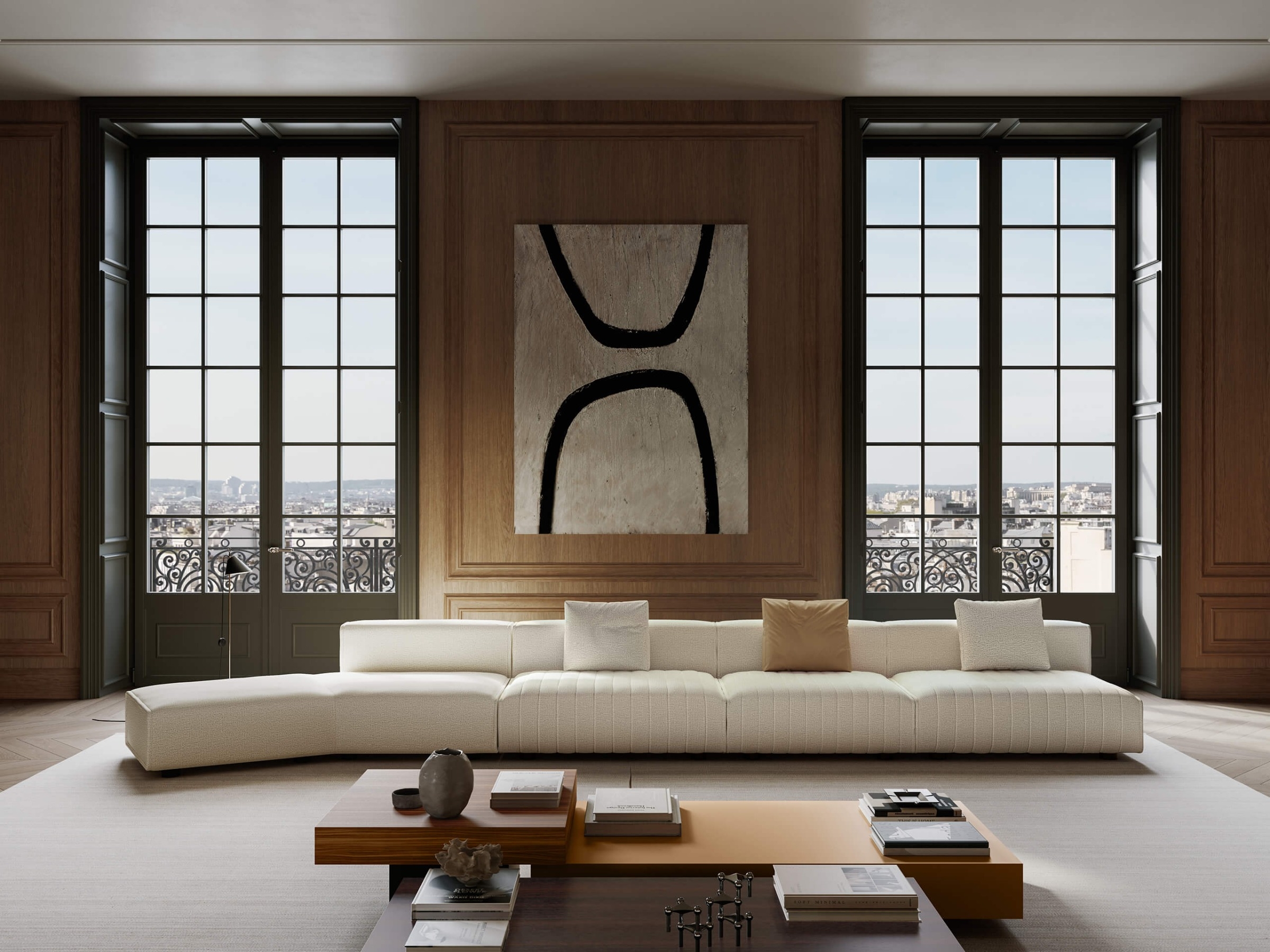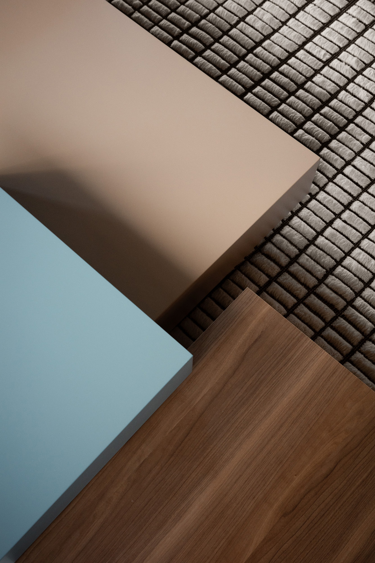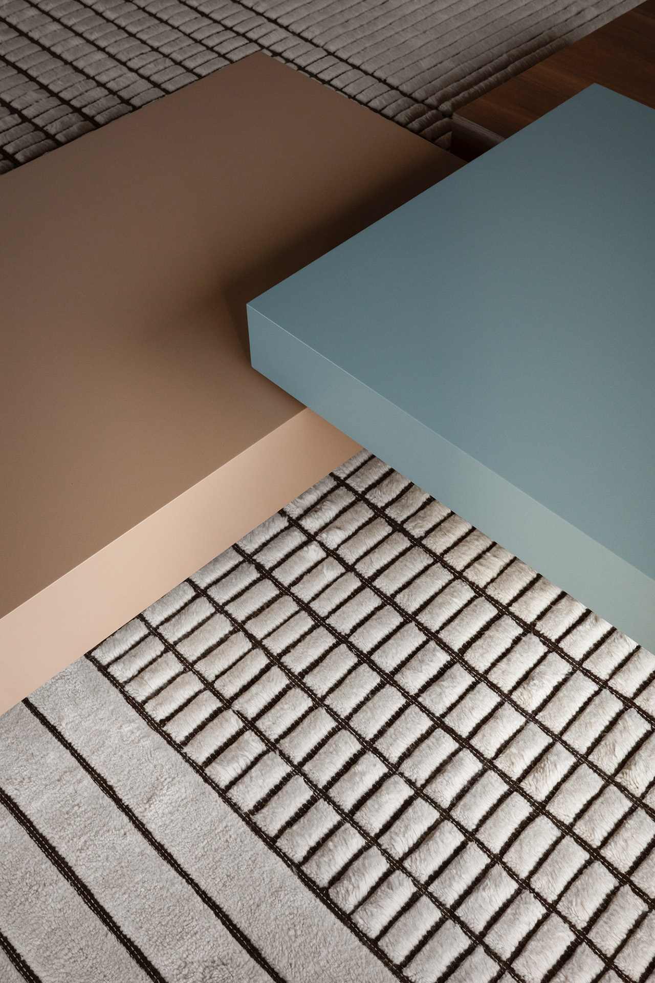 Dolmen coffee tables offer geometrically shaped tops - rectangular, square, or round - that can be freely arranged and combined. Featuring bronze-painted metal frames and options of matt lacquer or wood tops.