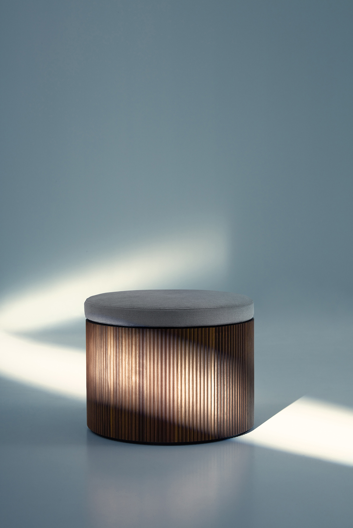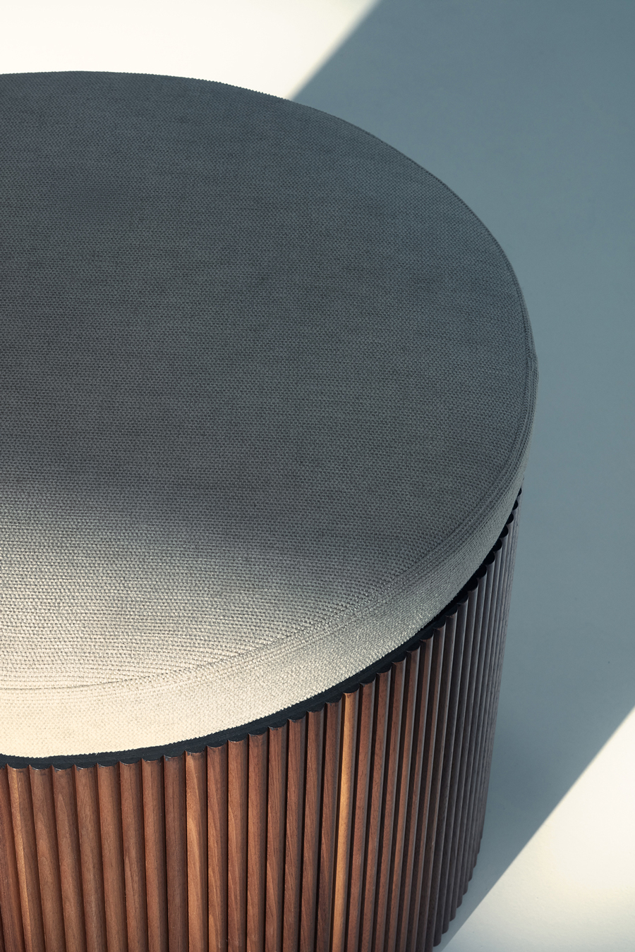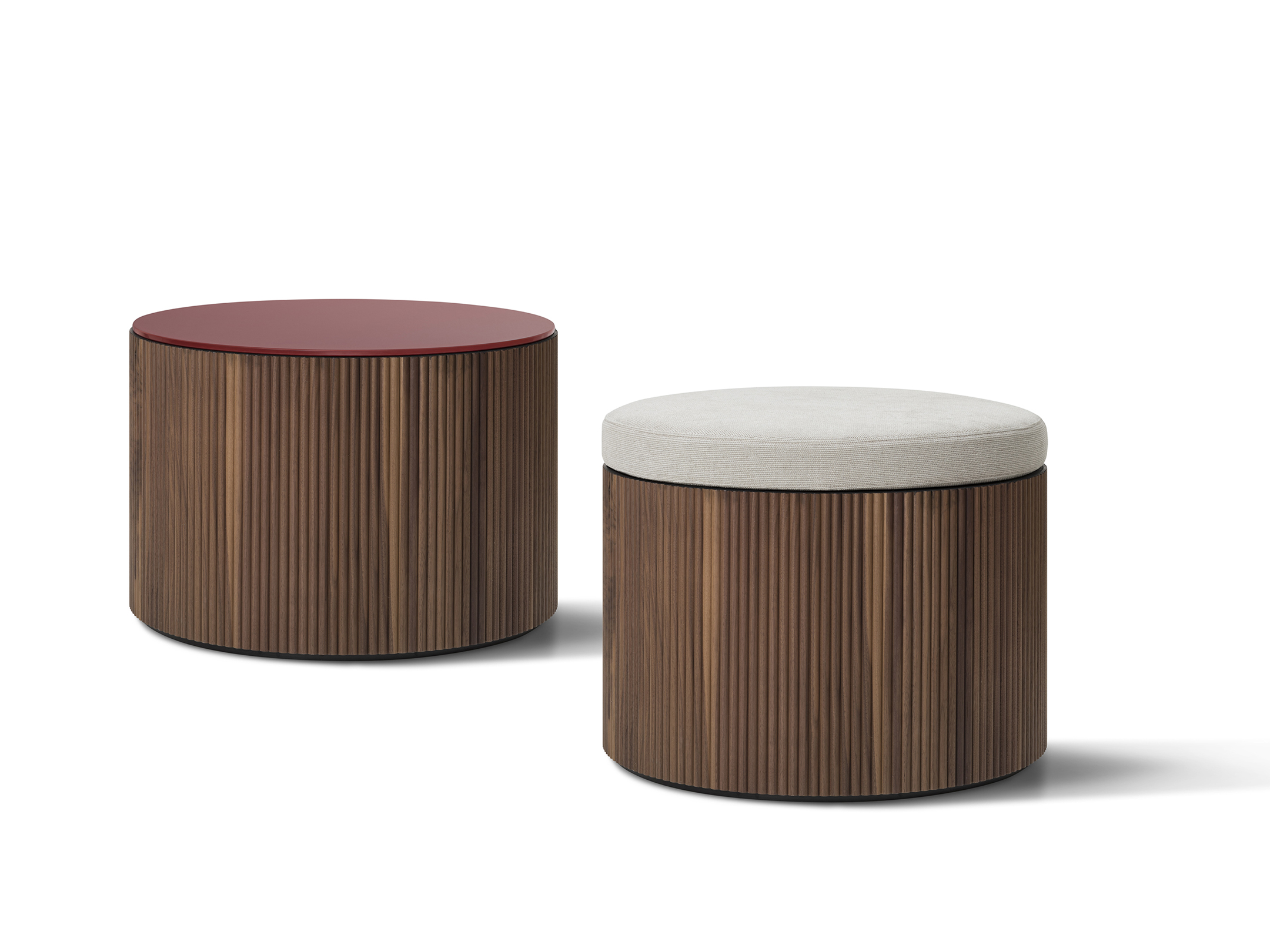 Drum features a ribbed walnut structure, available in round, oval, or square with rounded corners. Customizable tops include glass, stone, or marble. A matching pouf includes a soft cushion.