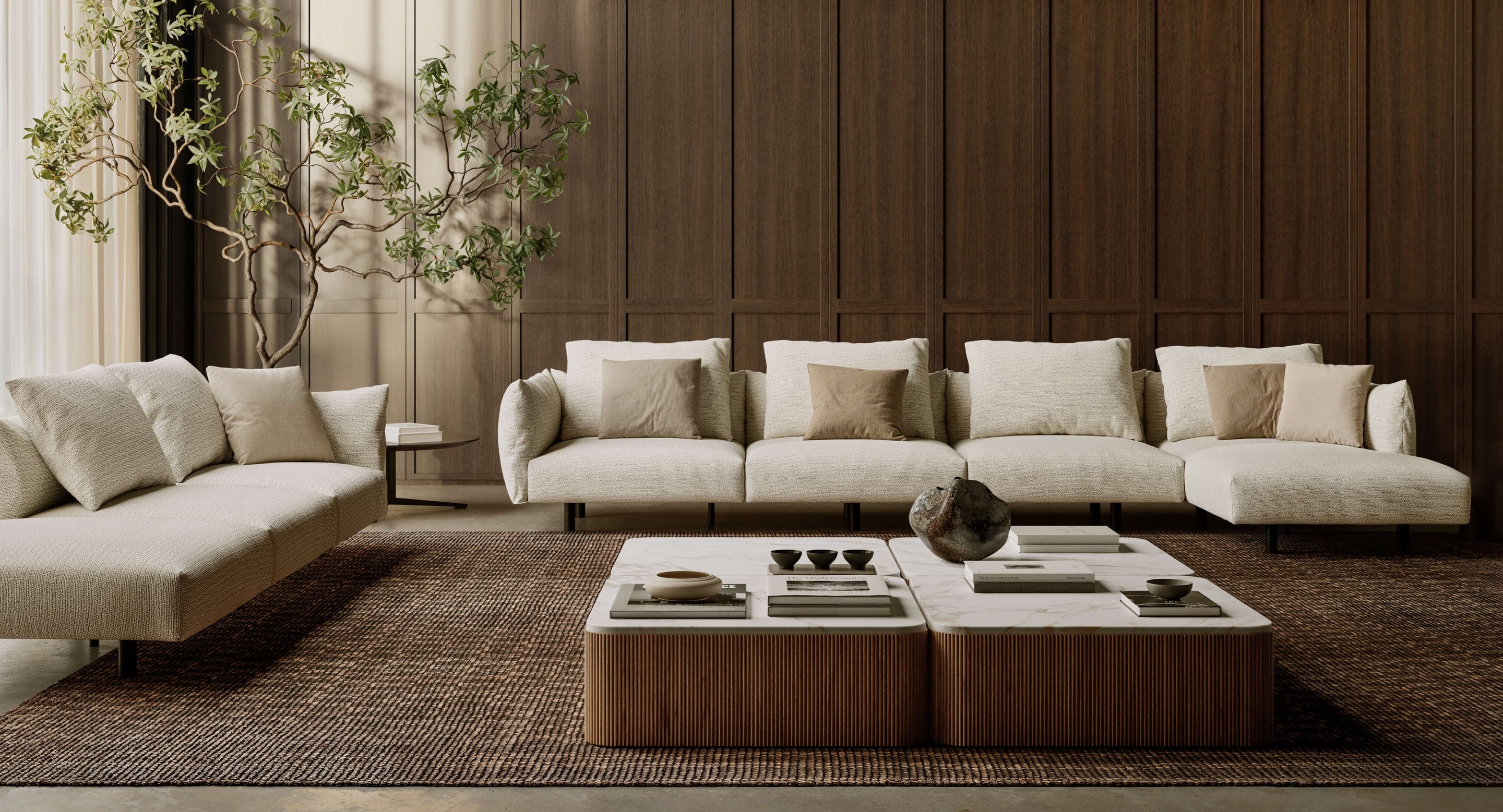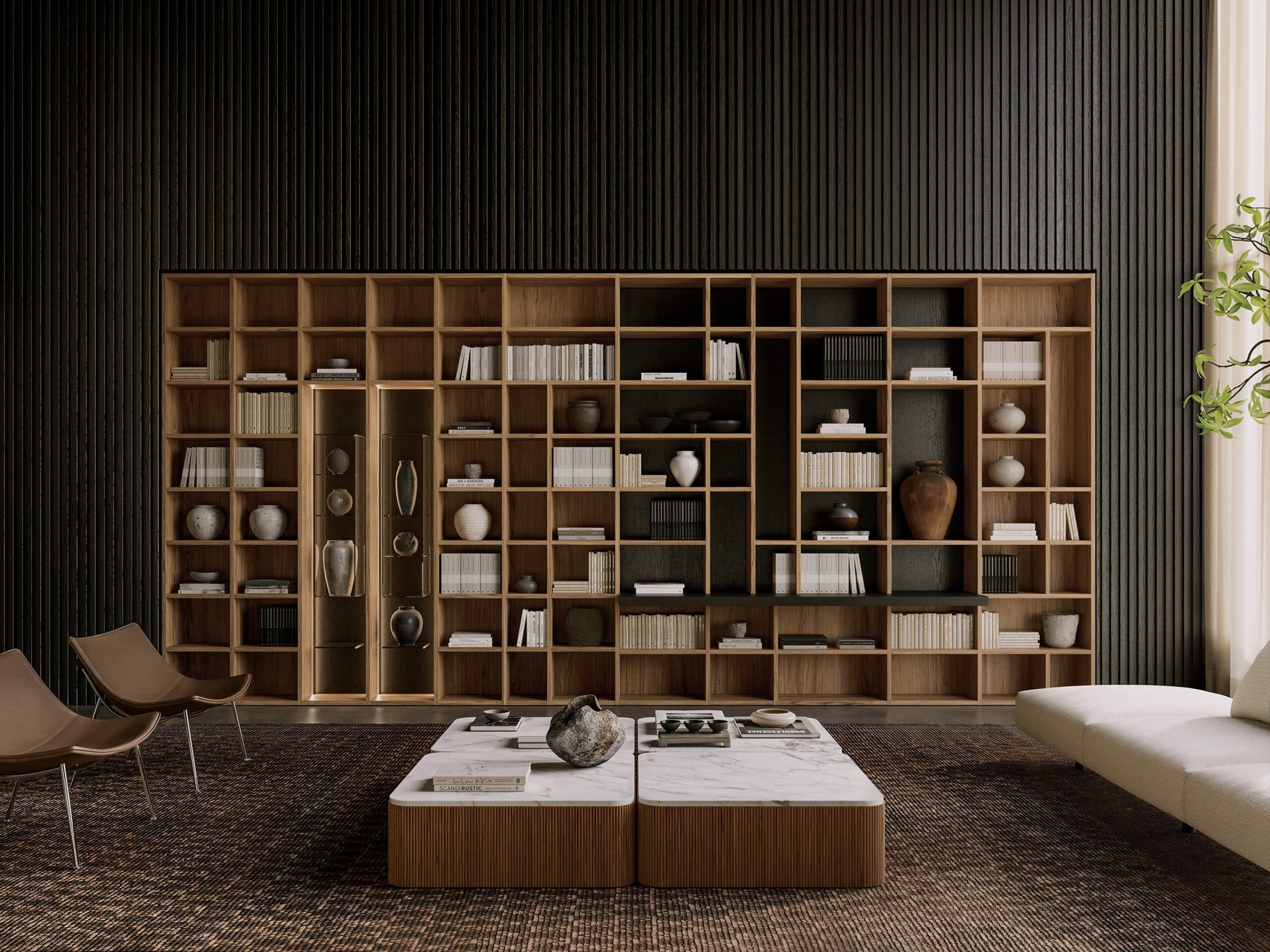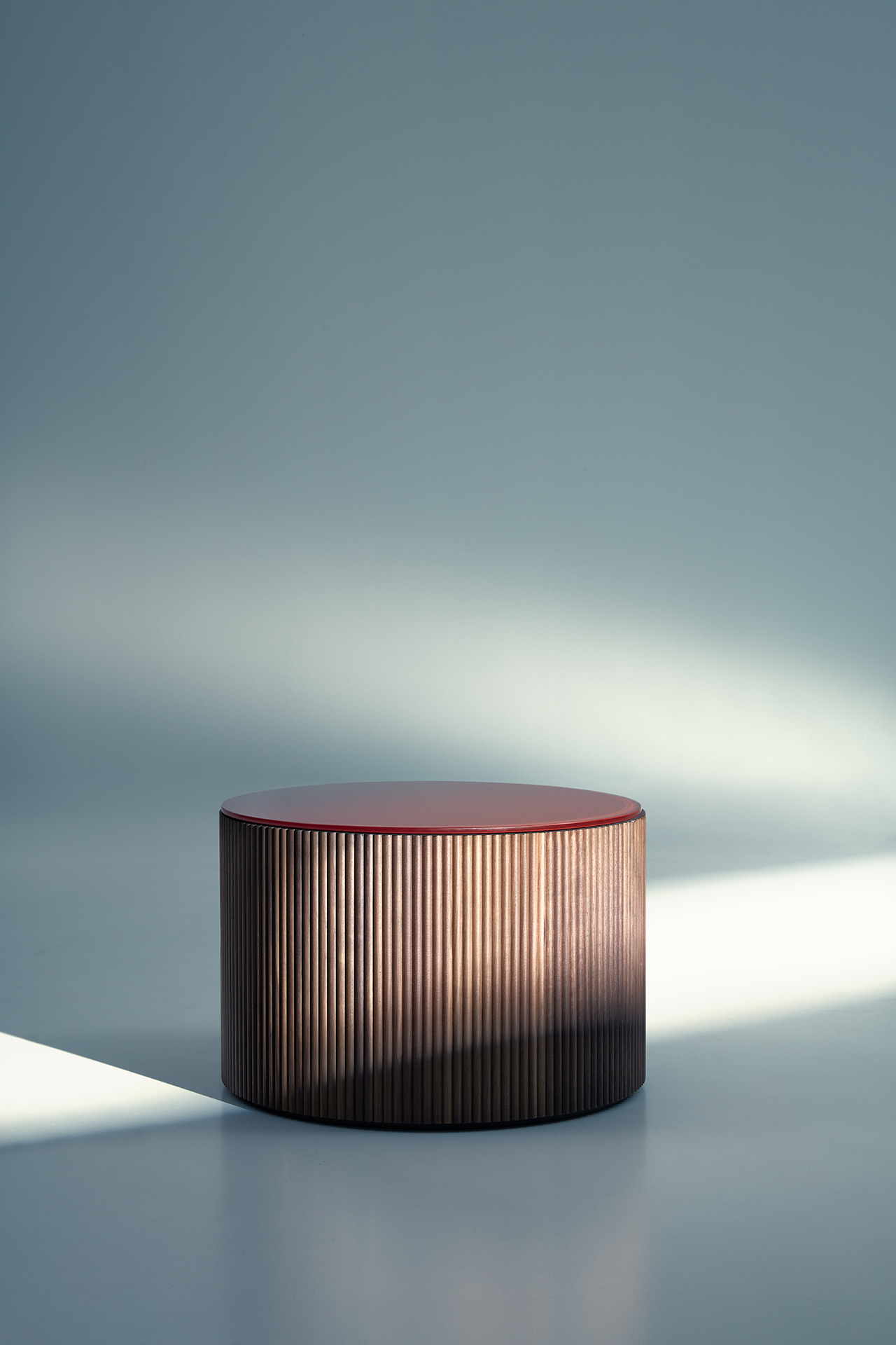 Drum features a ribbed walnut structure, available in round, oval, or square with rounded corners. Customizable tops include glass, stone, or marble. A matching pouf includes a soft cushion.