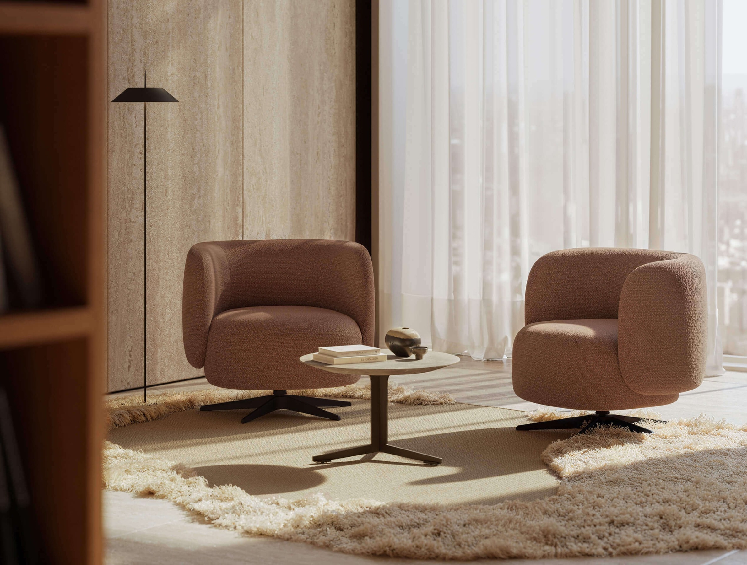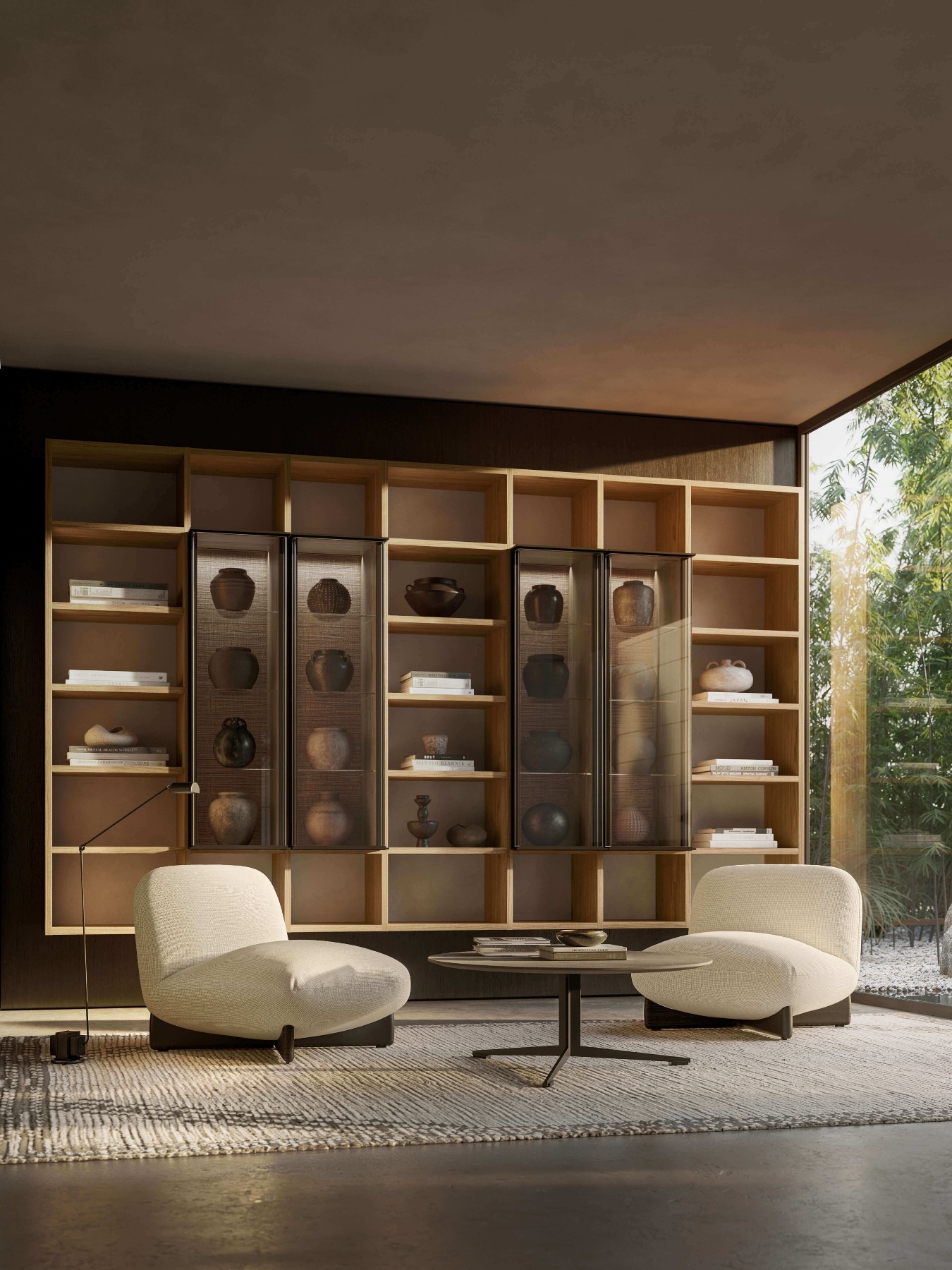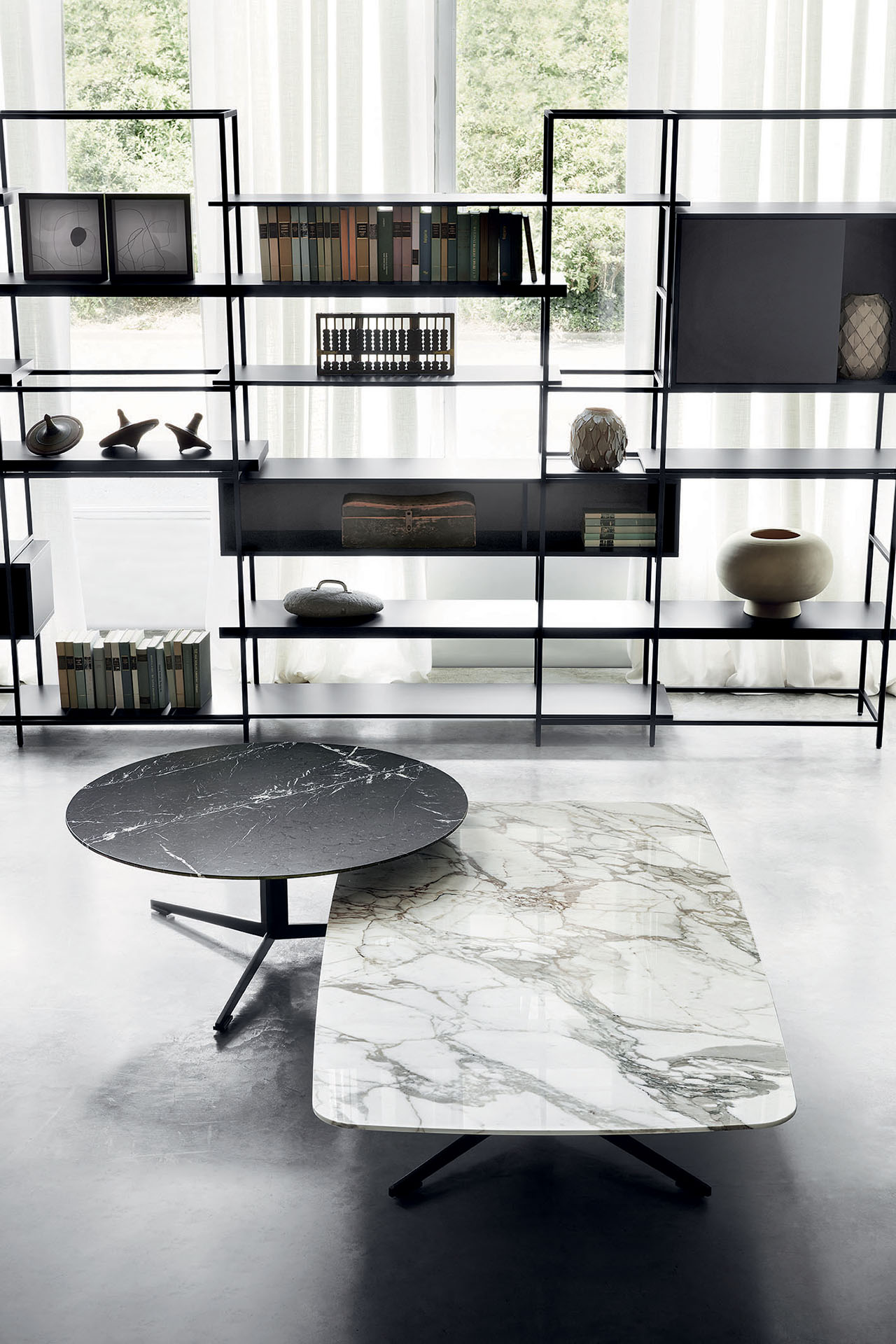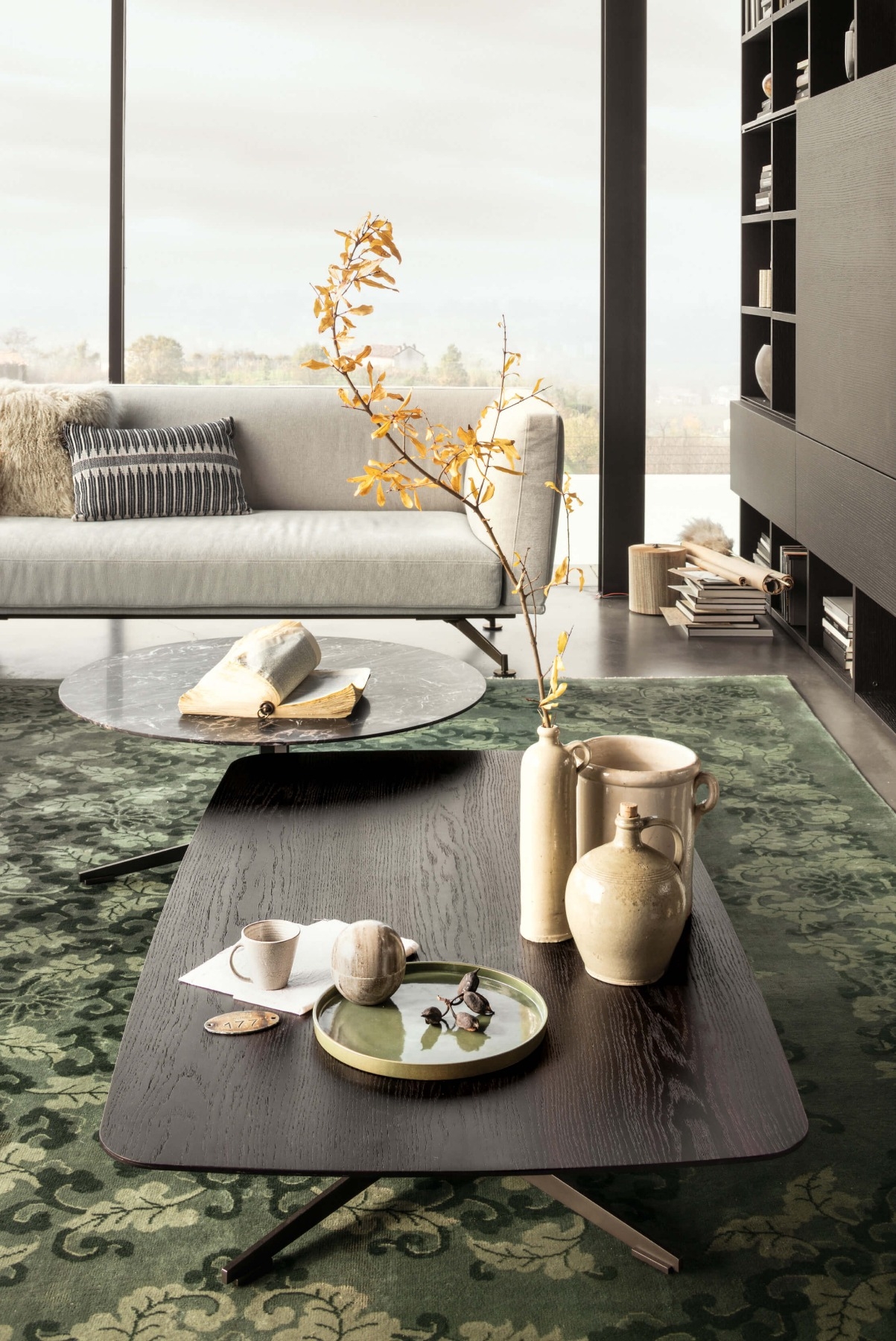 With a light and essential design, Oydo coffee tables are distinguished by their great versatility. Oydo tables come with two iterations, one with a round top and another lower one with a rectangular top so you can personalize any room in your home. Complete the piece with one of the many available finishes: heat-treated oak, clay, grey stone, gloss, matte lacquer, or elegant Portoro marble.