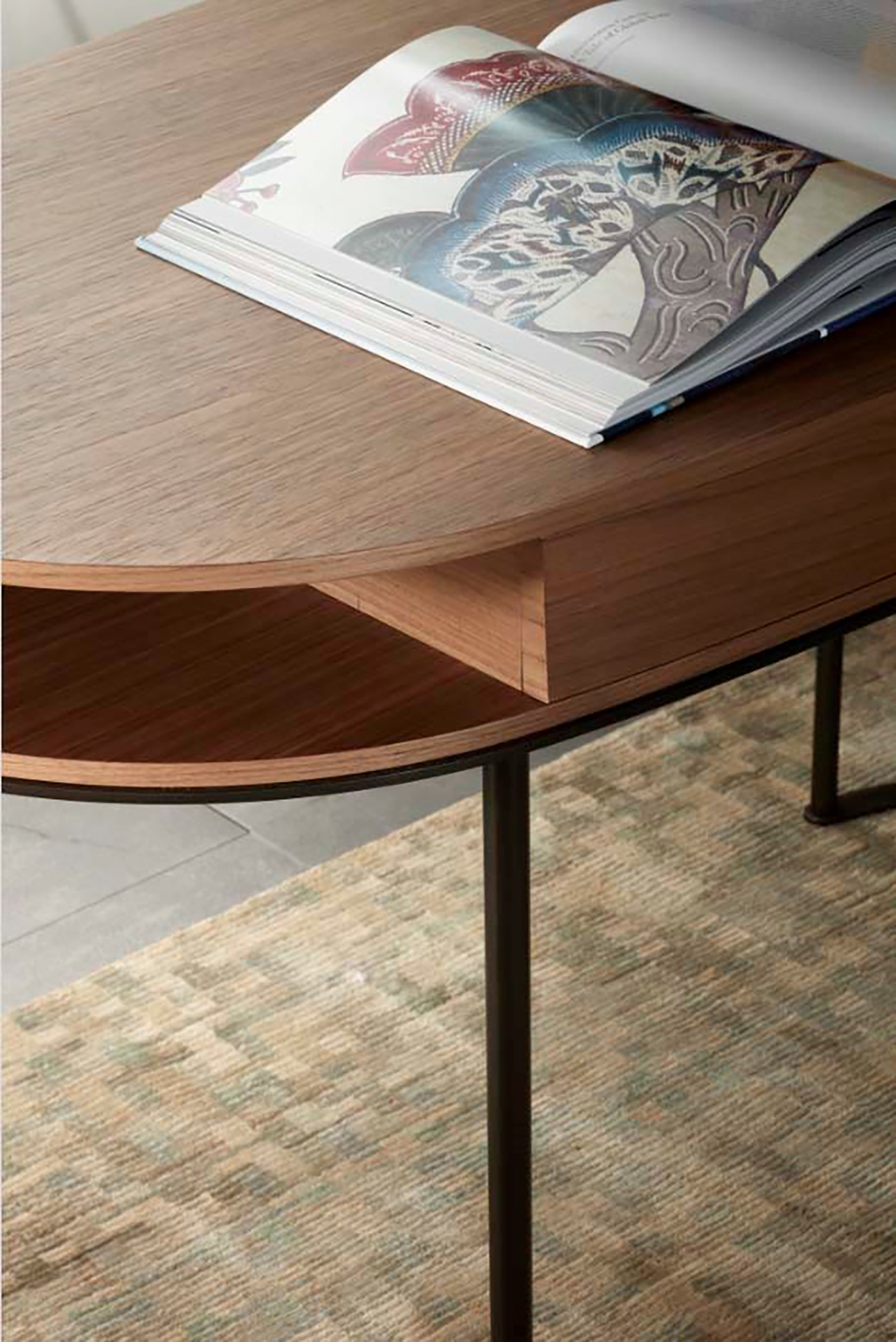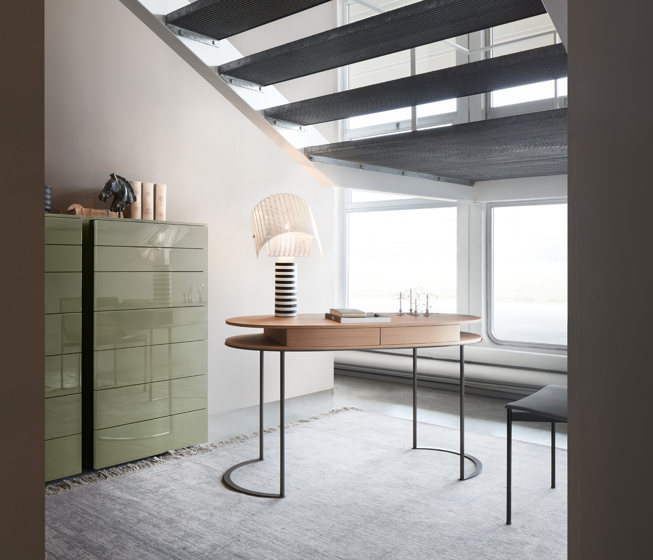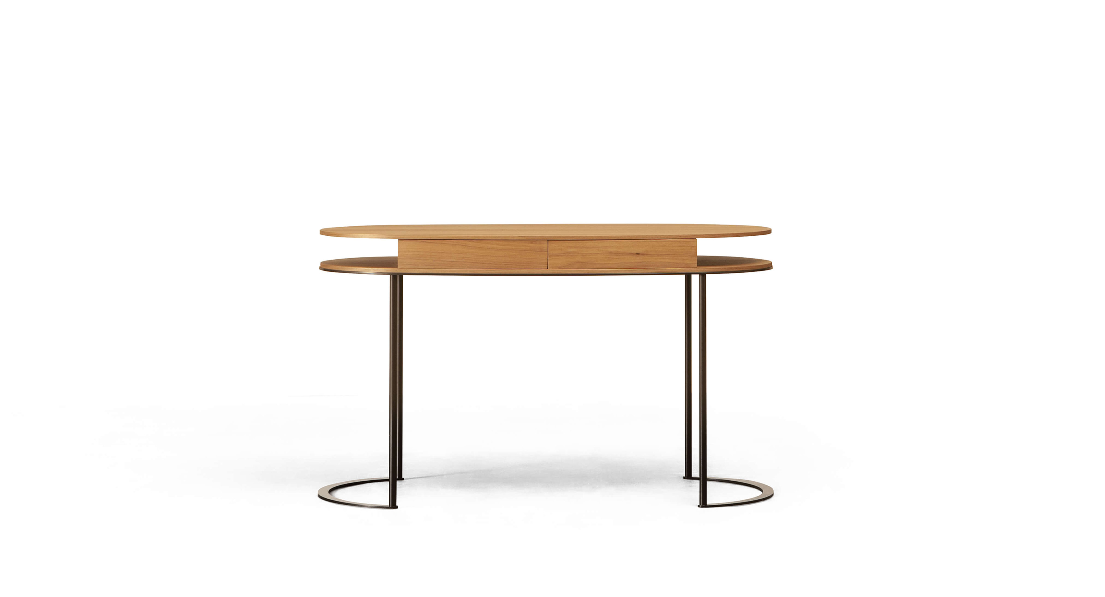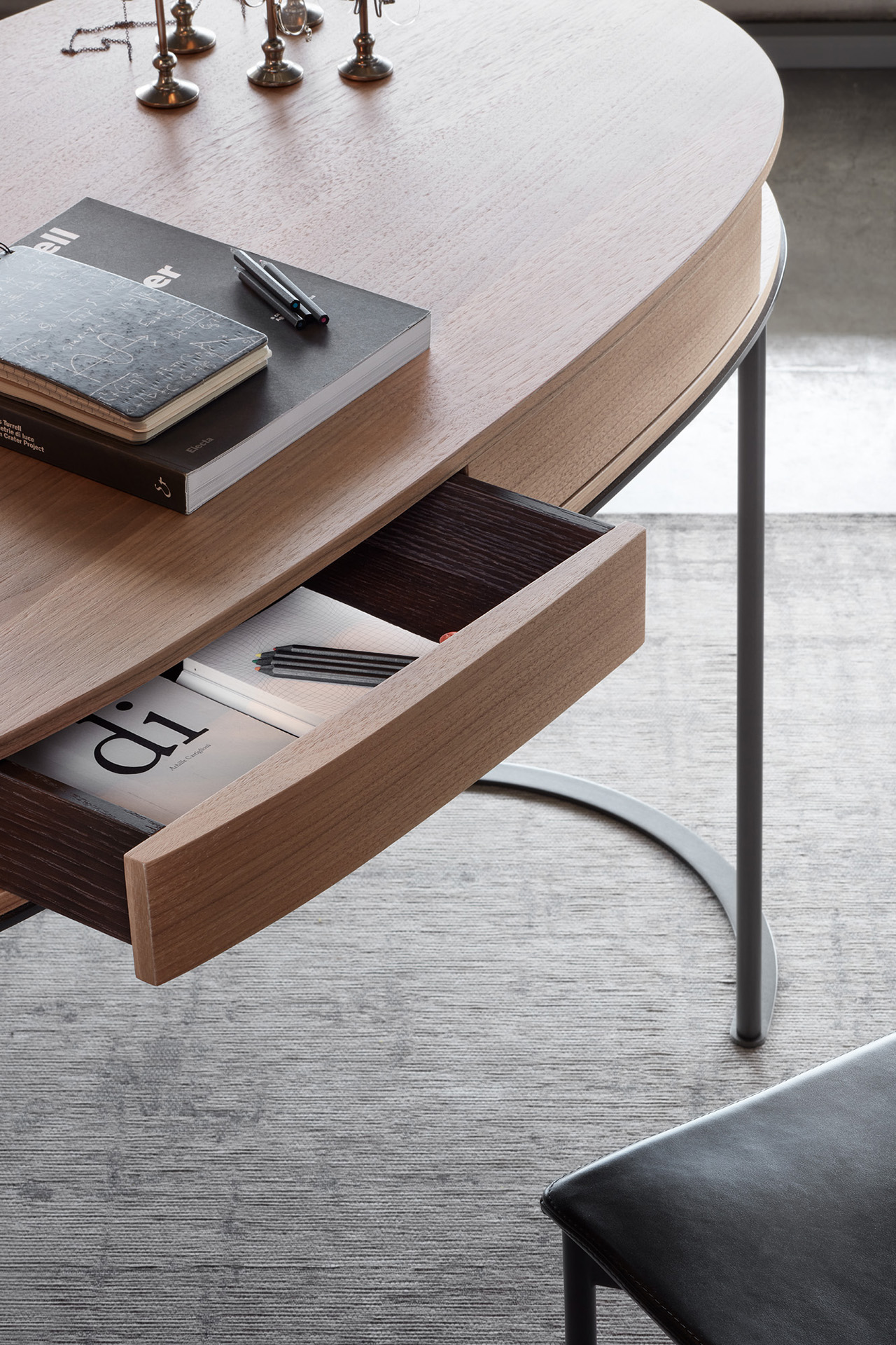 The Ortis desk, designed for modern home environments, blends sophistication with functionality. Its oval top hides two drawers and sits on a light metal tube structure with bronze-painted legs. Available in various finishes.