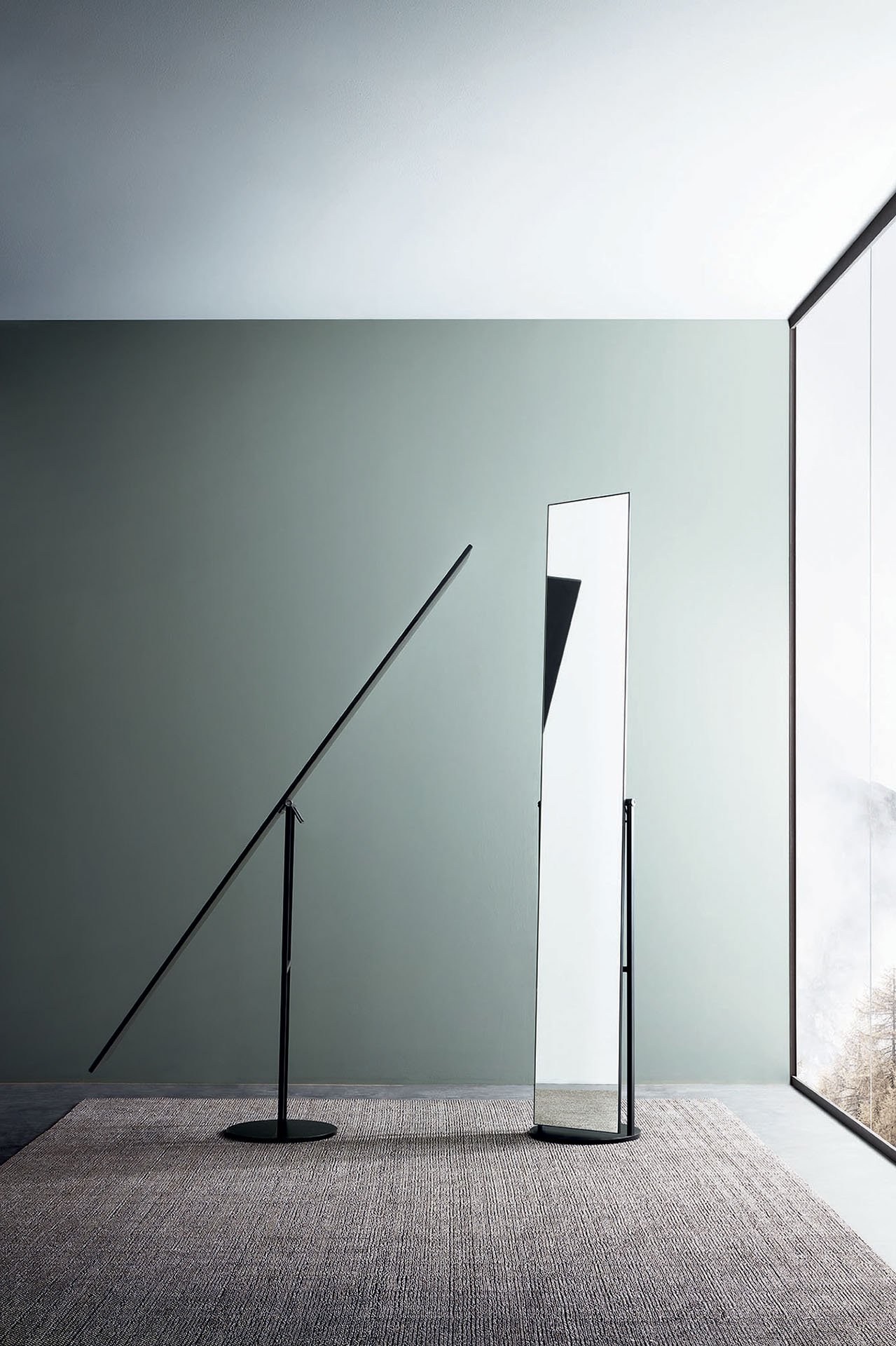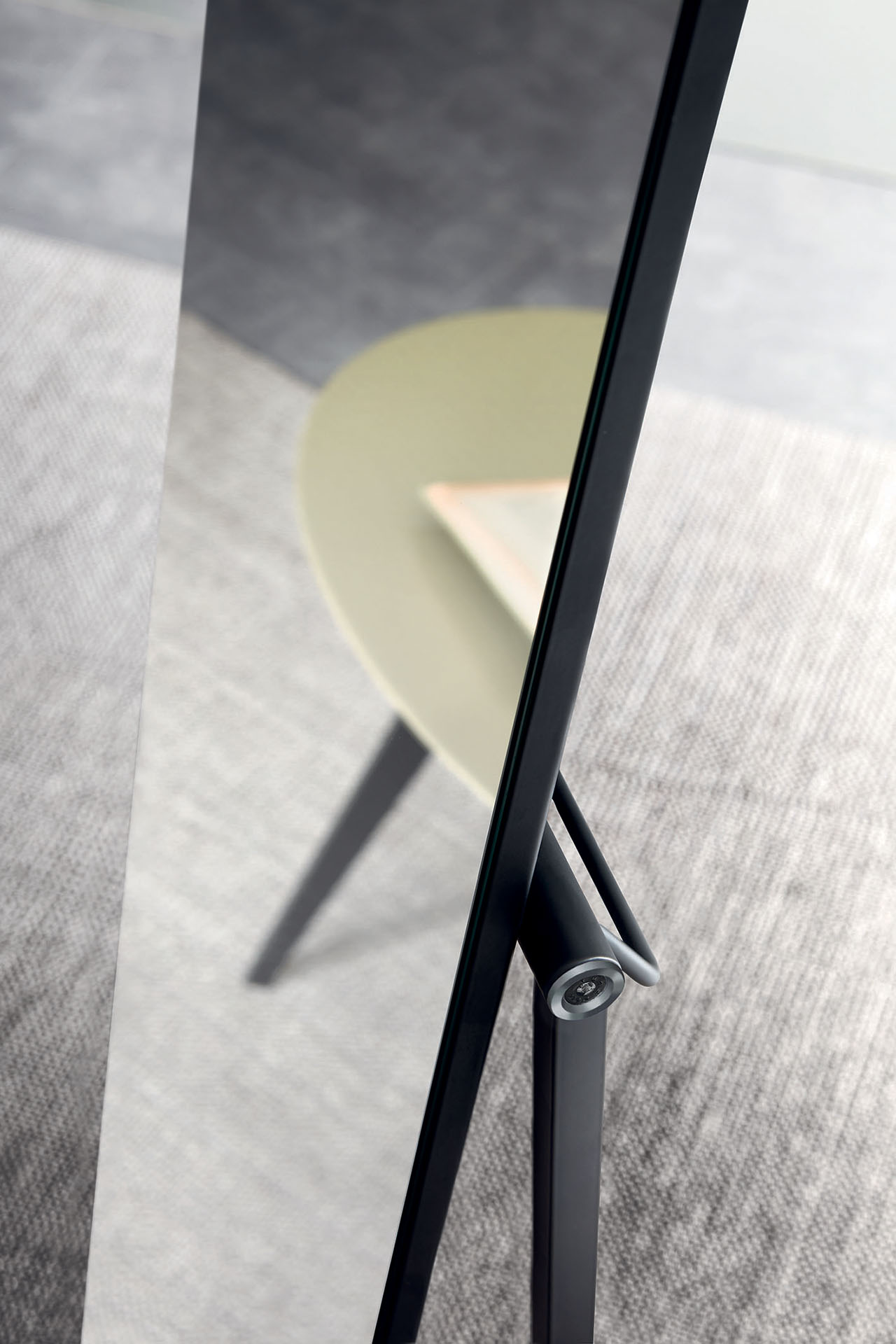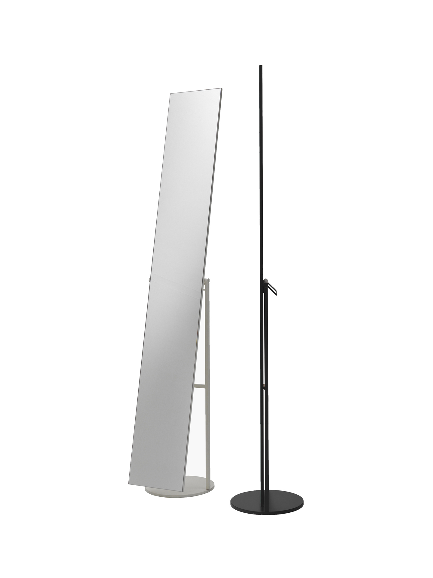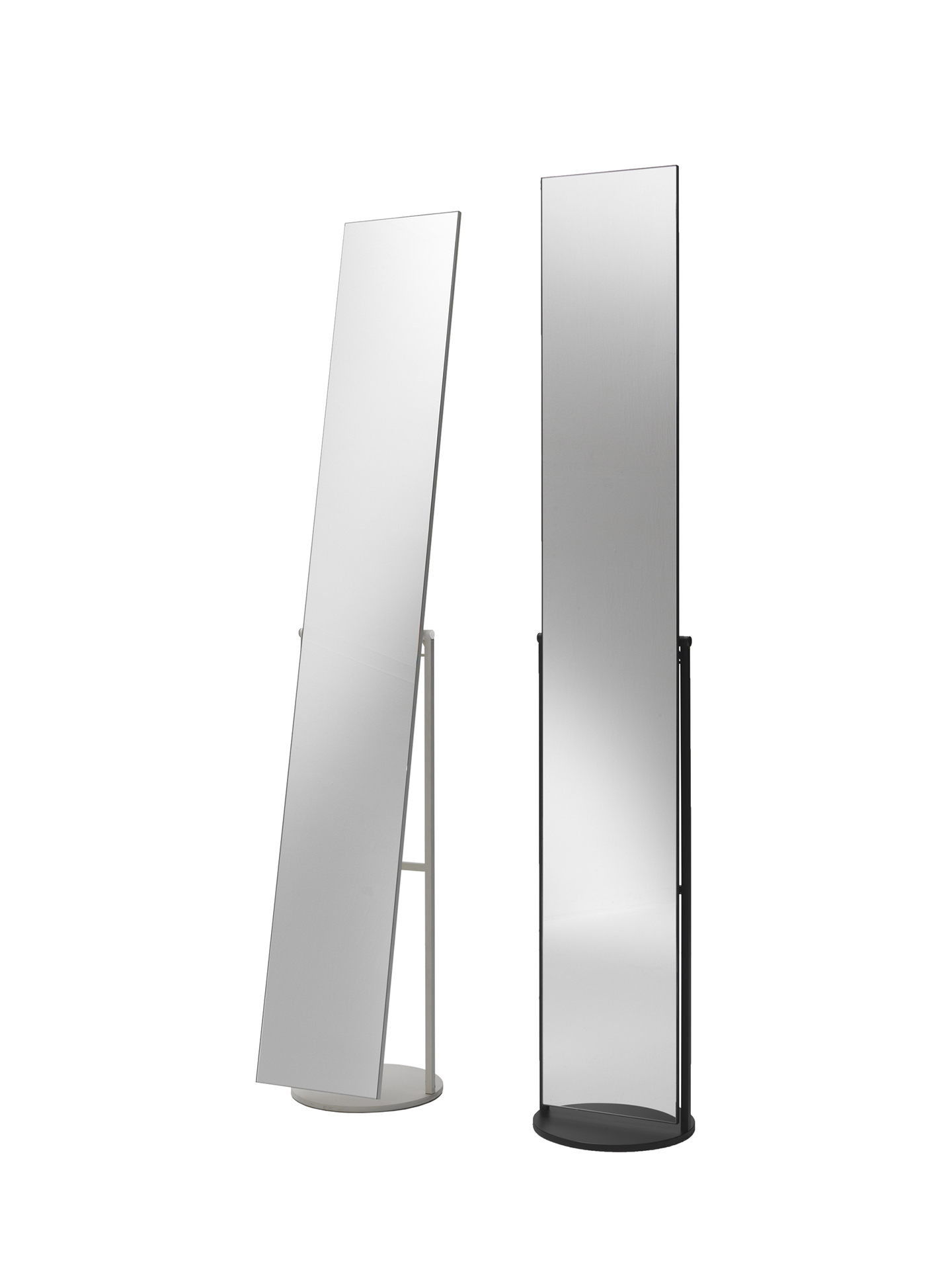 Mir is a classic yet upto date mirror. Its rigorous frame in painted metal with its pivotal supports on the long column mirror make it perfect for narrow spaces or corners.