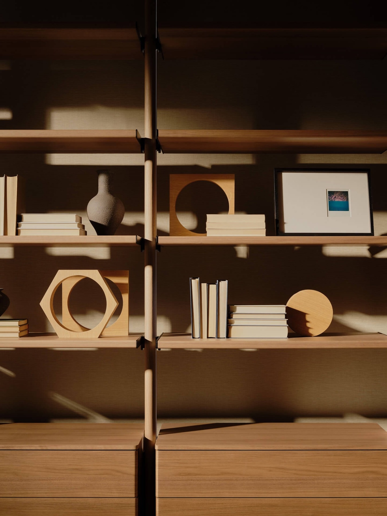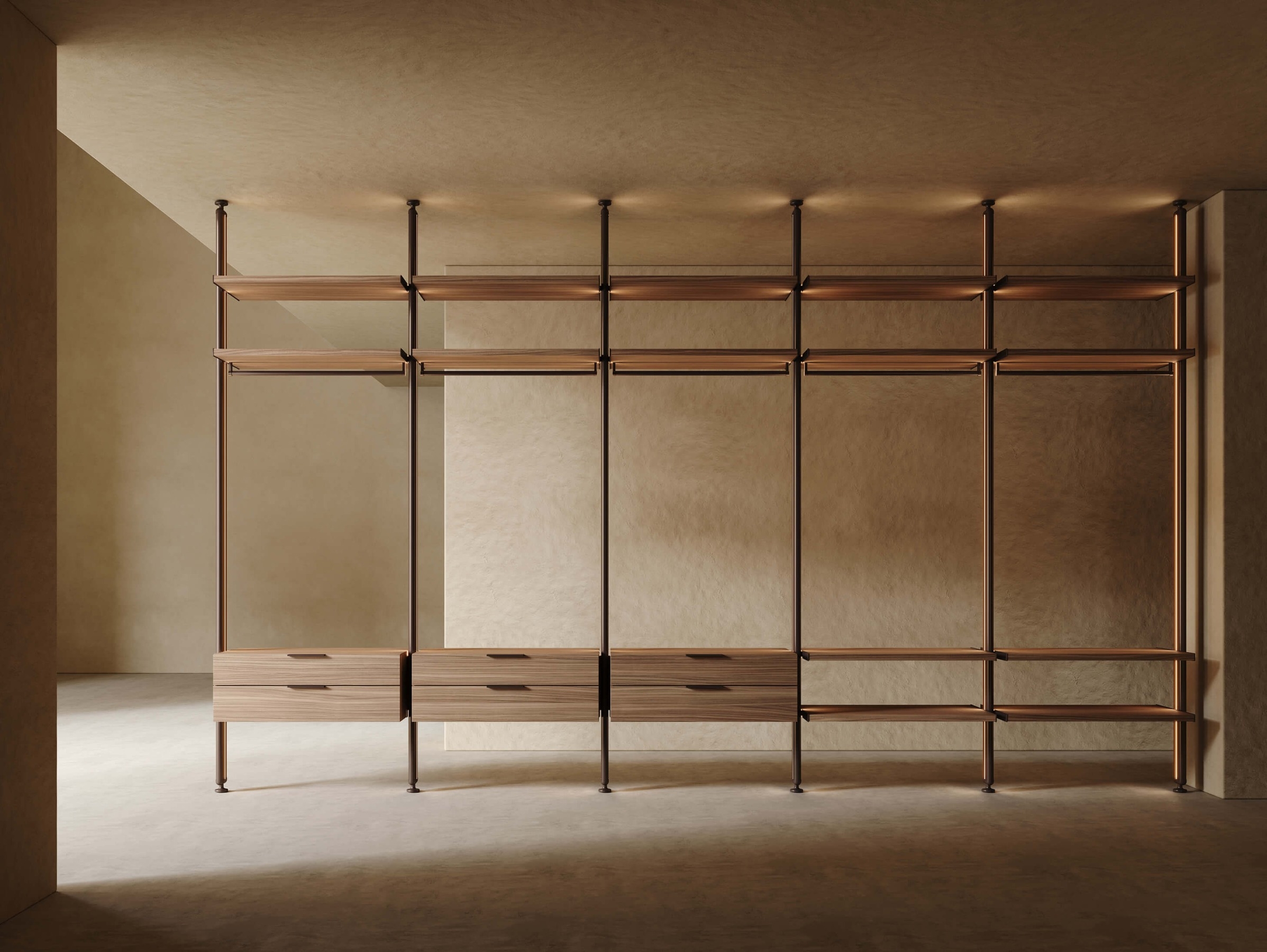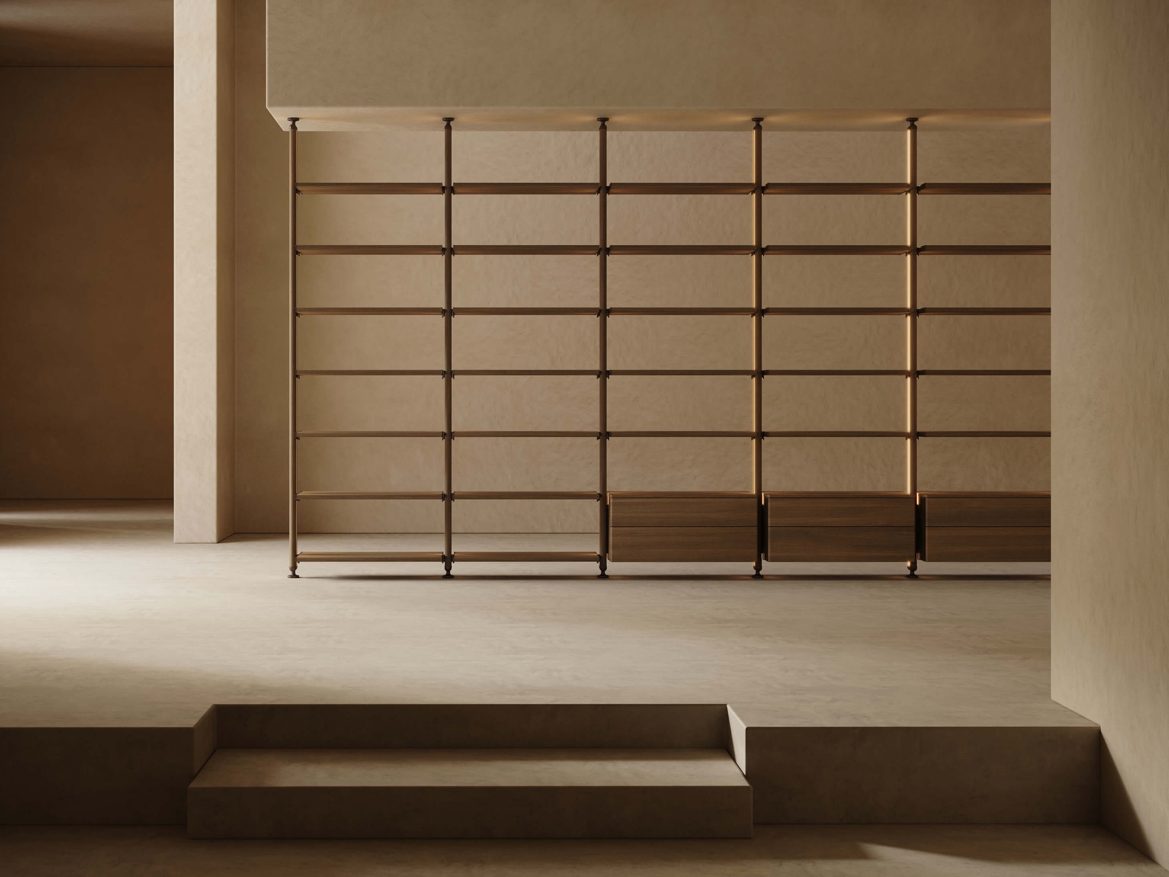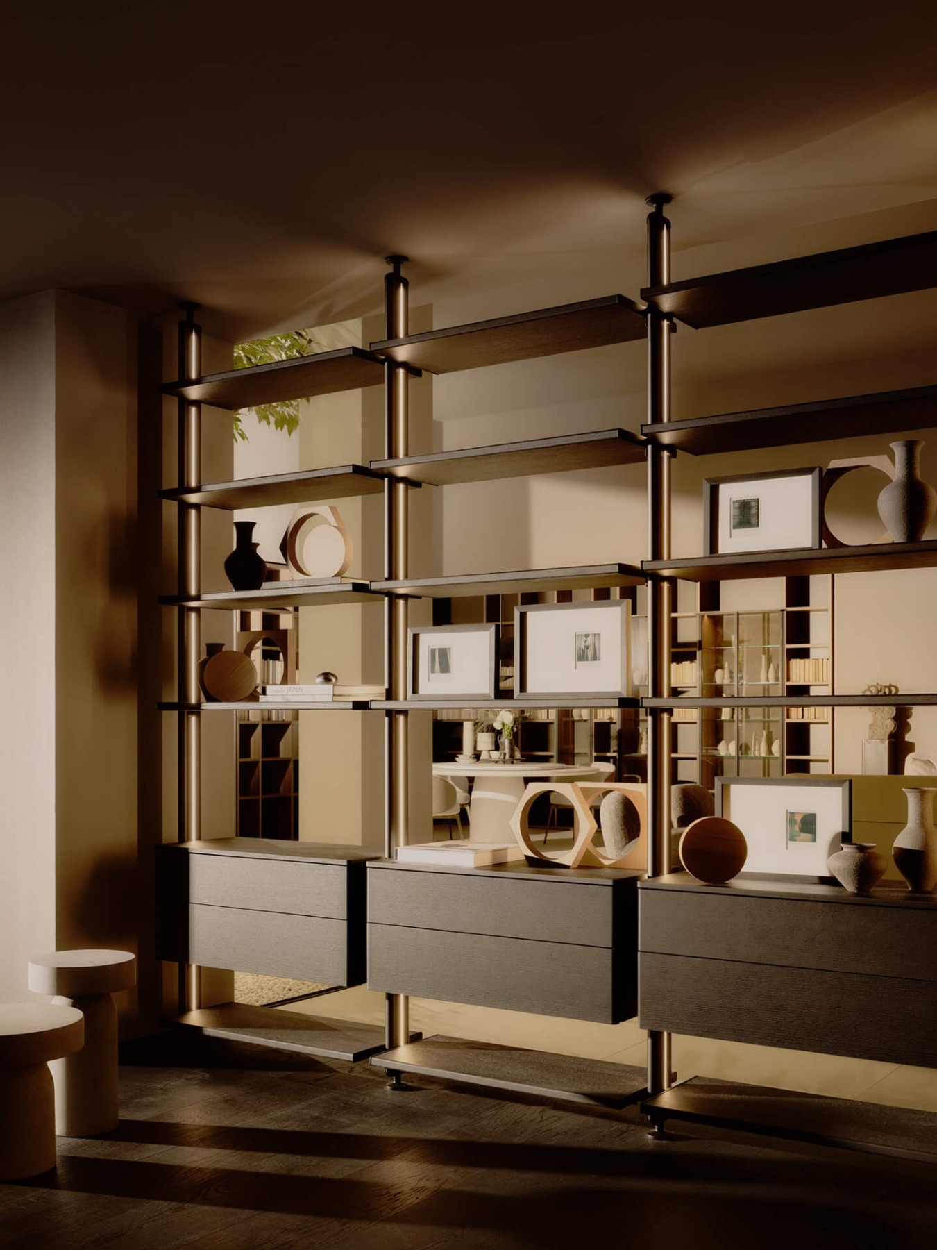 L25 is a sleek freestanding system that combines modular shelving and storage with minimalist design. Its vertical aluminium uprights create a dynamic, lightweight structure, adaptable in both floor-to-ceiling and floor-to-wall setups. Perfect for living or bedroom spaces, L25 integrates seamlessly with the Selecta system and VentiTre wardrobe, ensuring visual harmony and practical storage.