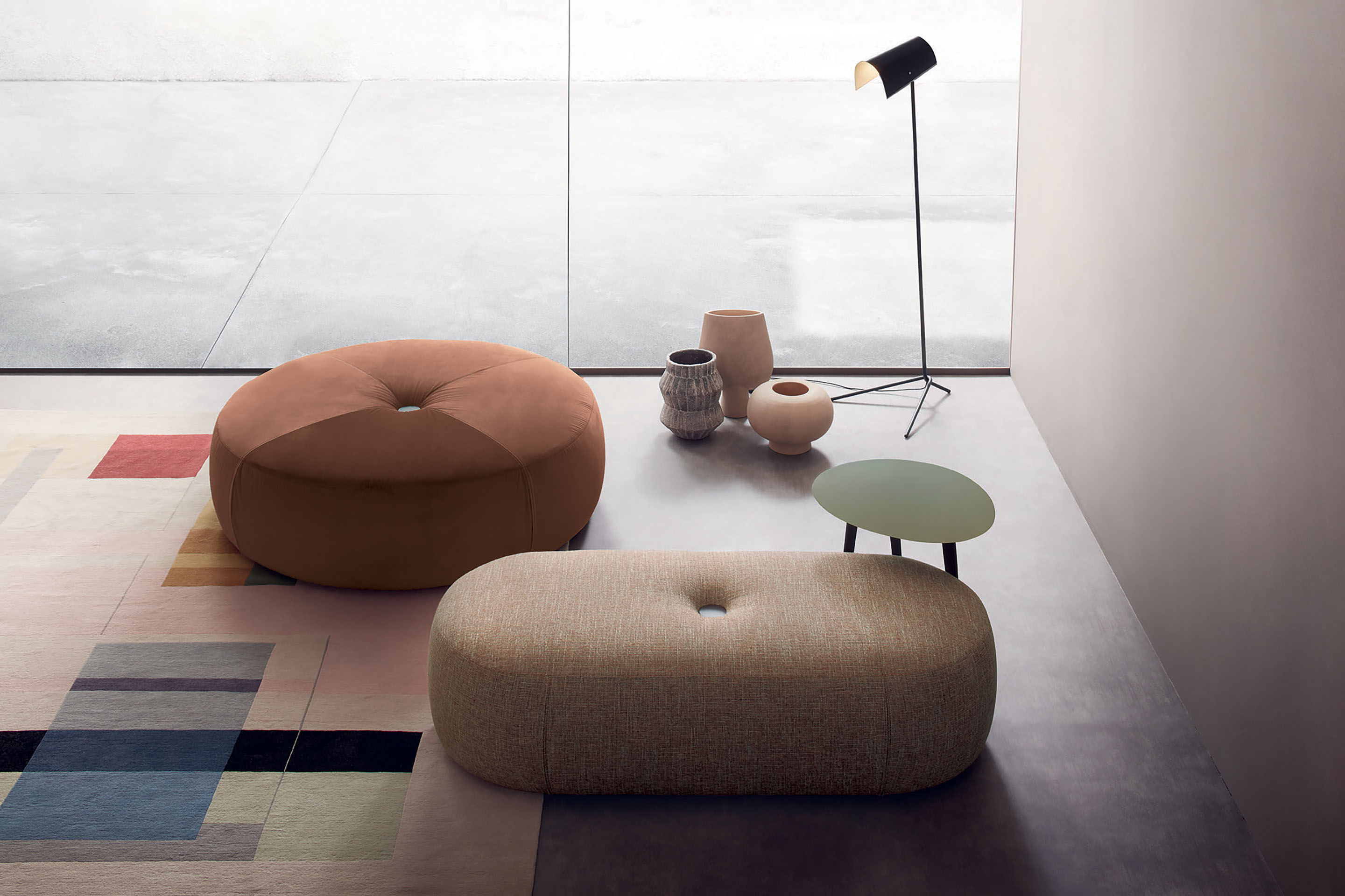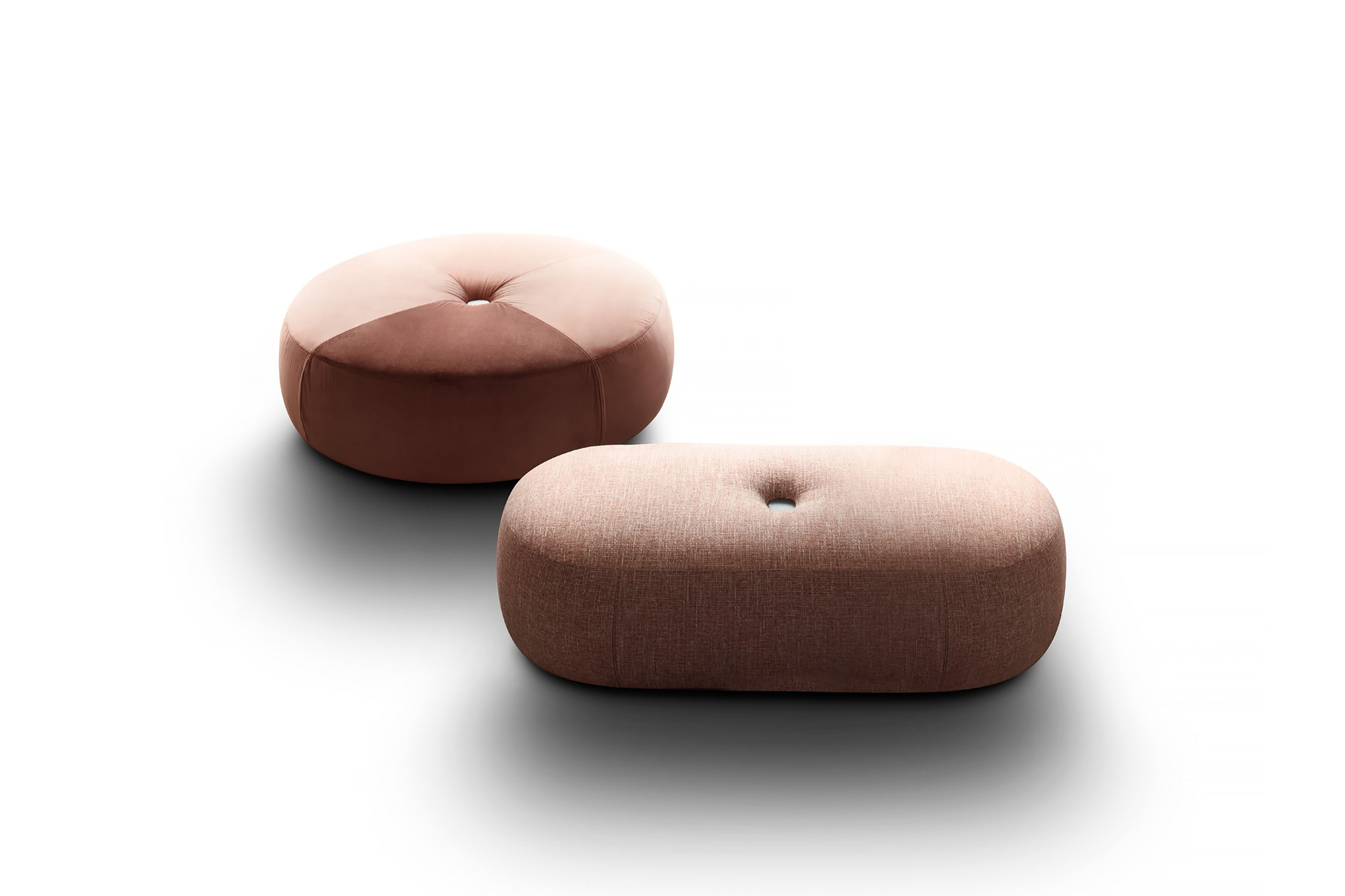 Aley is a floor pouf with smooth, uniform shapes, offered in round or oval styles. Its casual design allows for flexible placement as individual pieces, pairs, or grouped for communal seating in various settings.