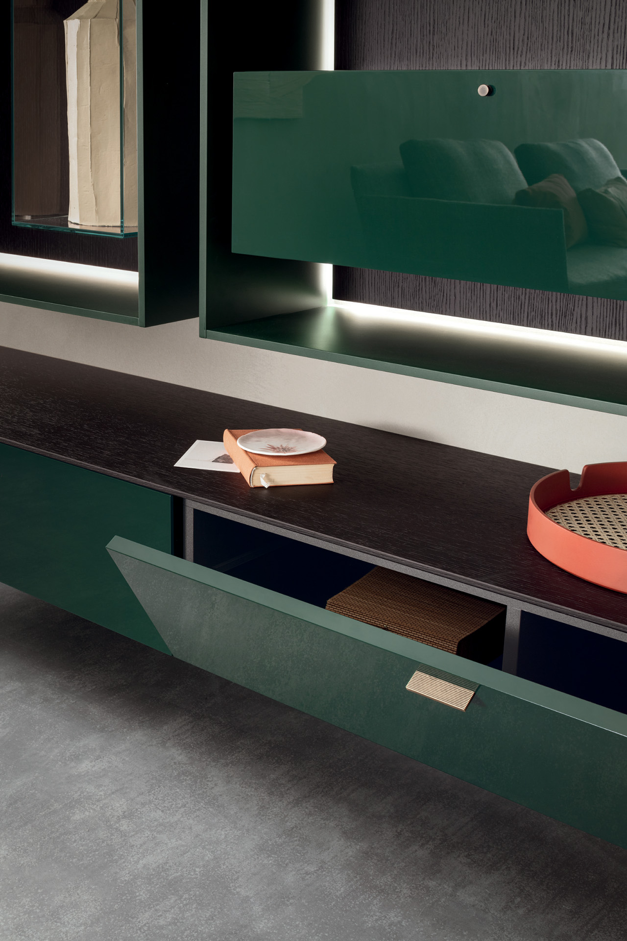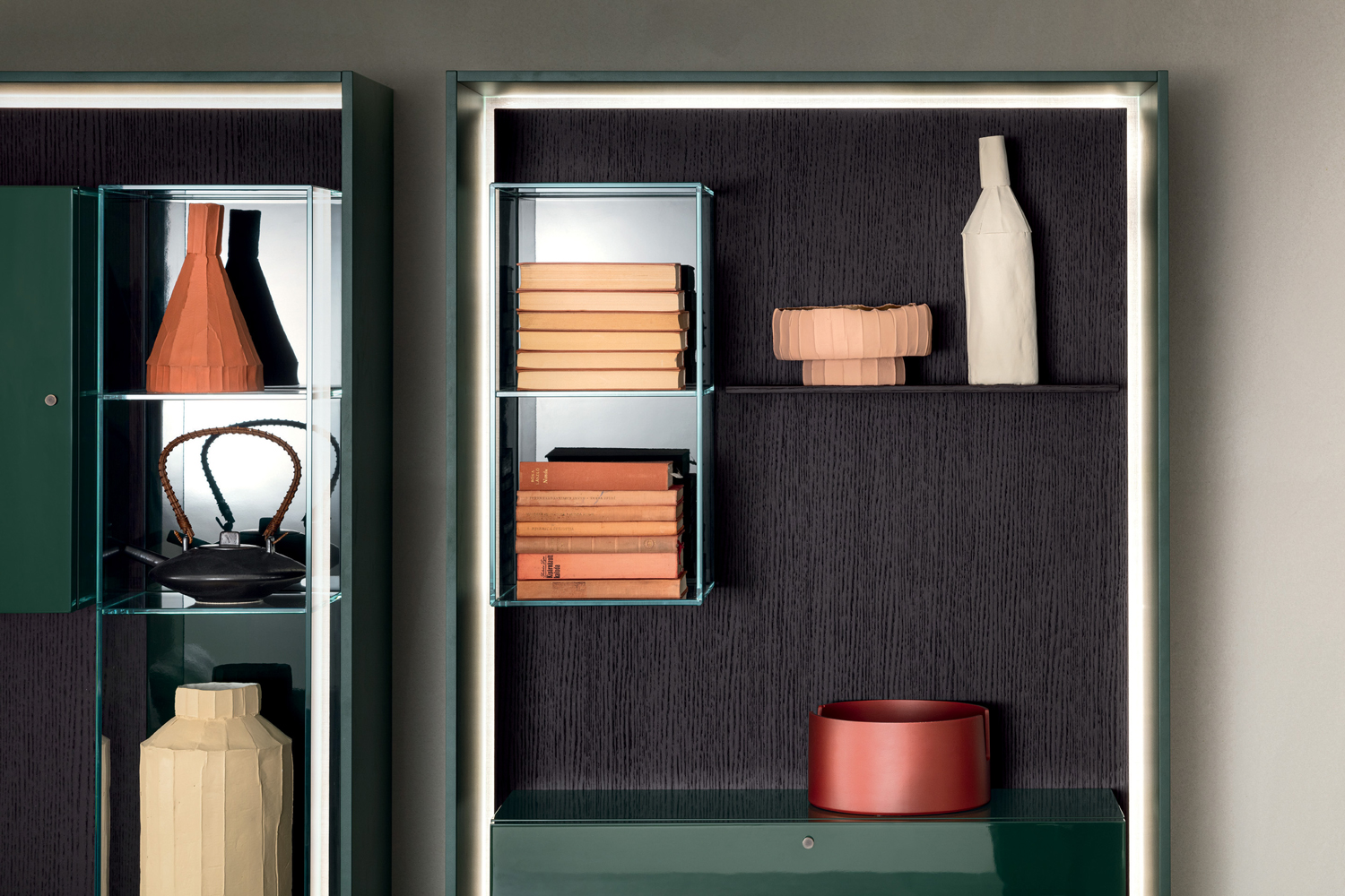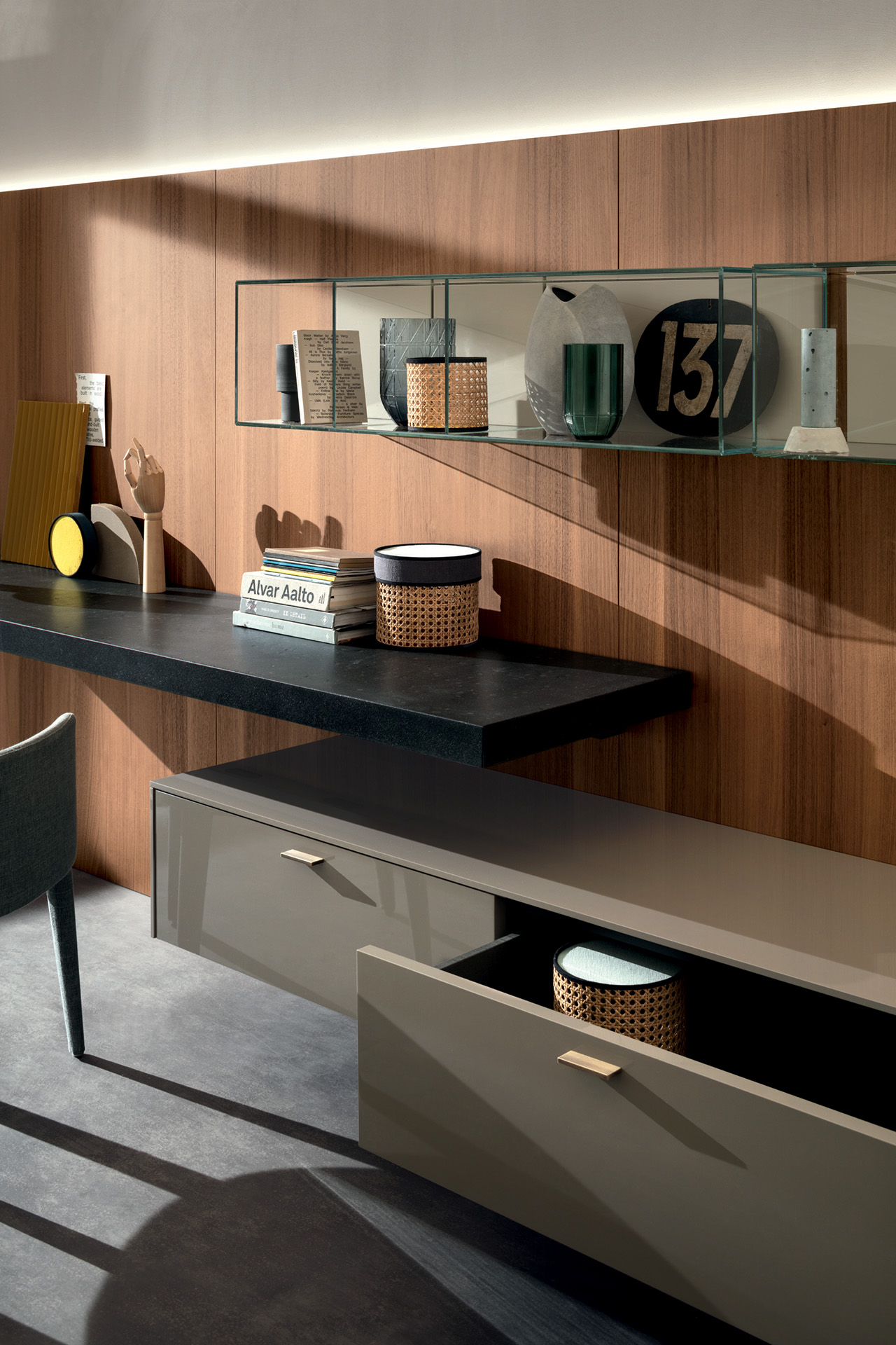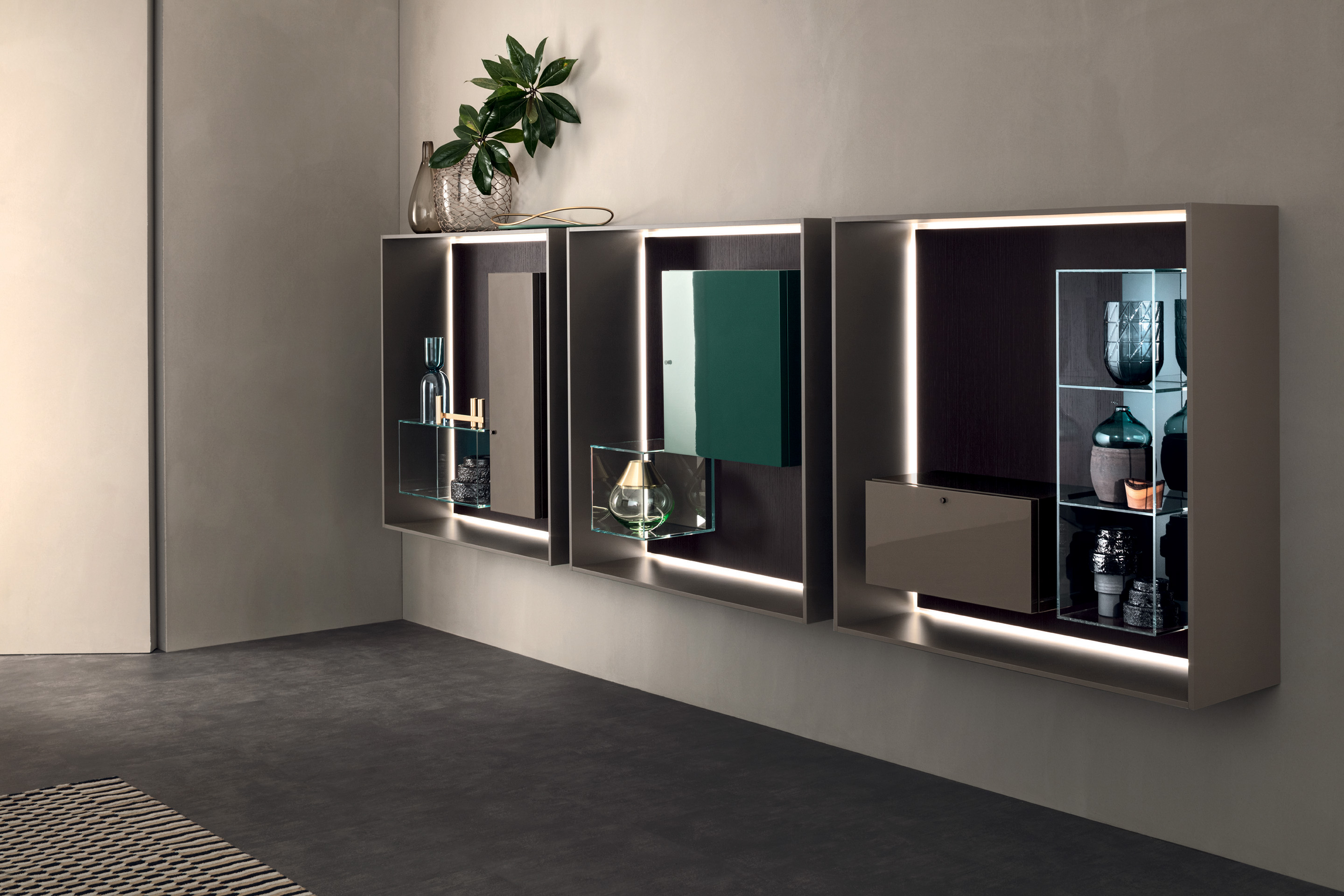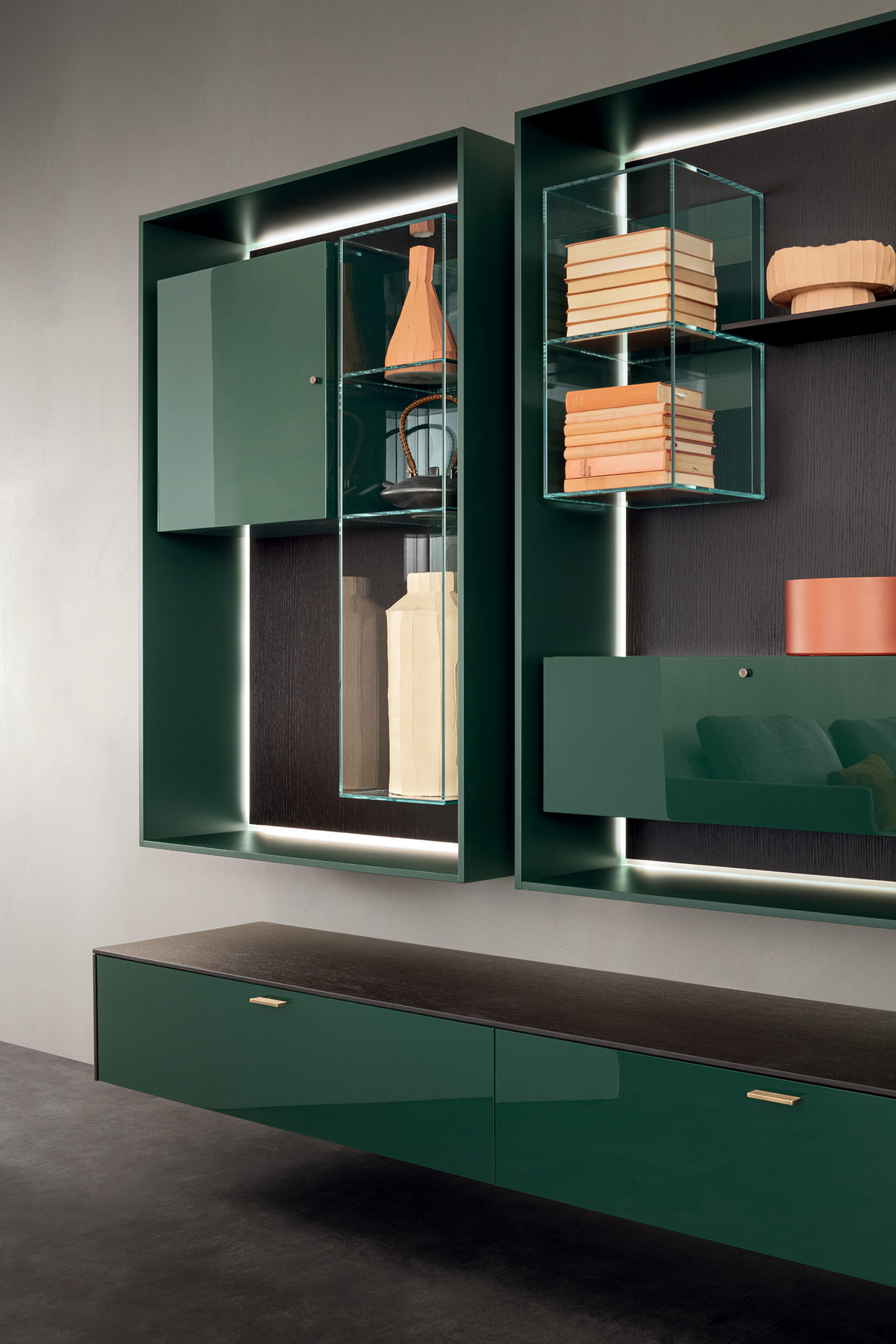 LT40 is a versatile modular system offering floor, sideboard, wall-mounted, and panelling configurations. It includes additional elements like double side containers, benches, marble tops, and LED lighting, with customizable options for wood or glass containers.
