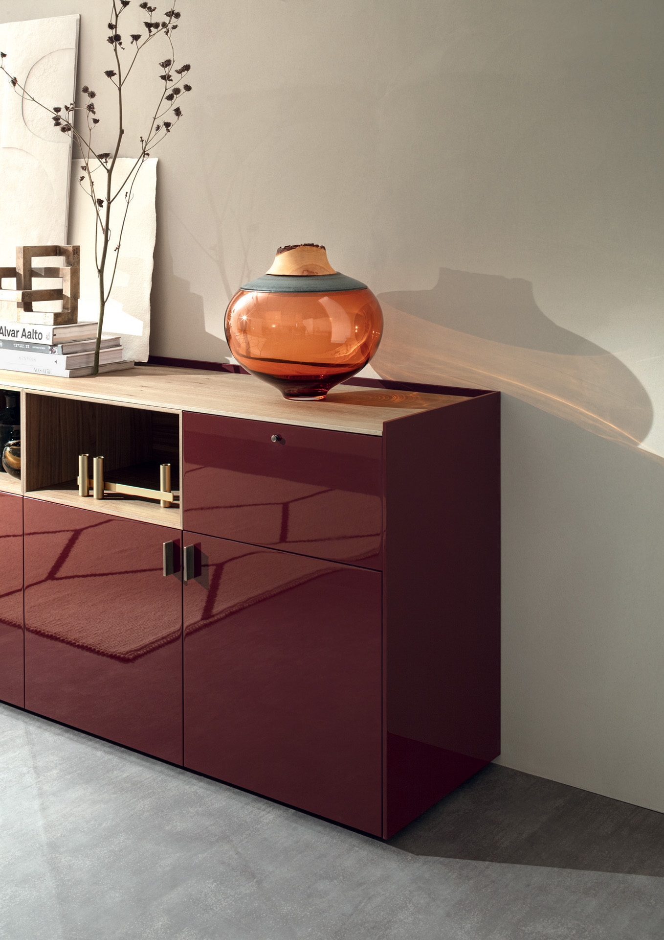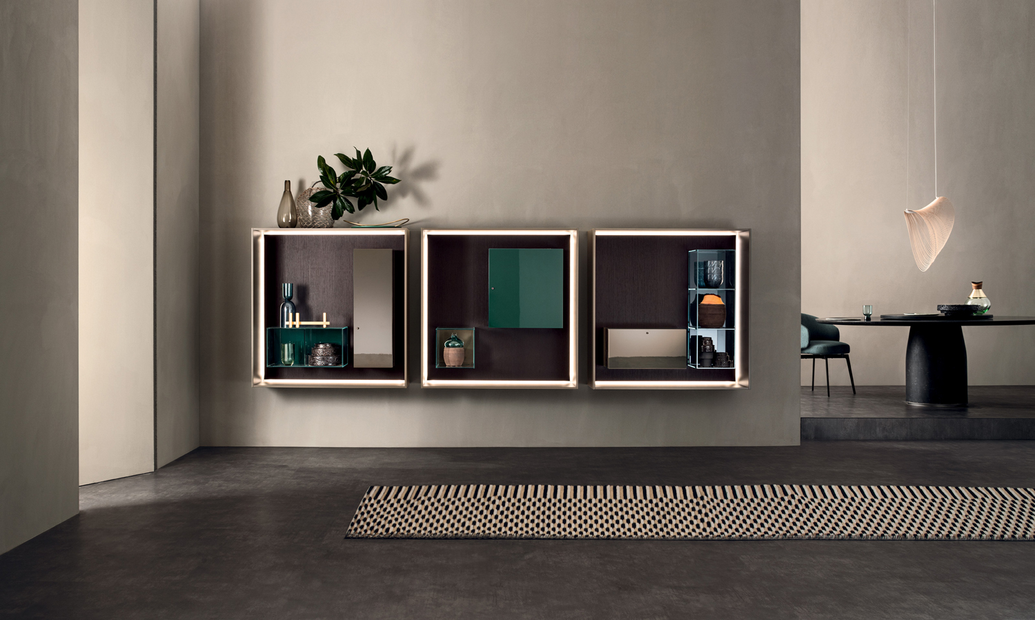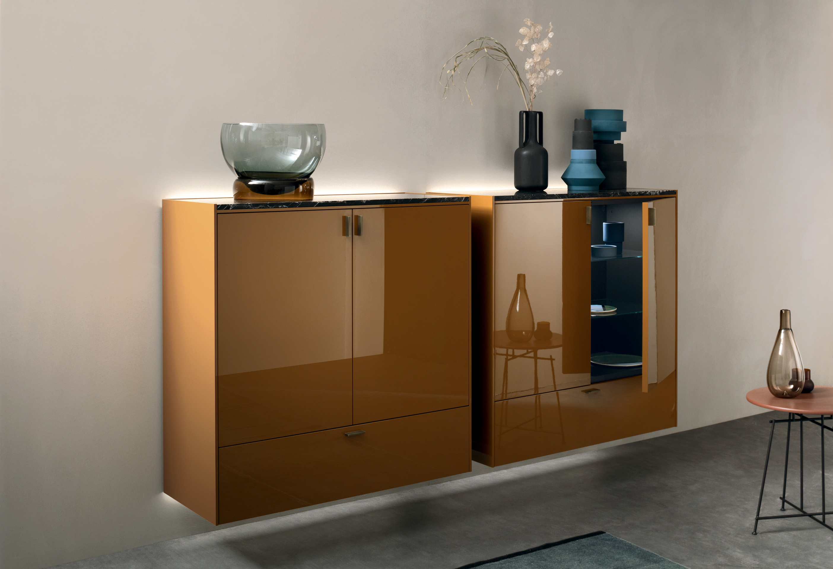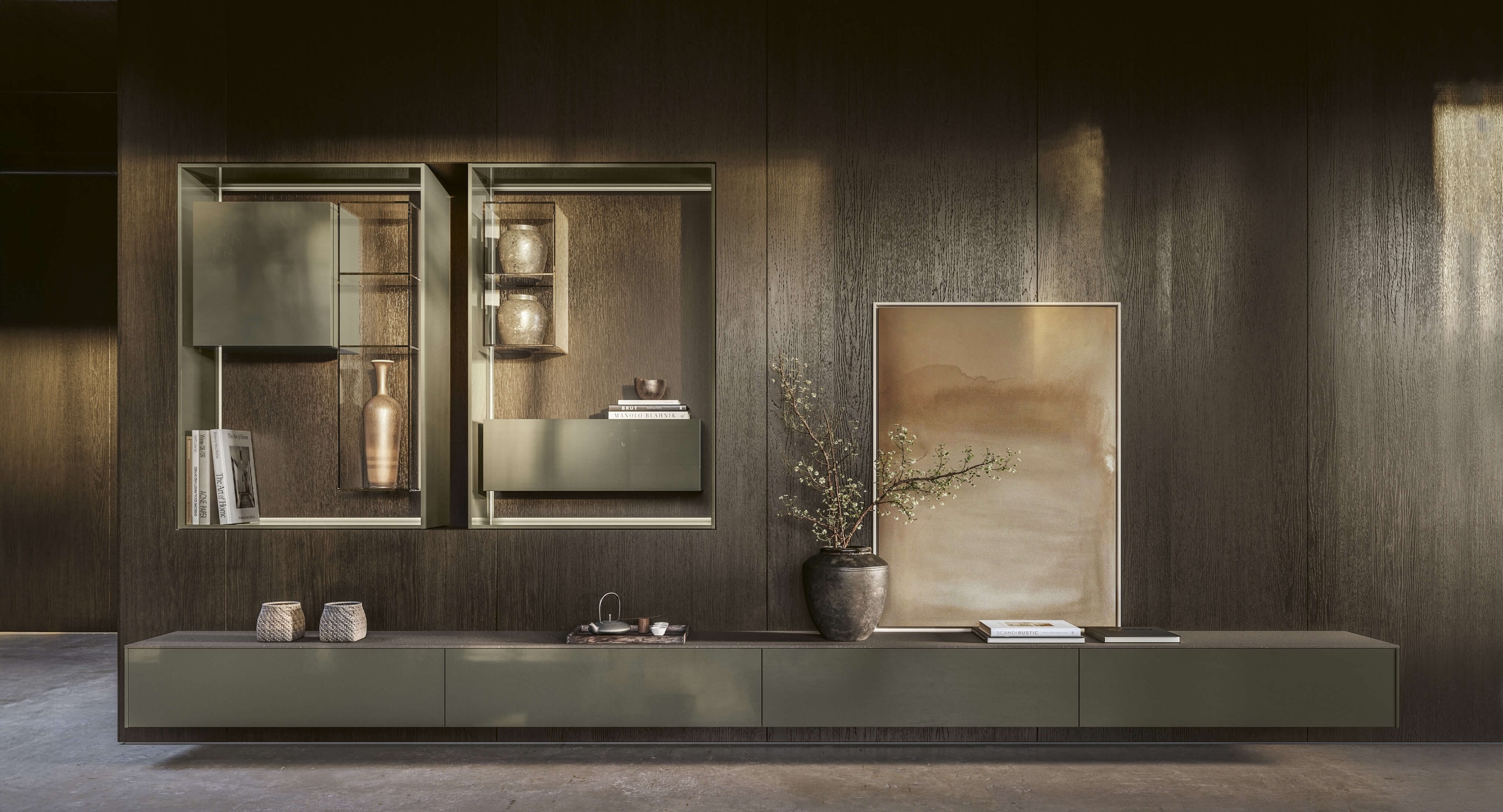LT40 is a versatile modular system offering floor, sideboard, wall-mounted, and panelling configurations. It includes additional elements like double side containers, benches, marble tops, and LED lighting, with customizable options for wood or glass containers.