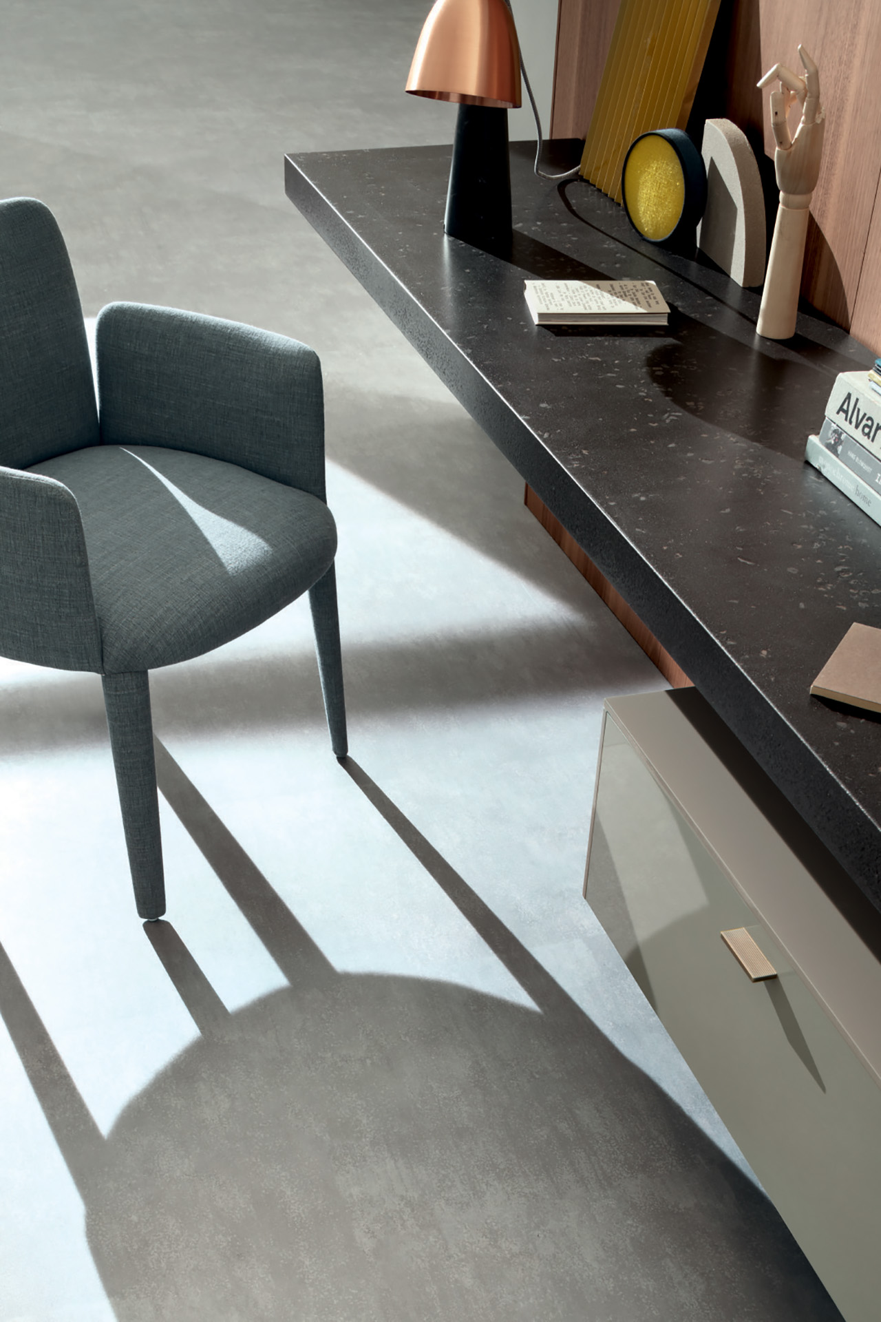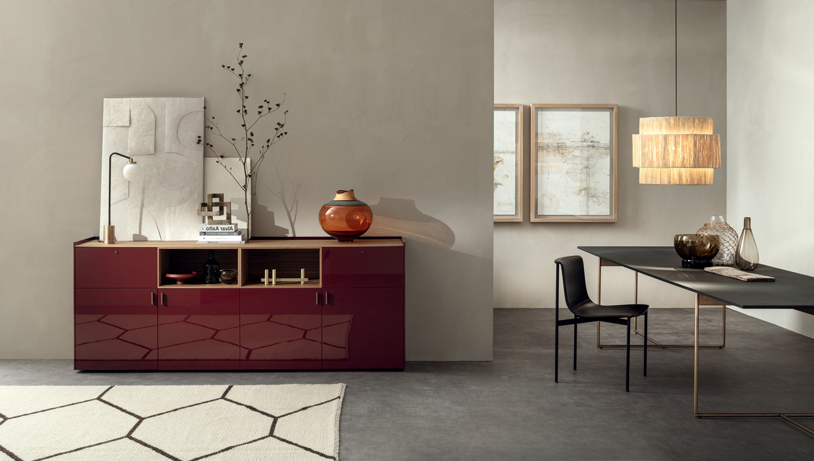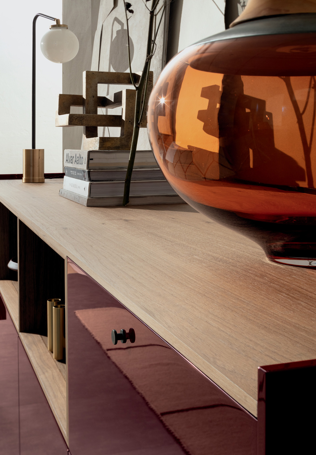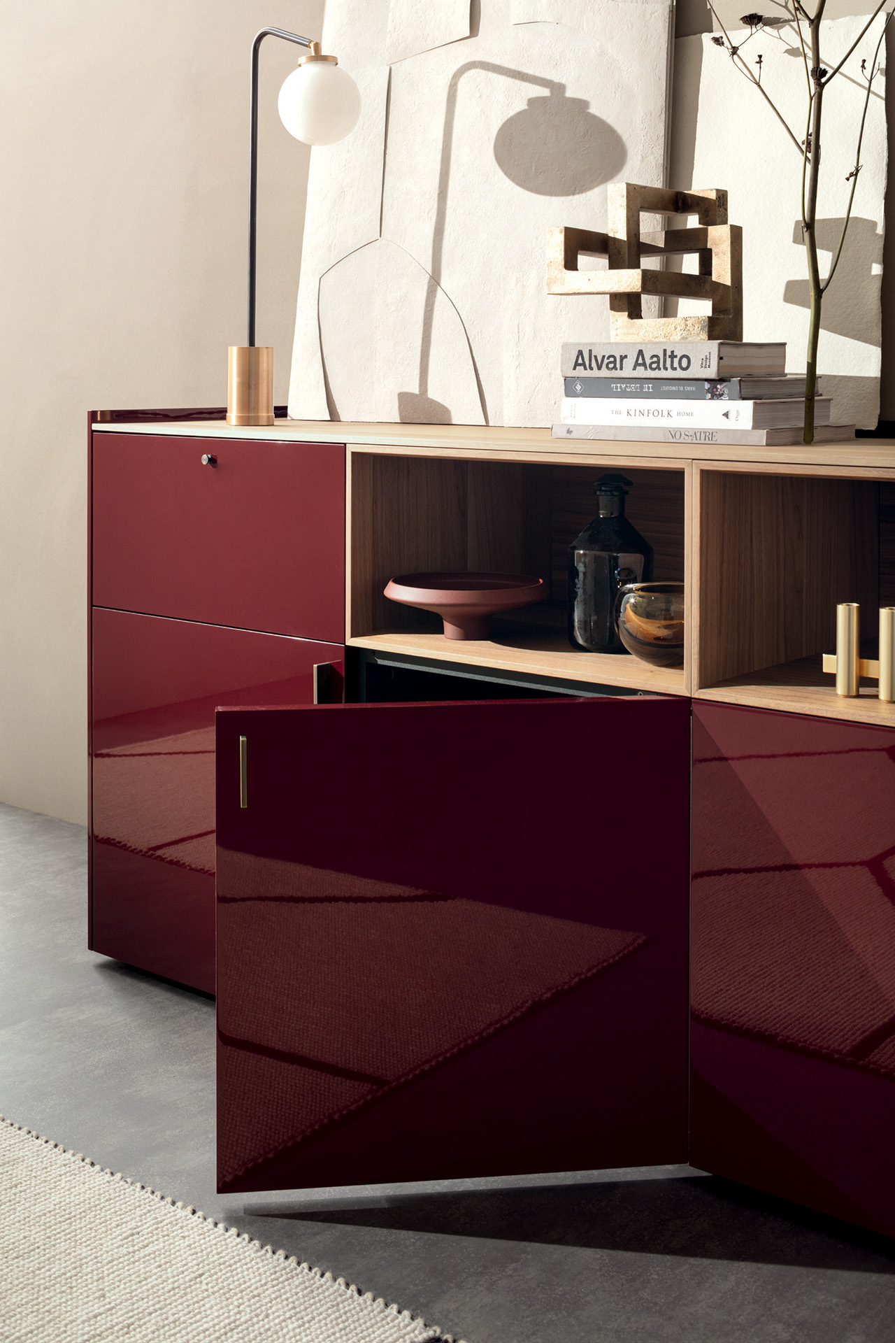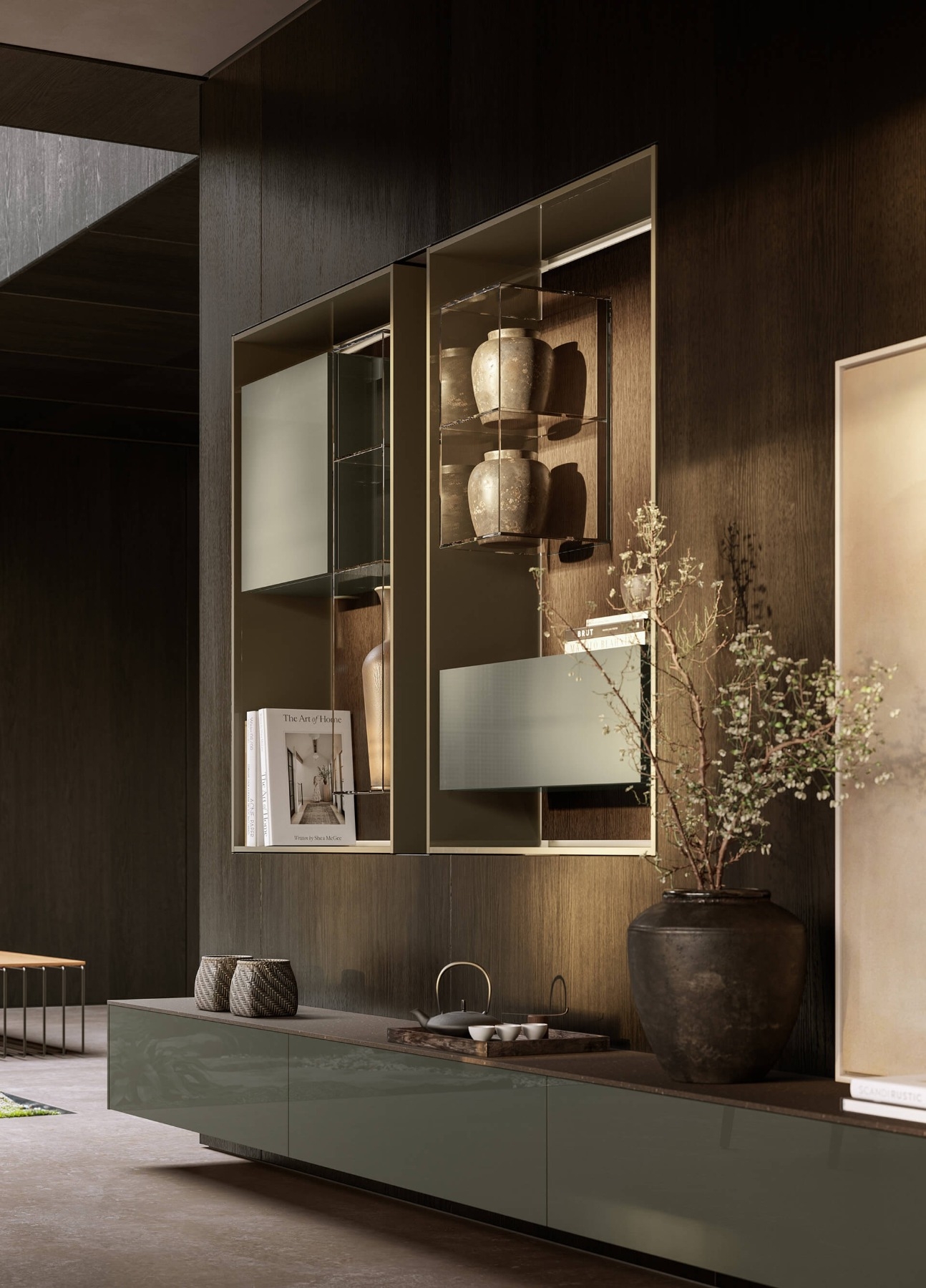 LT40 is a versatile modular system offering floor, sideboard, wall-mounted, and panelling configurations. It includes additional elements like double side containers, benches, marble tops, and LED lighting, with customizable options for wood or glass containers.