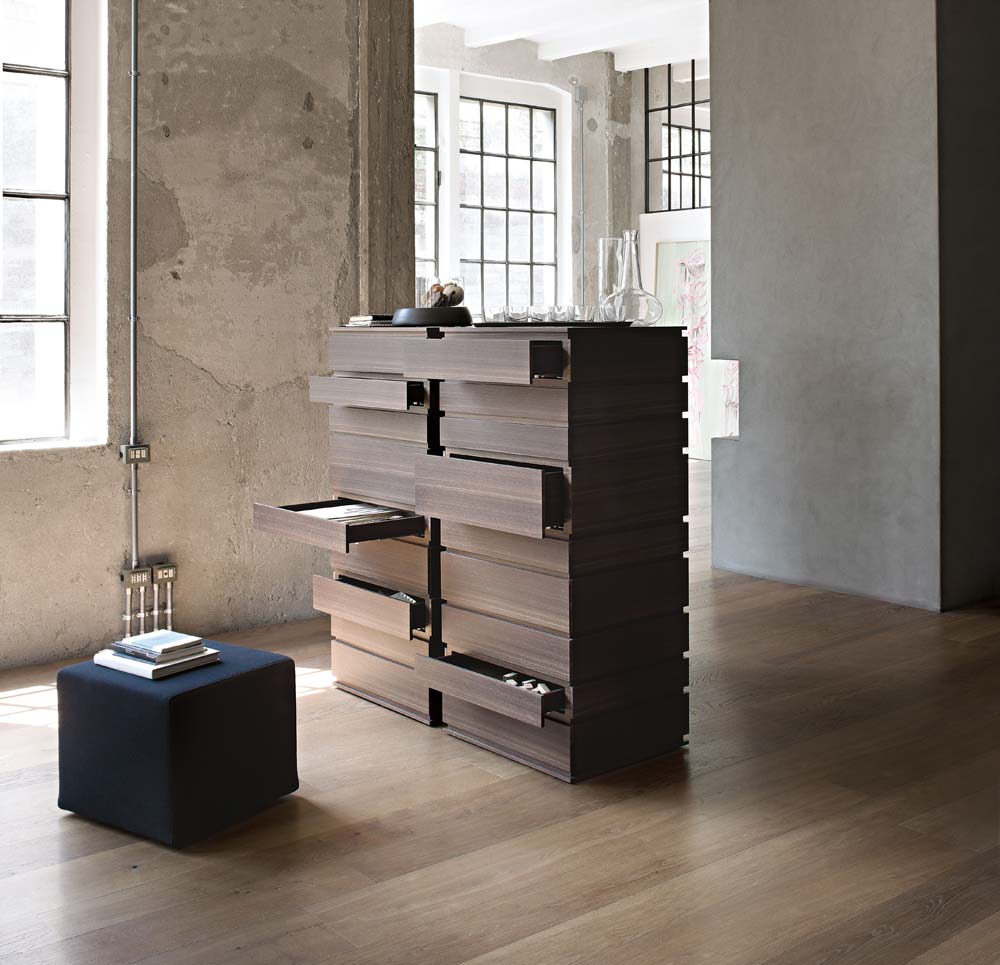 Finished on four sides, the Nine drawer unit can be placed center-room.