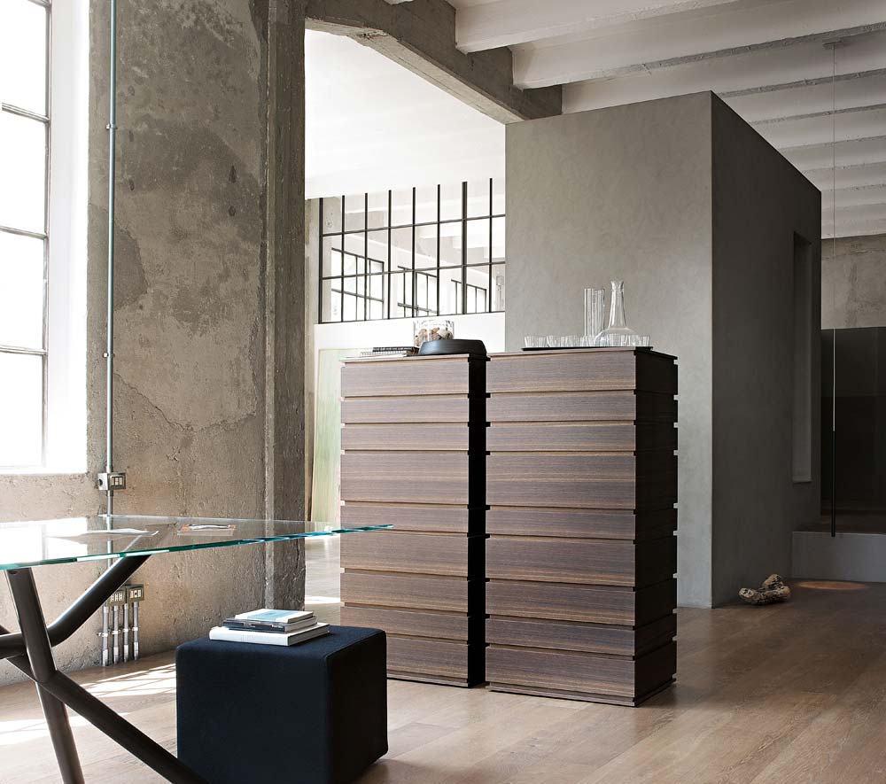 Designed by Alessandro Dubini, the Nine drawer unit consists of a column in thermo-treated oak which forms a visual composition hiding nine drawers of different heights and depths.
