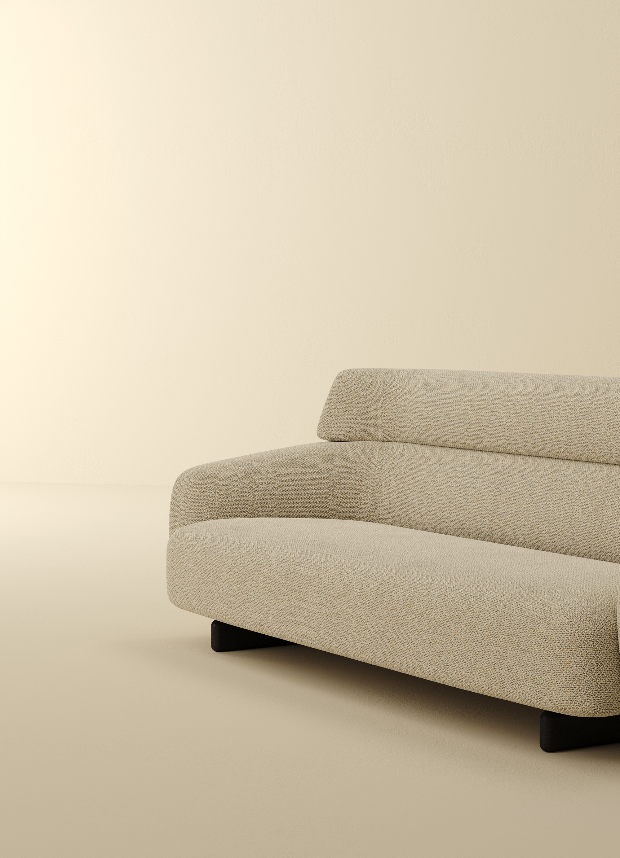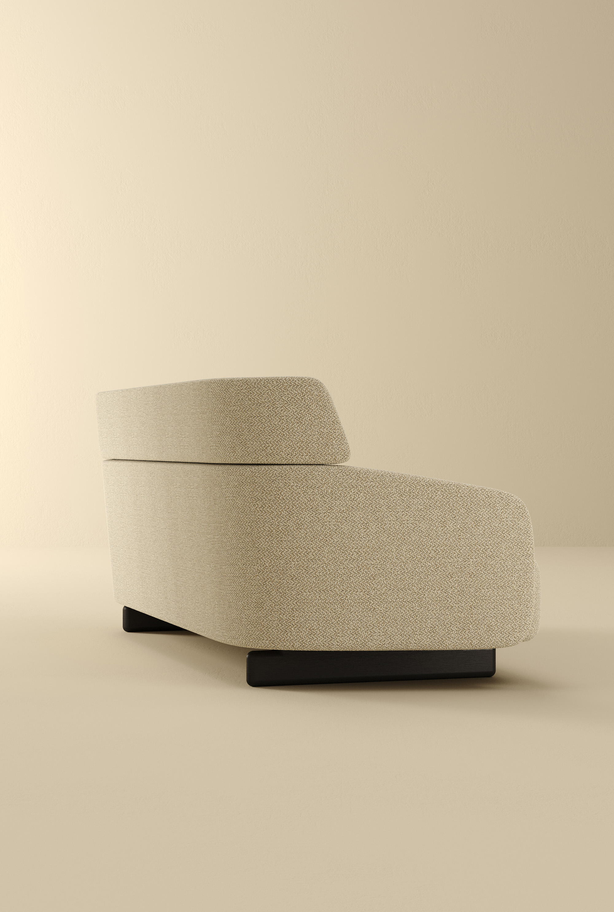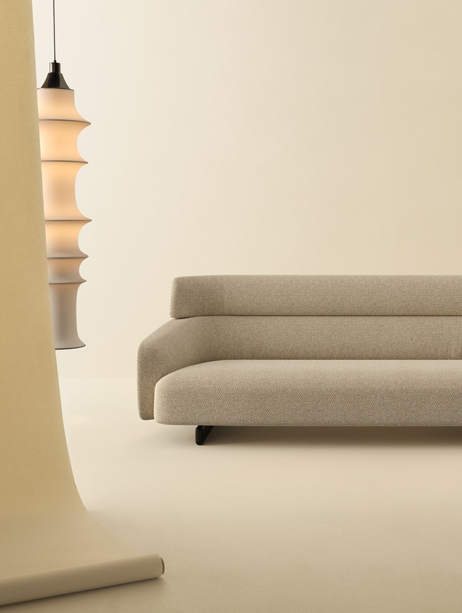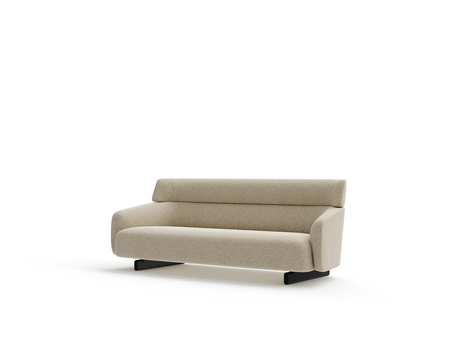 Ares is an unconventional sofa with a majestic presence, thanks to its high, curving backrest that envelops the seat and forms the armrests. Available as a 2- or 3-seater or modular with chaise lounges, it features distinctive feet—long traverses that appear flat from the side—resting on a refined base in thermotreated oak or stained ash. Ares balances firm structure with generous cushions for comfort and style.