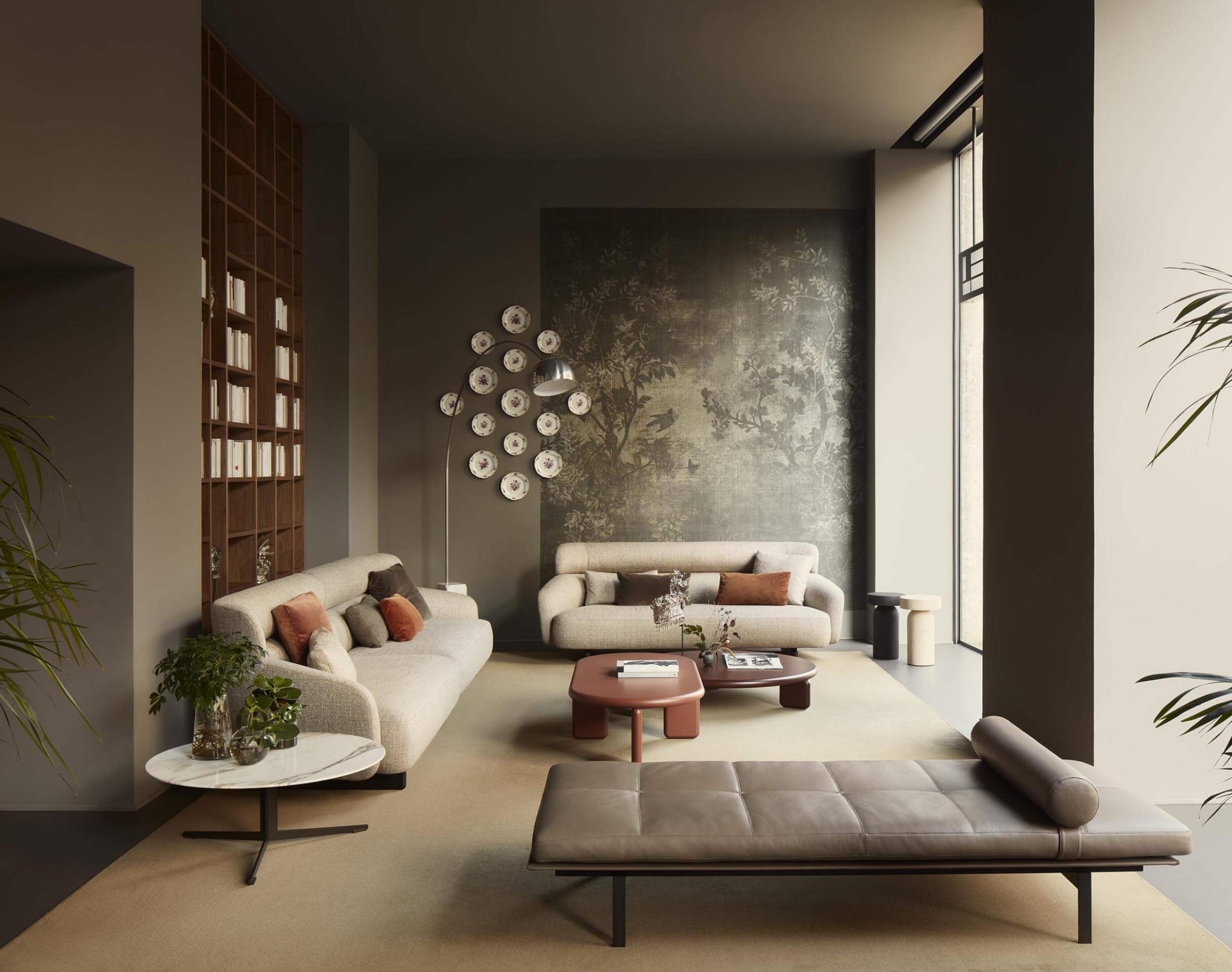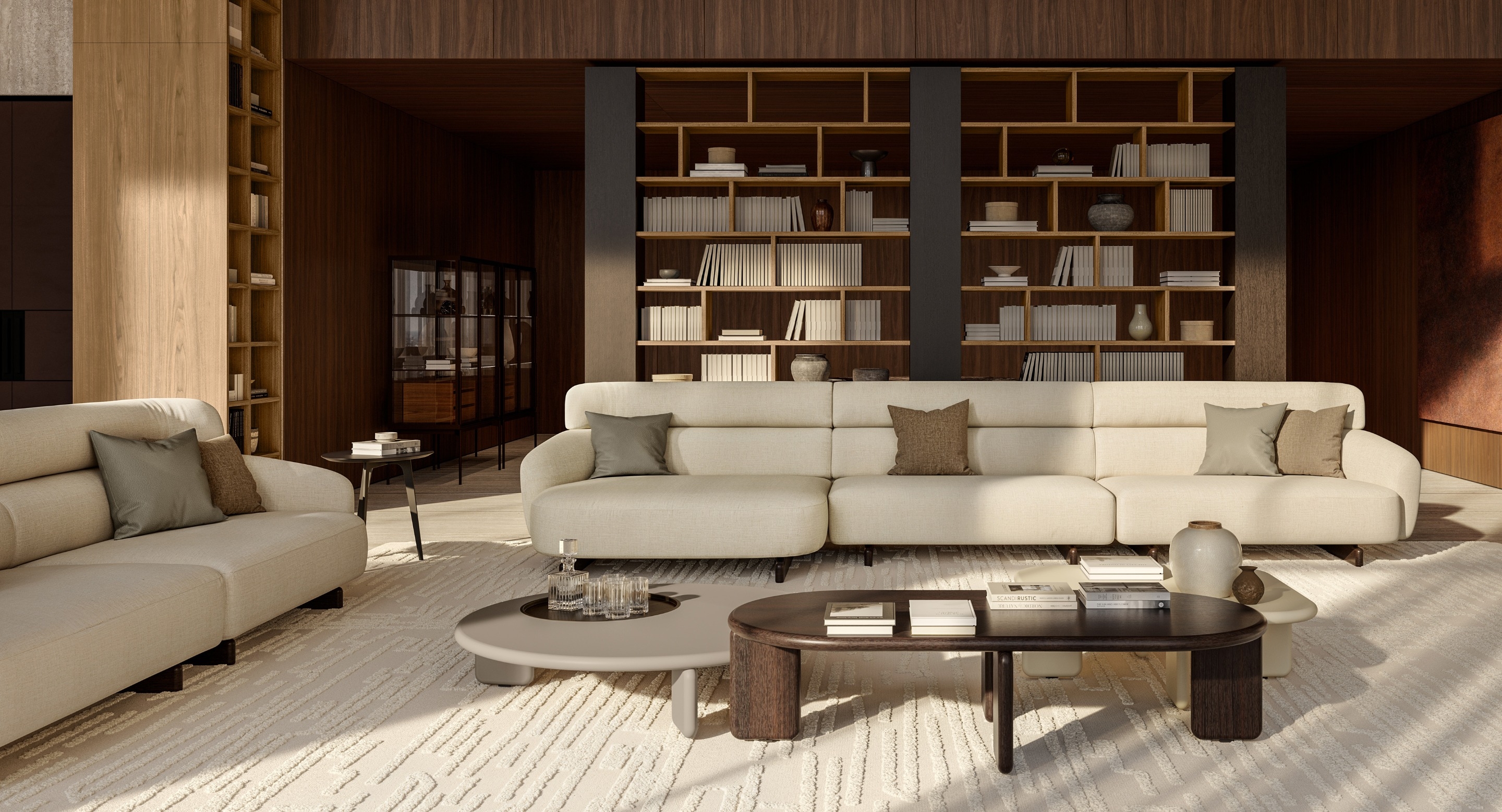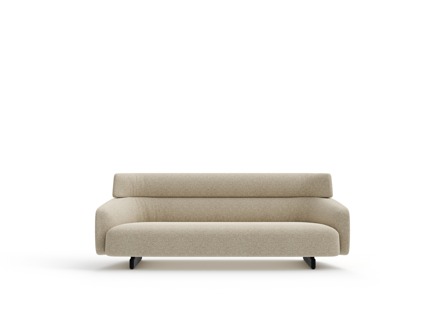 Ares is an unconventional sofa with a majestic presence, thanks to its high, curving backrest that envelops the seat and forms the armrests. Available as a 2- or 3-seater or modular with chaise lounges, it features distinctive feet—long traverses that appear flat from the side—resting on a refined base in thermotreated oak or stained ash. Ares balances firm structure with generous cushions for comfort and style.