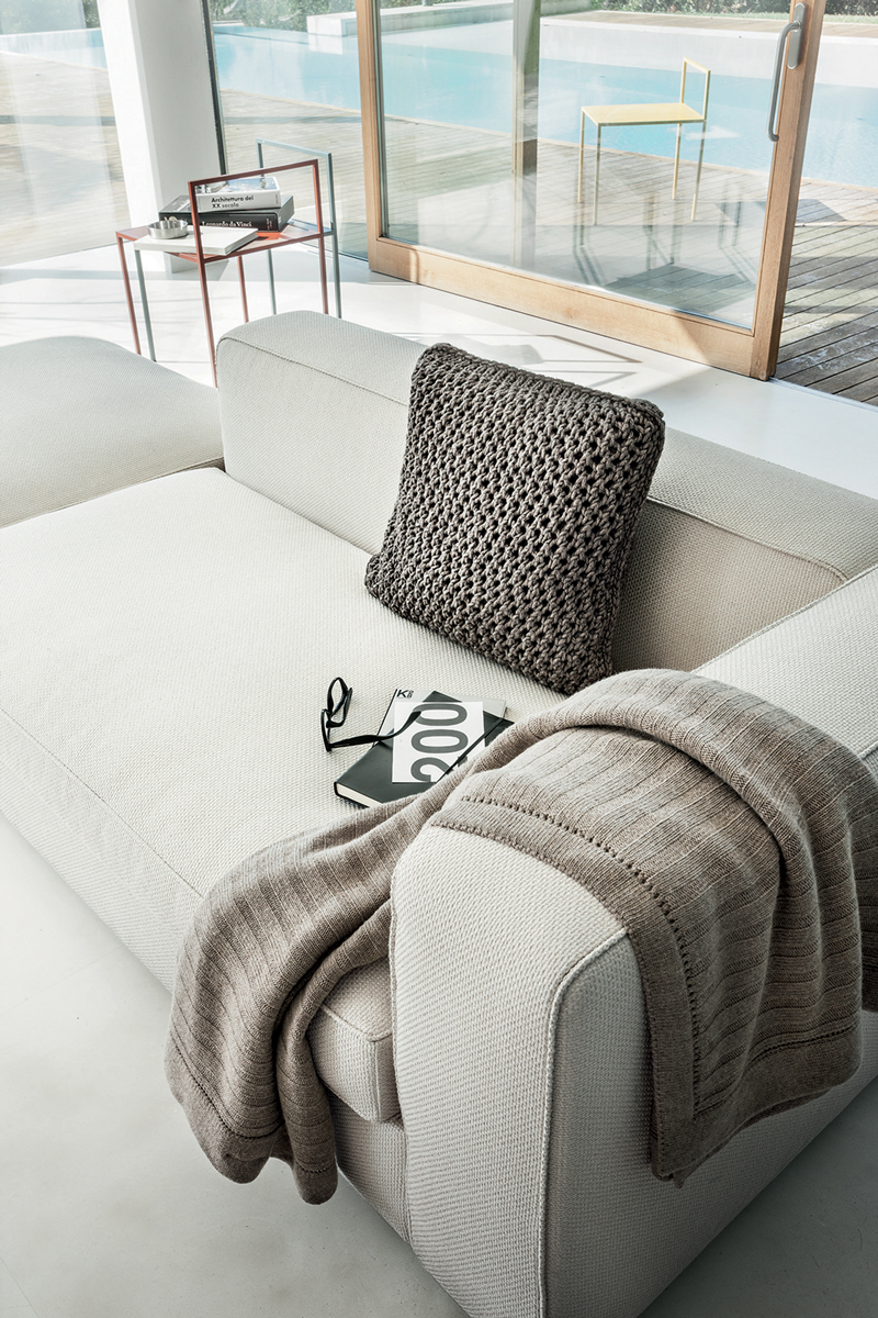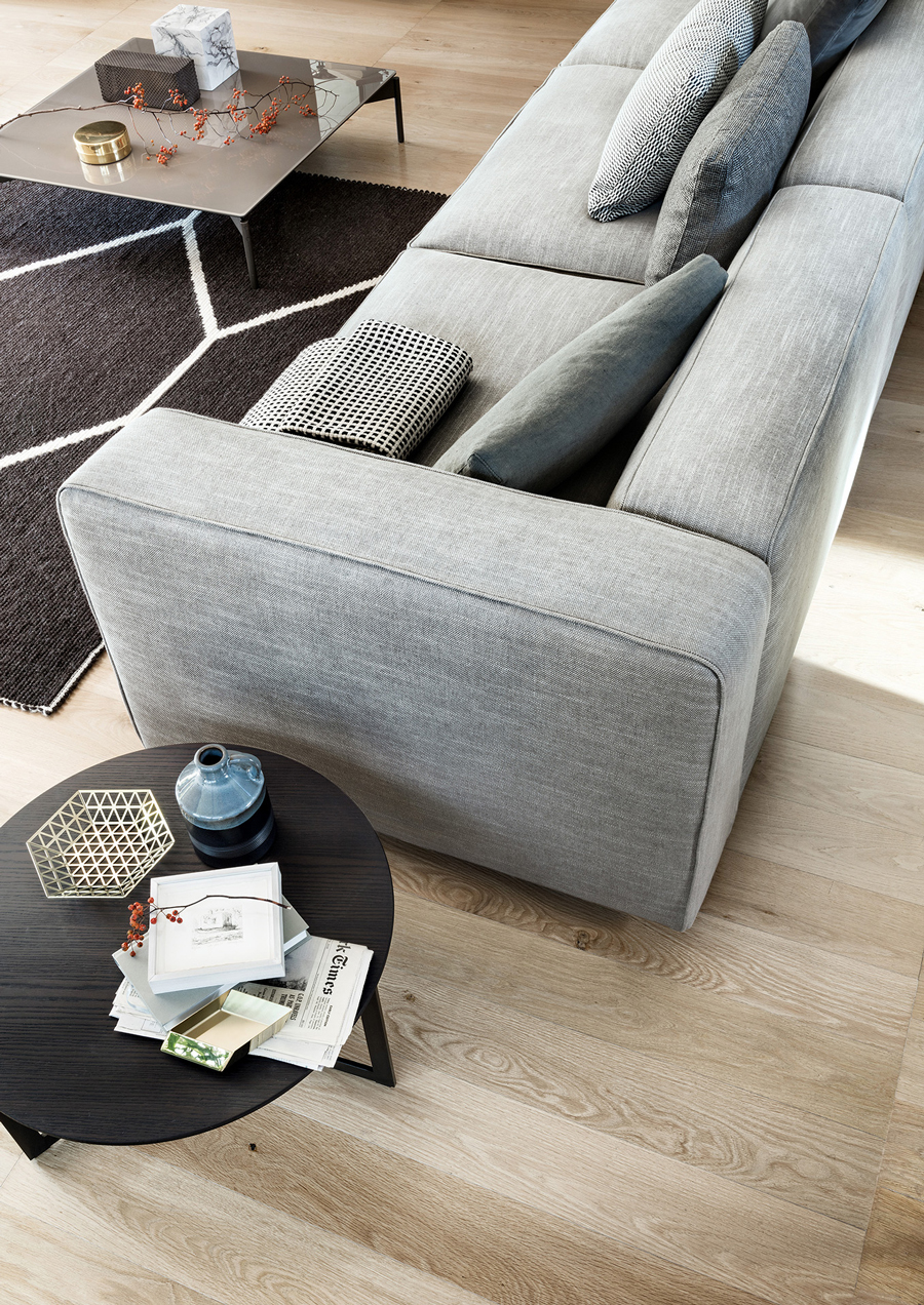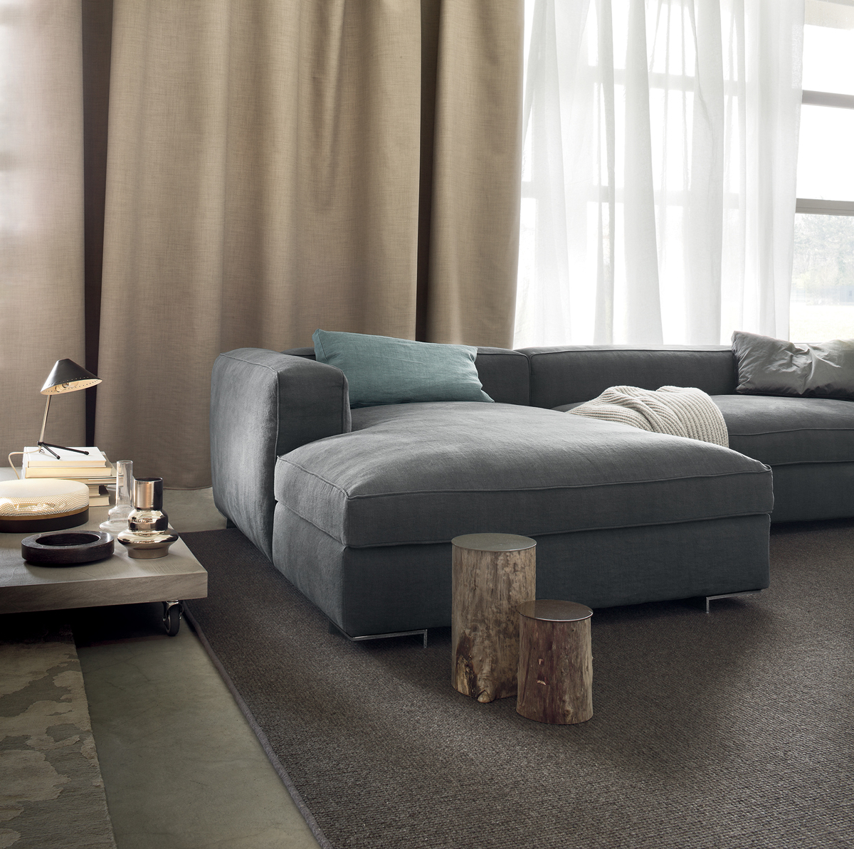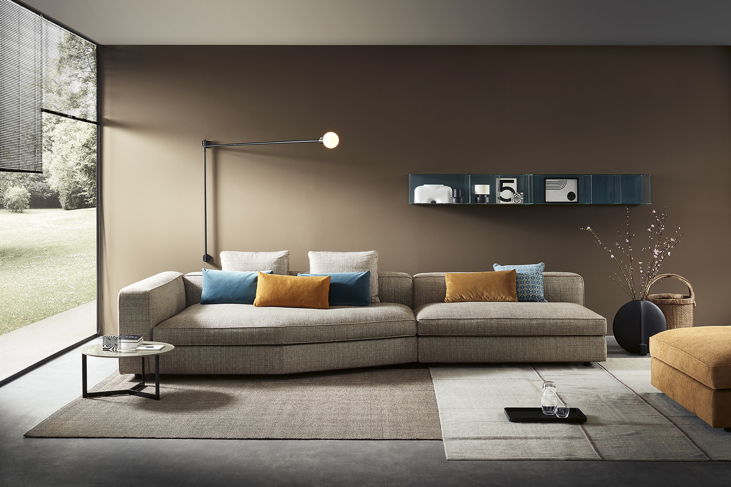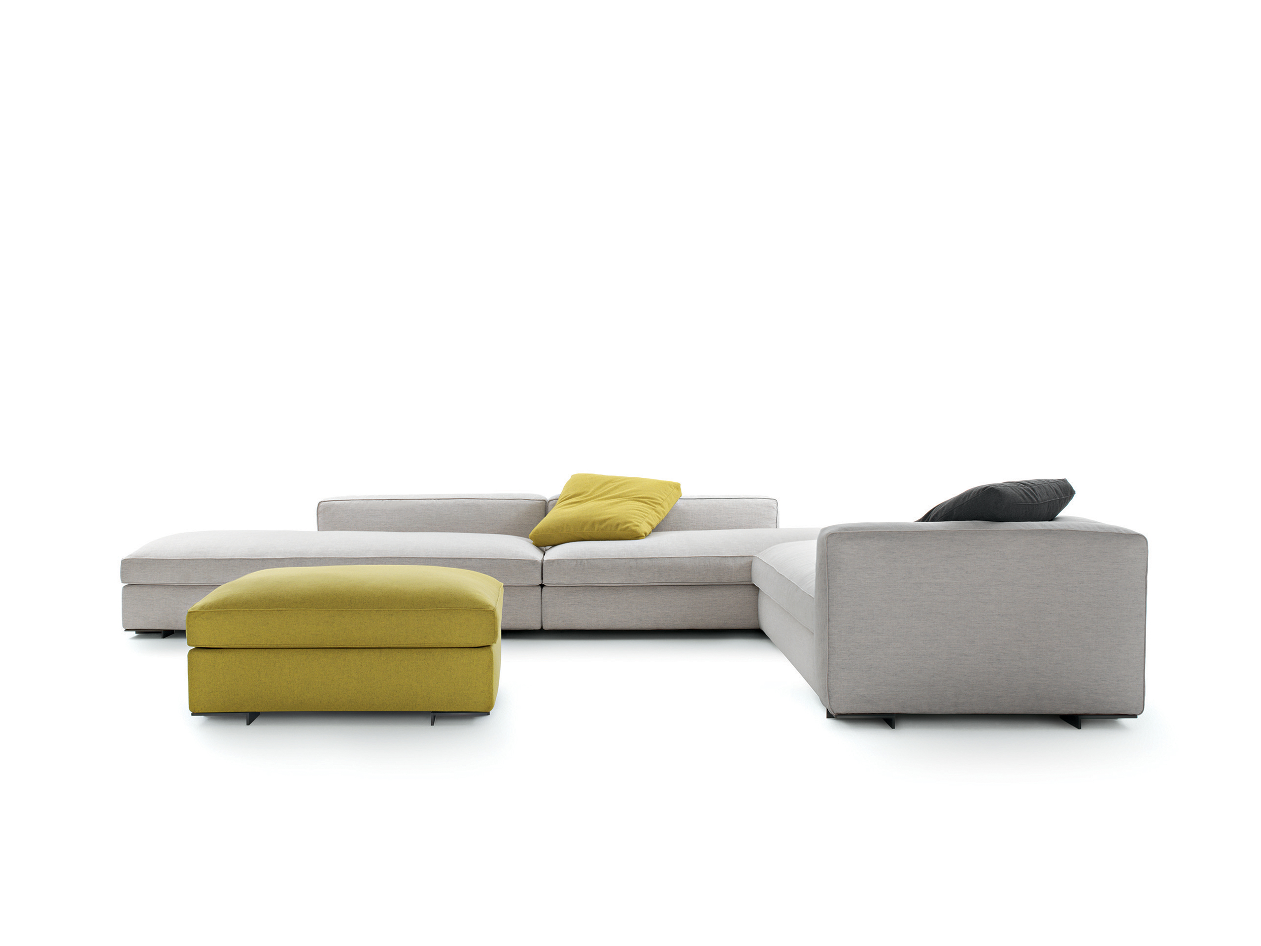 Designed by Francesco Rota, Snap is a floor unit upholstered sofa that is the elective choice for comfort thanks to its back-panel which serves as a cushion. Snap is for strongly customised solutions, to be used in linear or corner composition, with a chaise lounge, a pouf, seats, and terminal/central units. The model stands out for its essential lines, its rigorous shapes, the geometrical matching, the unique elegance and ultra-modern proportions. The structure can either be raised from the floor thanks to the space it provides or leaning on four chromed/burnished metal L-shaped feet that are as wide as the arm.