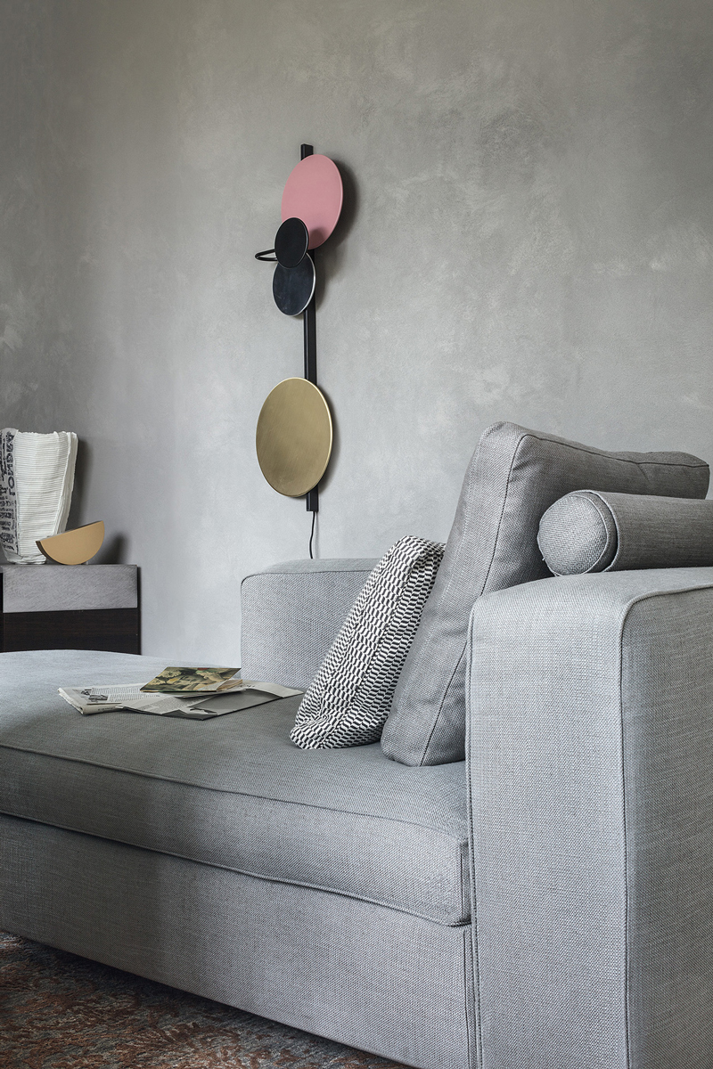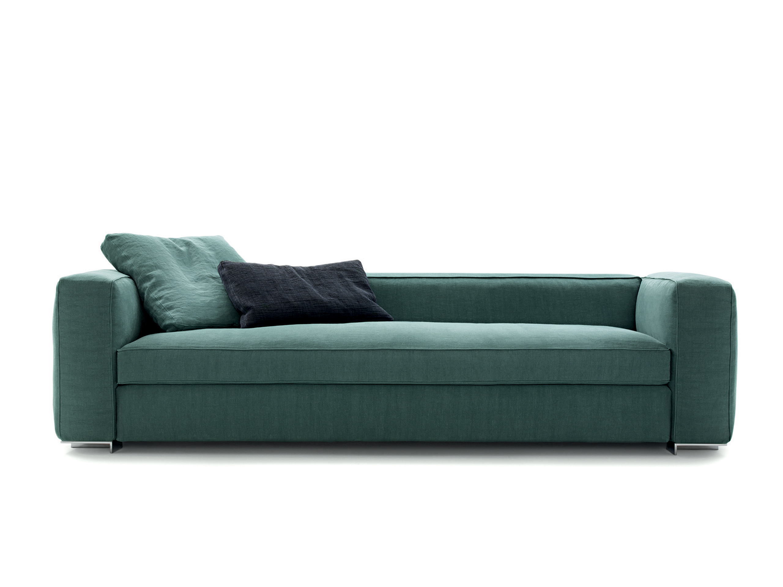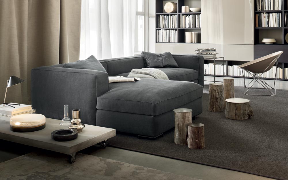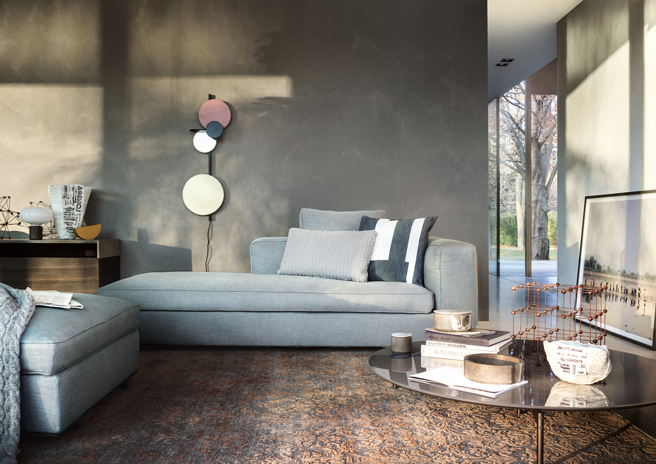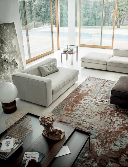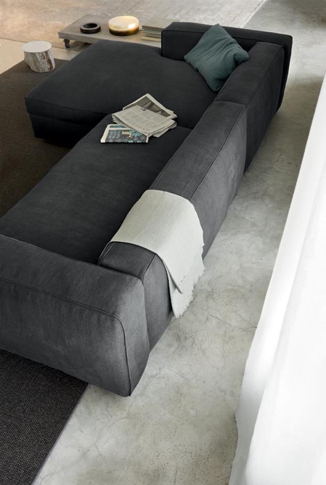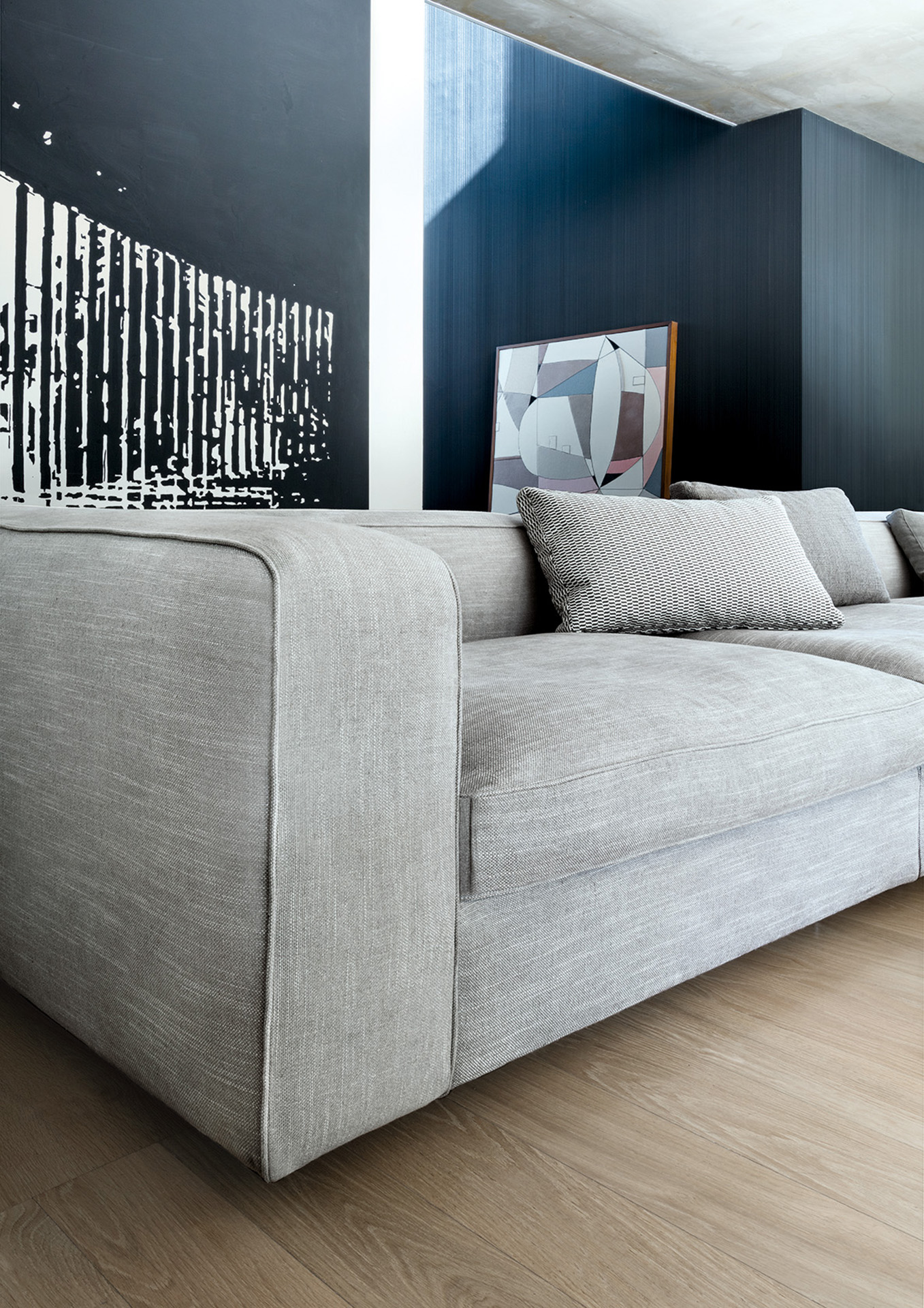 Designed by Francesco Rota, Snap is a floor unit upholstered sofa that is the elective choice for comfort thanks to its back-panel which serves as a cushion. Snap is for strongly customised solutions, to be used in linear or corner composition, with a chaise lounge, a pouf, seats, and terminal/central units. The model stands out for its essential lines, its rigorous shapes, the geometrical matching, the unique elegance and ultra-modern proportions. The structure can either be raised from the floor thanks to the space it provides or leaning on four chromed/burnished metal L-shaped feet that are as wide as the arm.