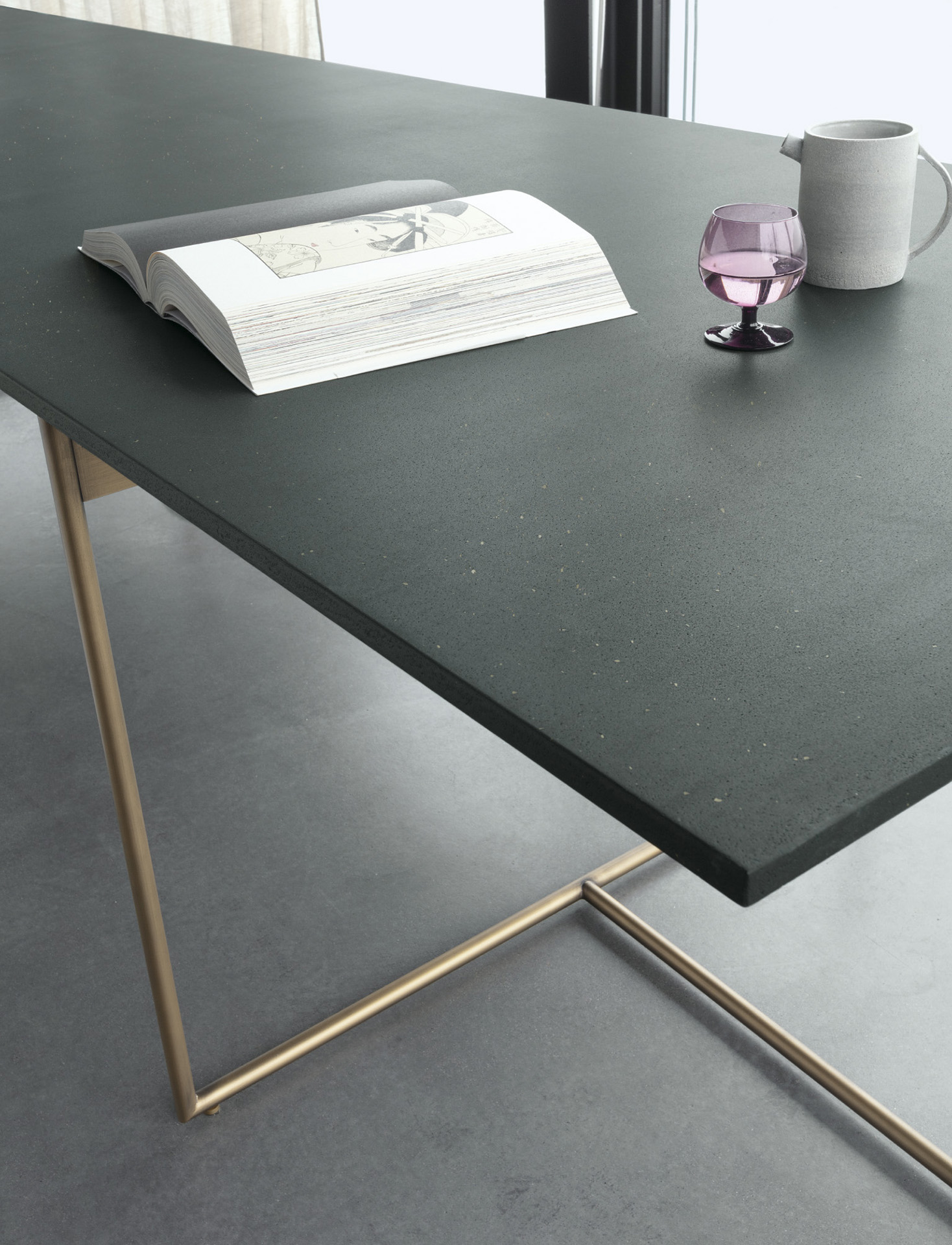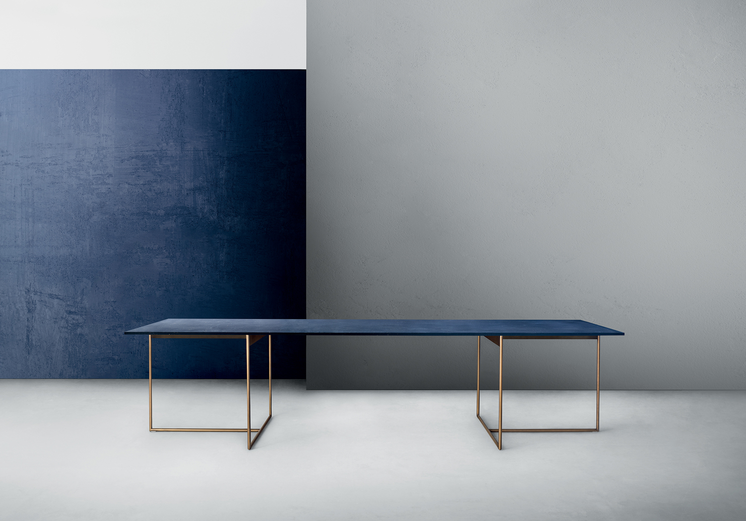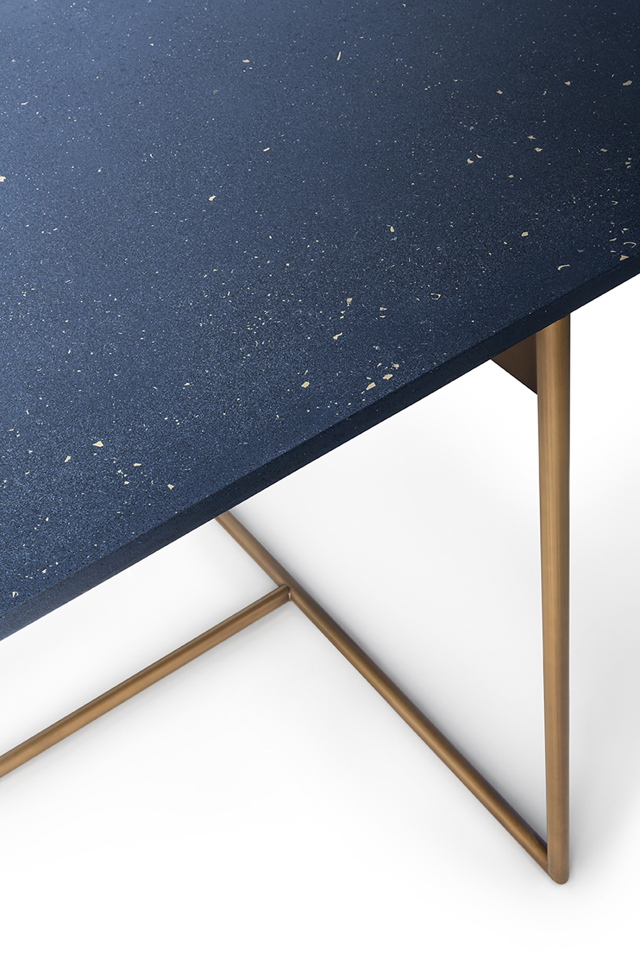 Designed by David Lopez Quincoces, the Alamo table is inspired by the decorative codes of the 40’s when reinterpreted with minimal contemporary style. This table has an art-deco spirit and a magnetic charm for sophisticated and meticulous lines. The designer’s study was focused on the theme of lightness: the elegant structure and the tabletop have essential lines, creating a timeless design object that has been given added appeal by the combination of different materials. The structure is in bronze-coated painted metal while the top presents a brand-new grain-effect top. Made of stratified aluminium, it is characterized by a new and exclusive tactile finish, composed of resin, pigmented marble powder and shavings of precious metals. Proposed in three enticing colour options inspired by natural stone blue Lapislazzuli, green Malachite and black Belgian blue.
